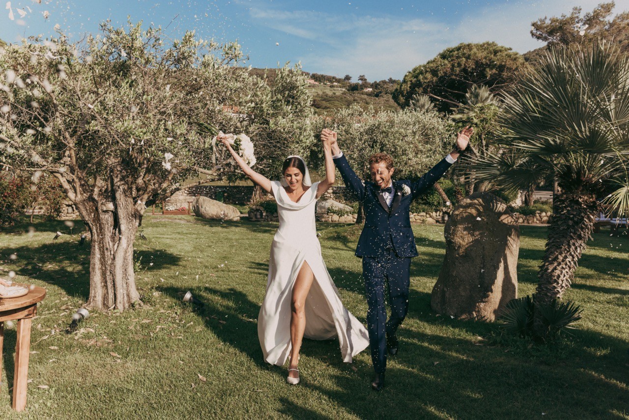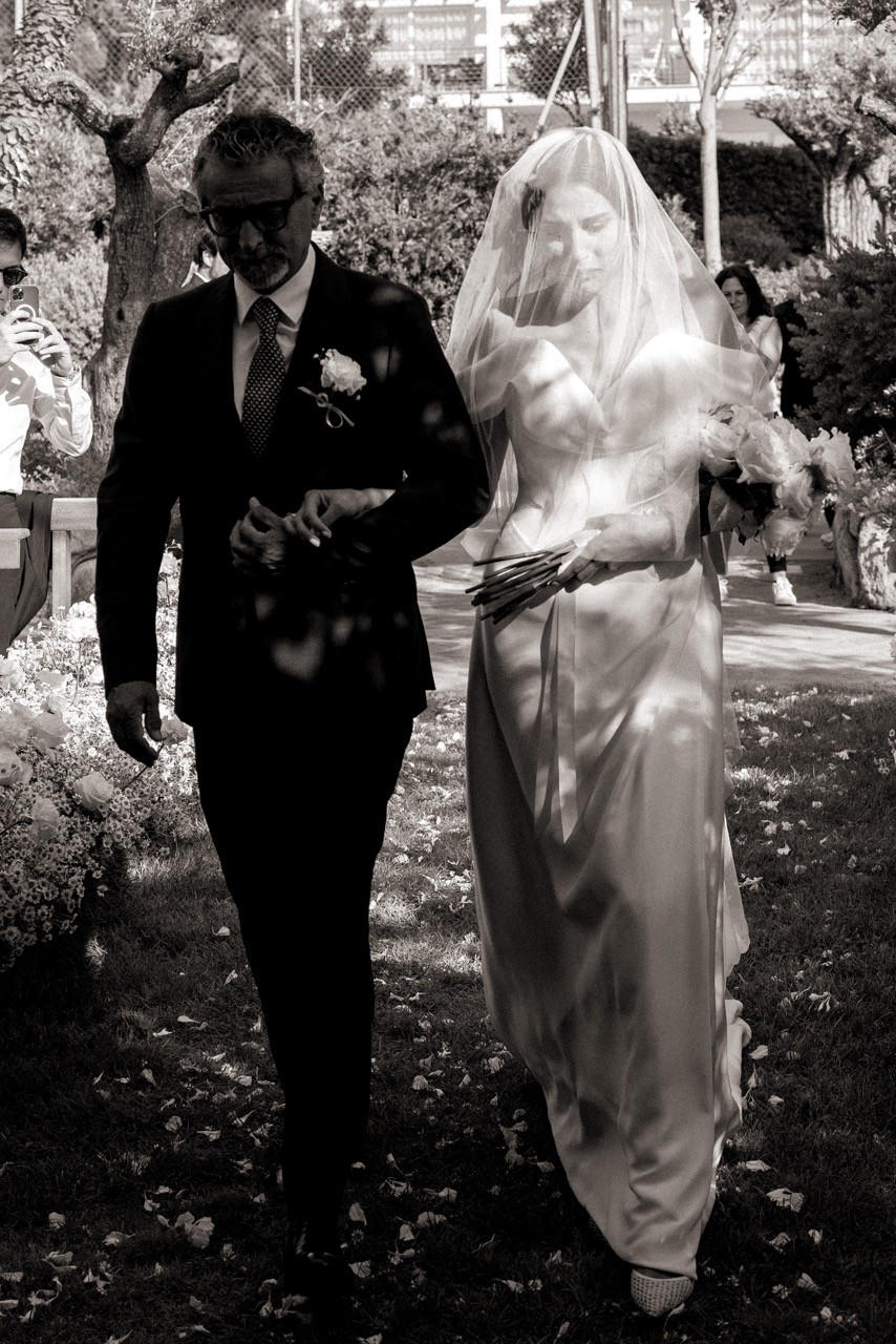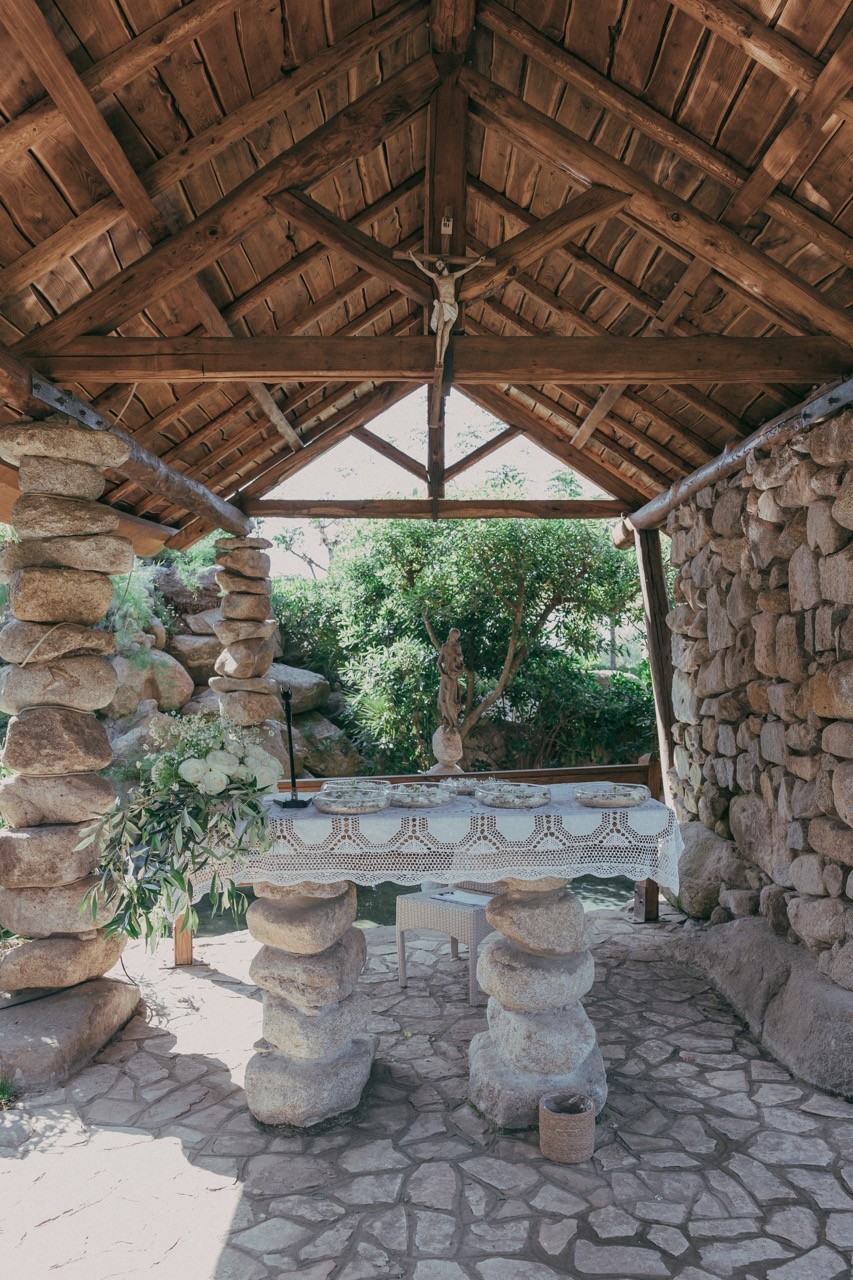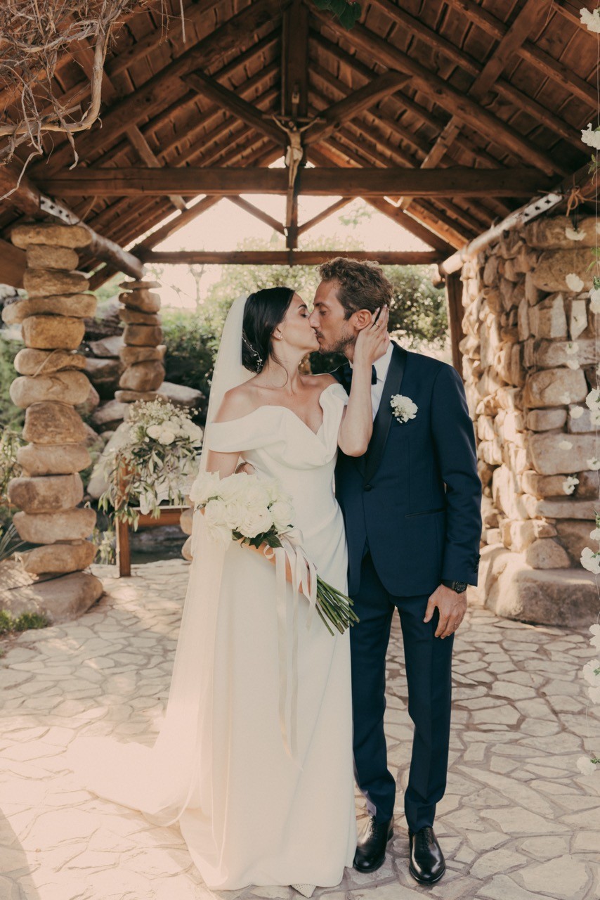 Beatrice e Alberto si incontrano sotto gli ulivi, in una piccola chiesa di sassi chiari, essenziale e raccolta, quasi nascosta tra il verde, circondati da chi li ama. Il sole accarezza il velo, le fronde li incorniciano con leggerezza, la pietra trattiene il calore del giorno. Poi la gioia dopo il sì, tra chicchi di riso e petali sospesi nell'aria.