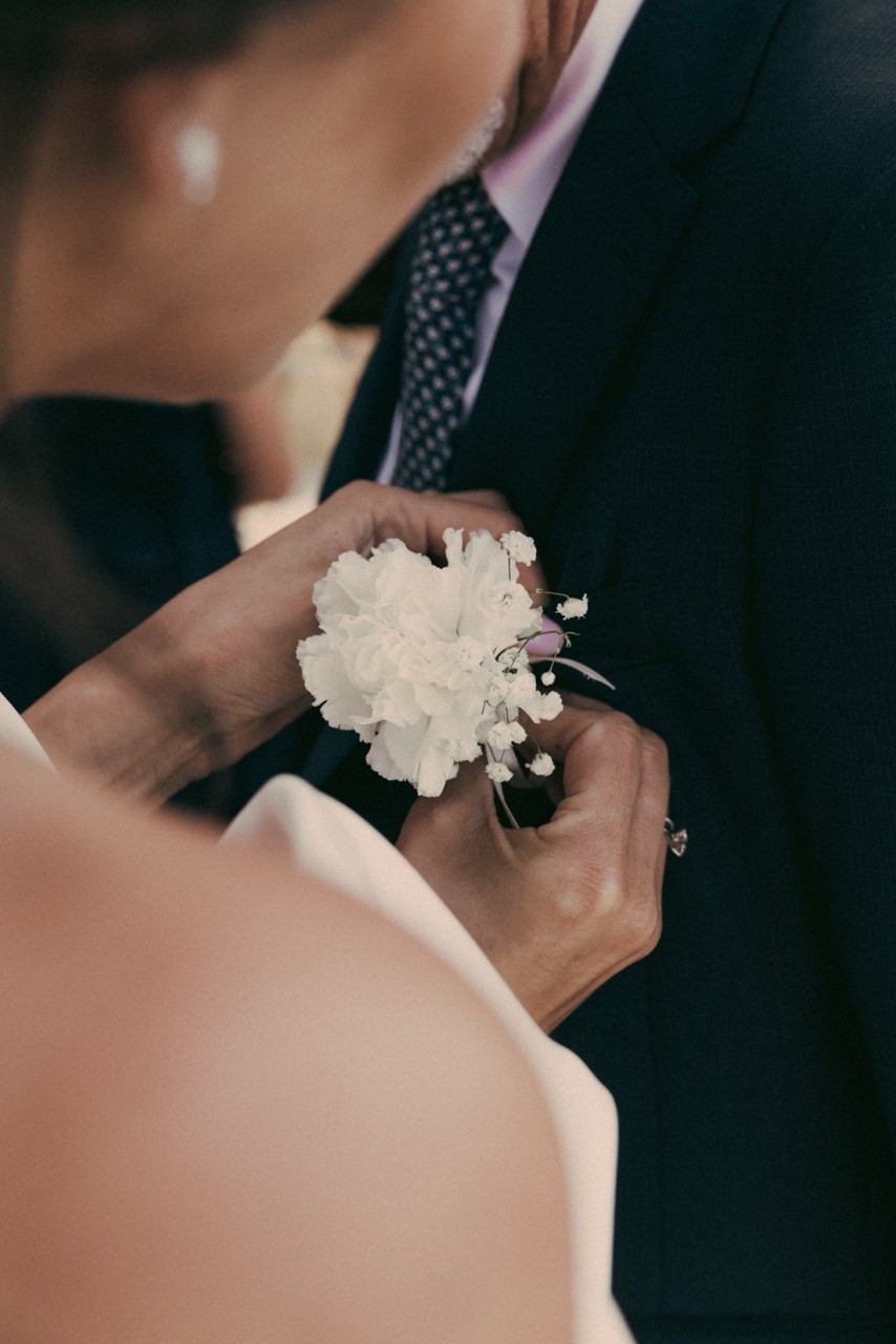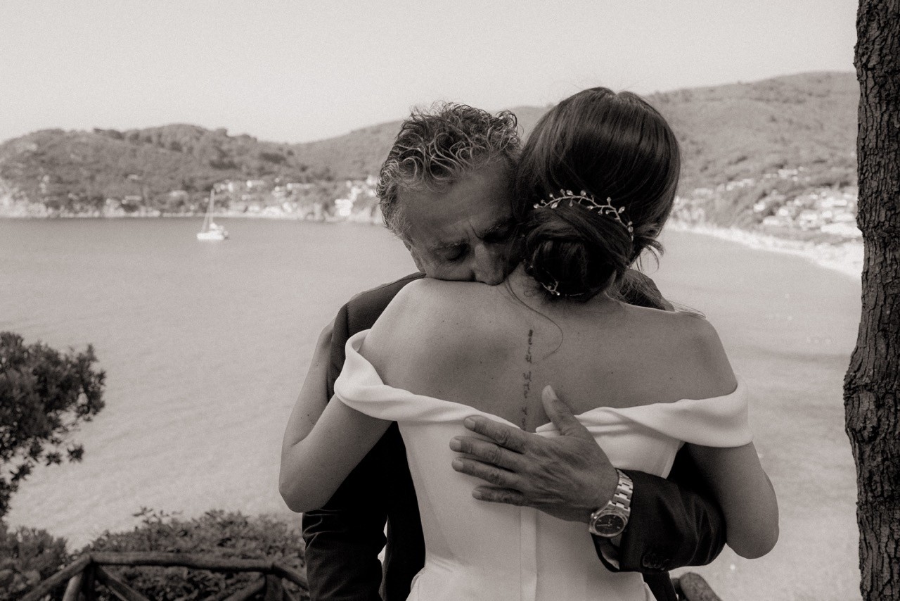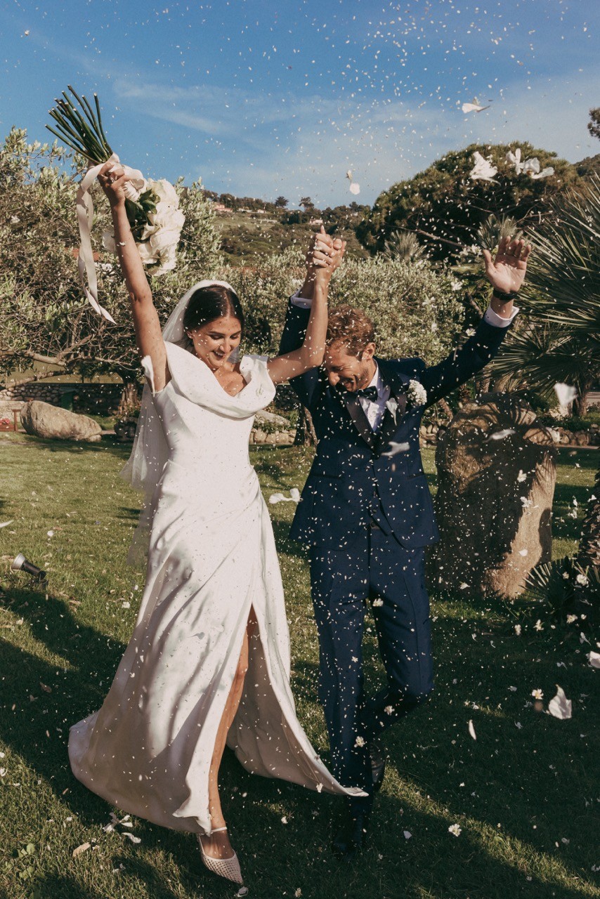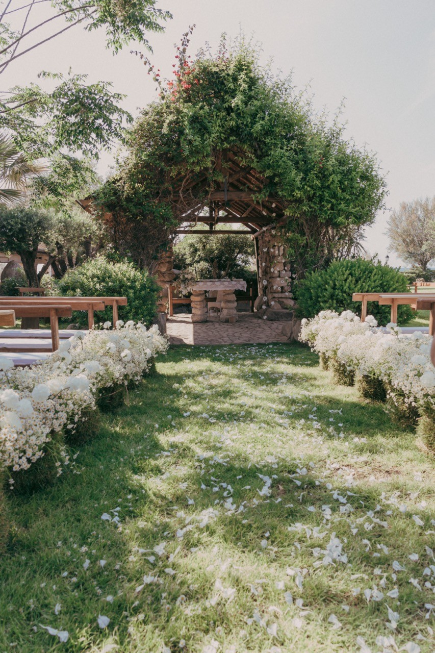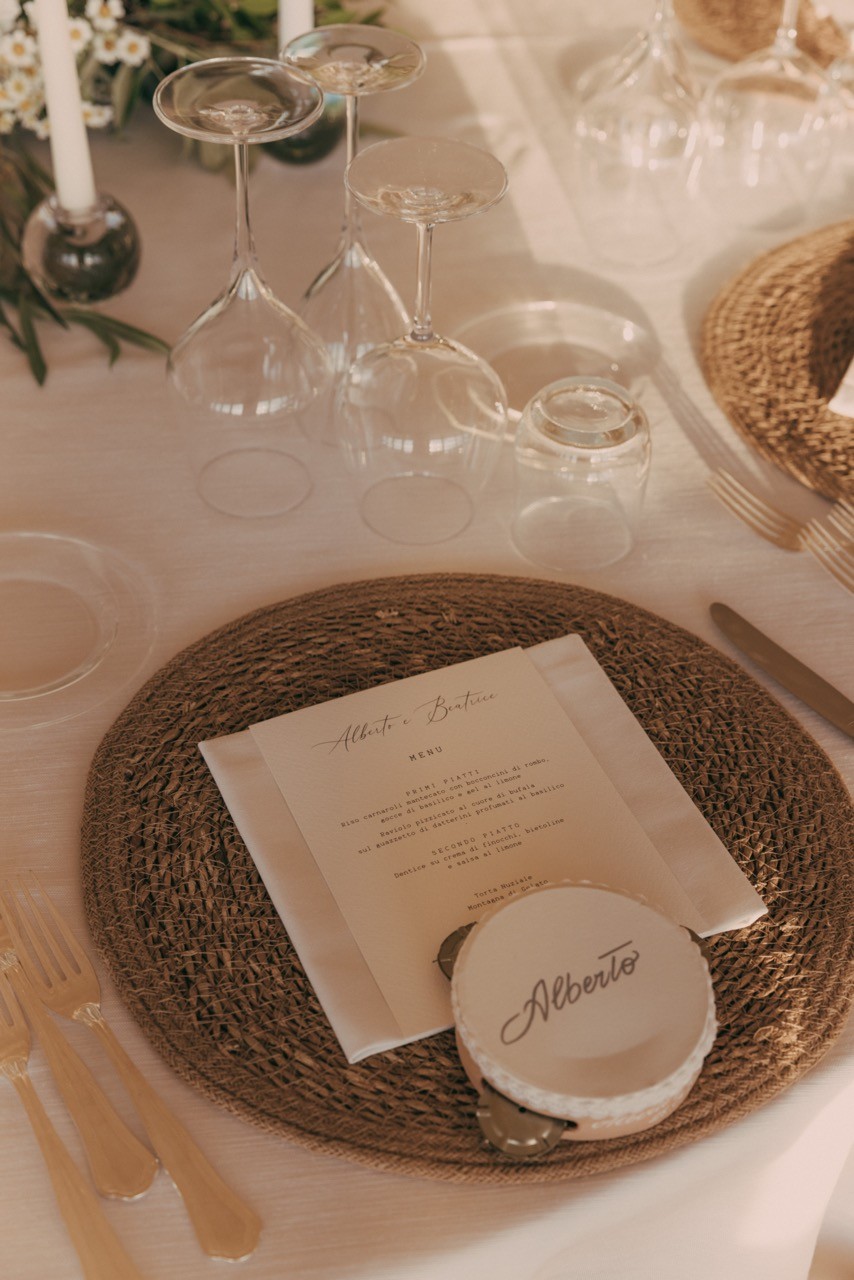 Beatrice e Alberto si incontrano sotto gli ulivi, in una piccola chiesa di sassi chiari, essenziale e raccolta, quasi nascosta tra il verde, circondati da chi li ama. Il sole accarezza il velo, le fronde li incorniciano con leggerezza, la pietra trattiene il calore del giorno. Poi la gioia dopo il sì, tra chicchi di riso e petali sospesi nell'aria.