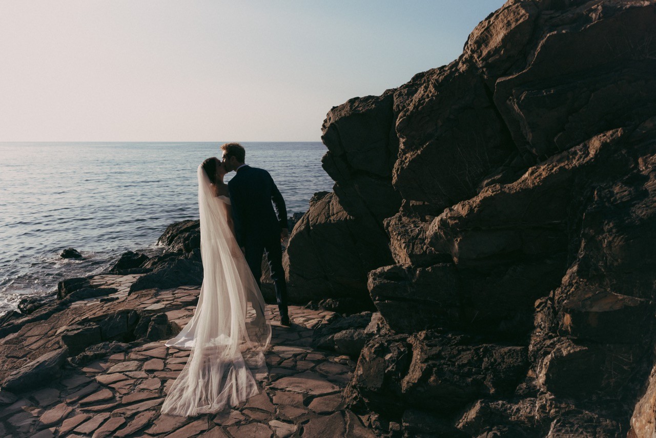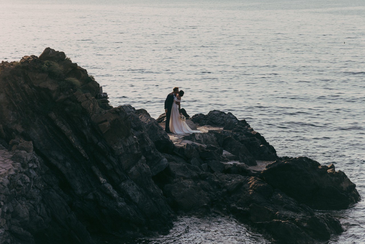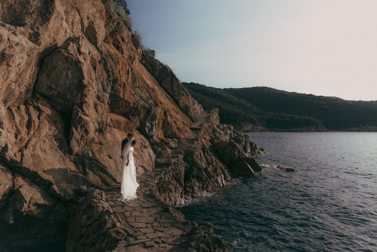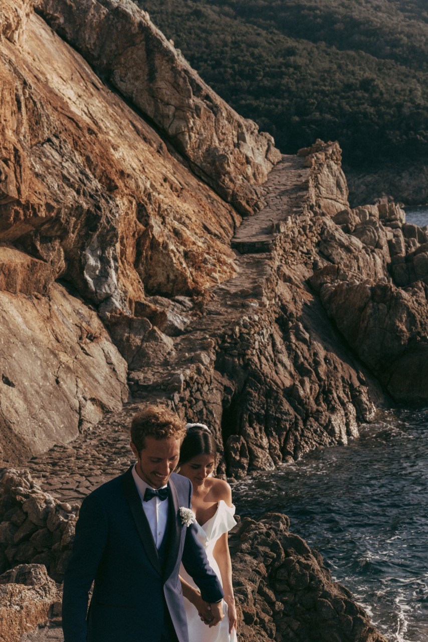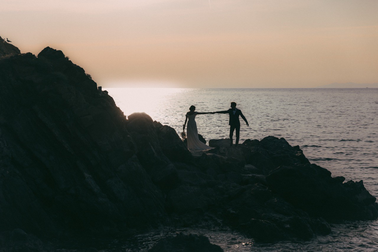 Più tardi, sugli scogli, il tempo cambia ritmo. Camminano lungo la roccia come su un confine sottile, mentre il sole scende e accende le onde di riflessi dorati; gli sguardi che si incontrano, le mani che si intrecciano. Il controluce disegna i profili, il mare respira accanto a loro.