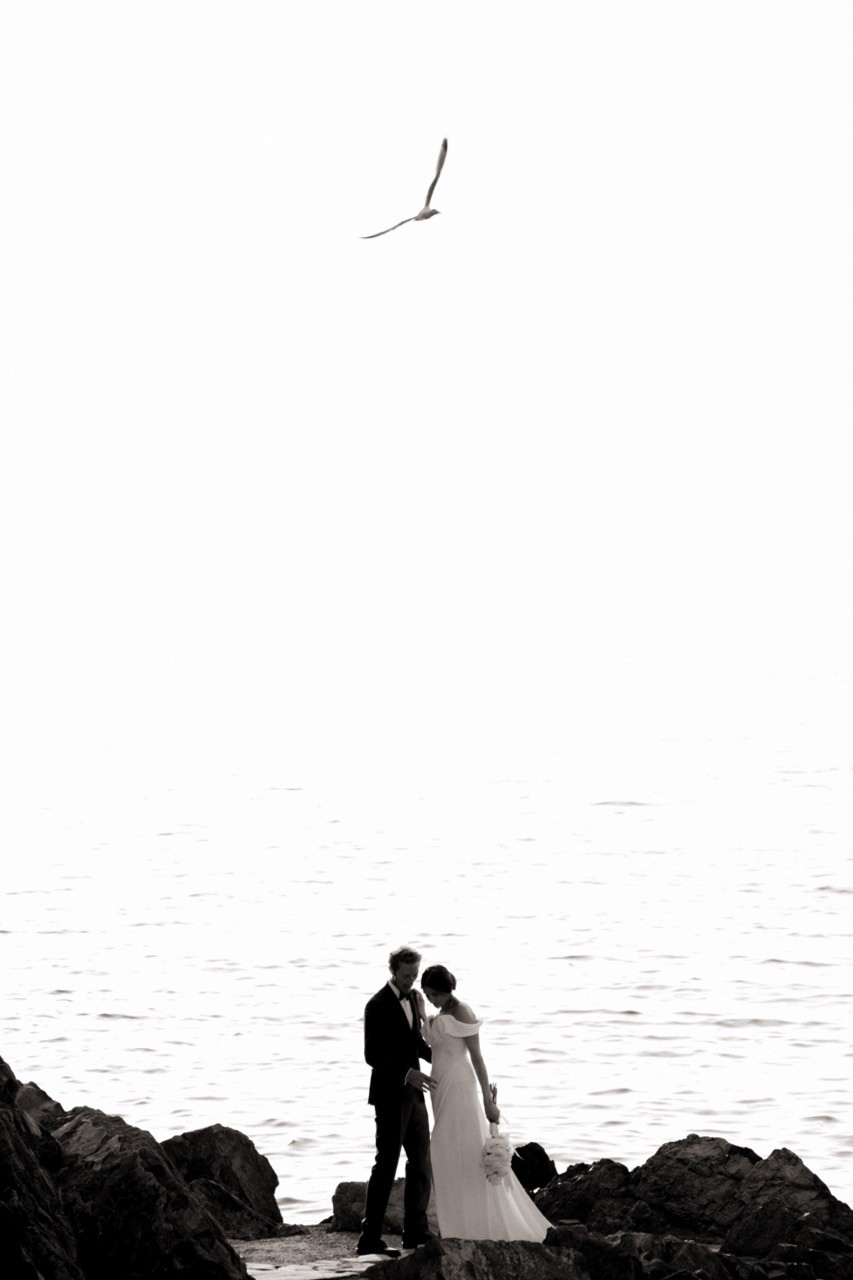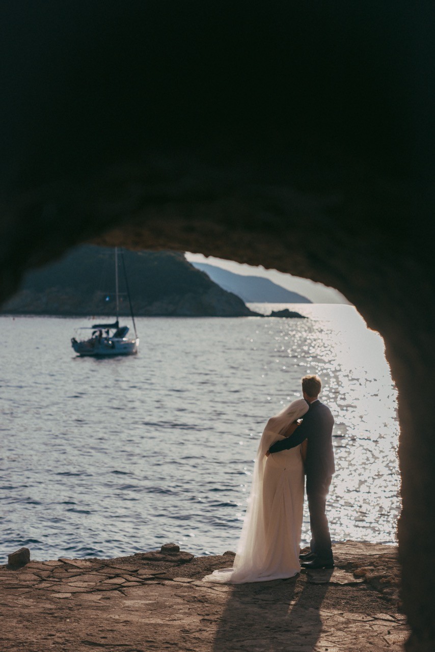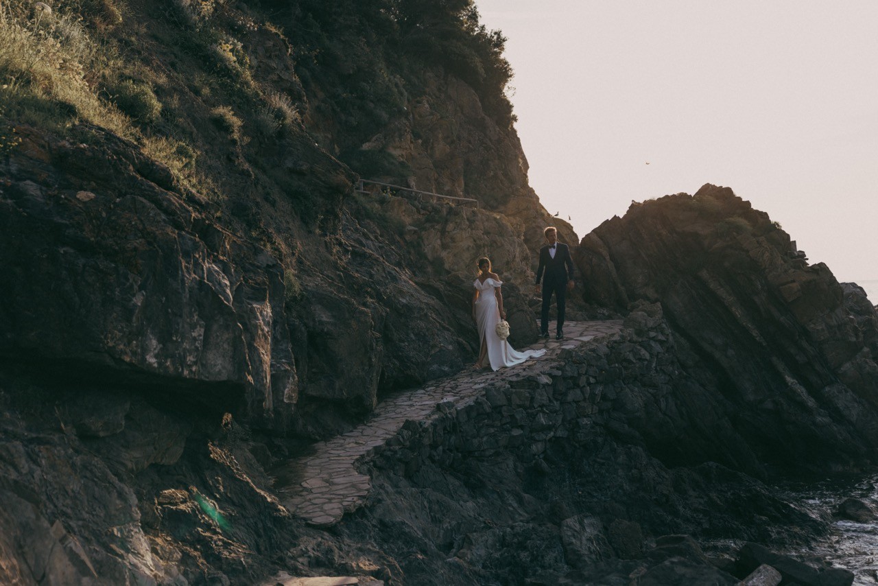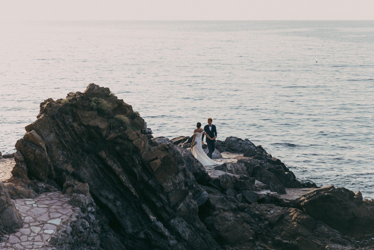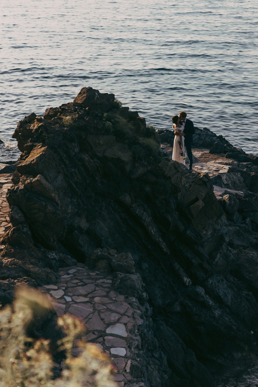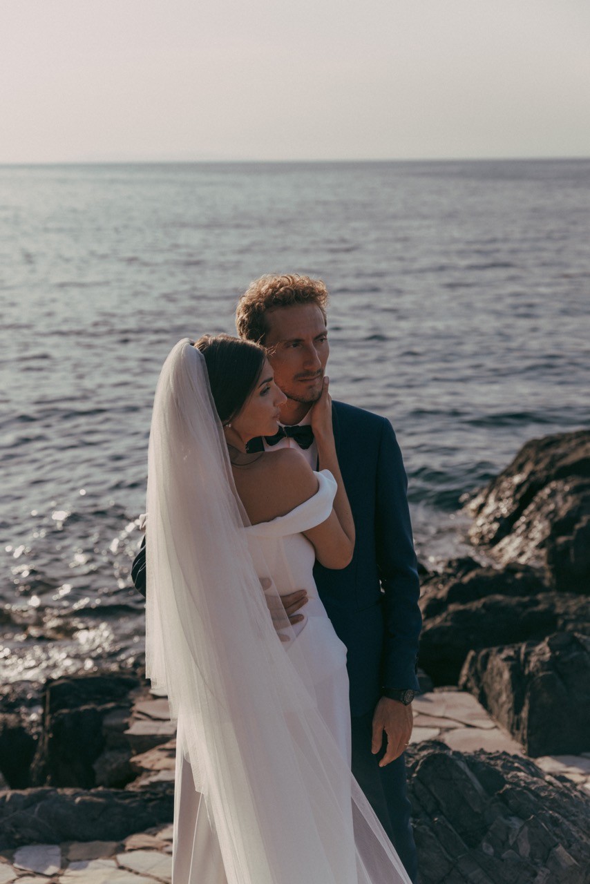 Più tardi, sugli scogli, il tempo cambia ritmo. Camminano lungo la roccia come su un confine sottile, mentre il sole scende e accende le onde di riflessi dorati; gli sguardi che si incontrano, le mani che si intrecciano. Il controluce disegna i profili, il mare respira accanto a loro.