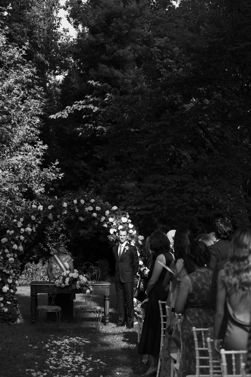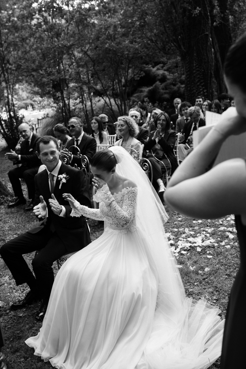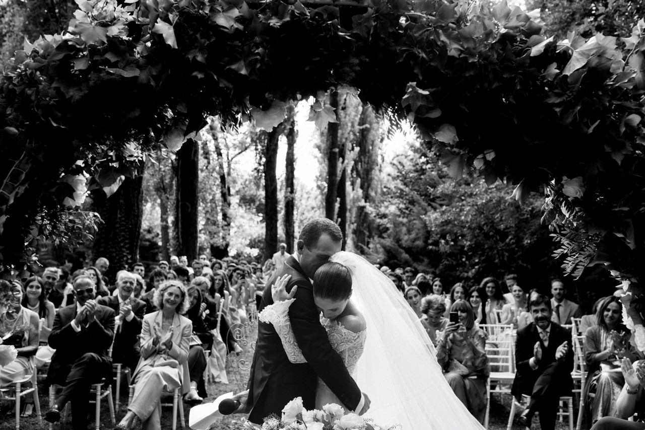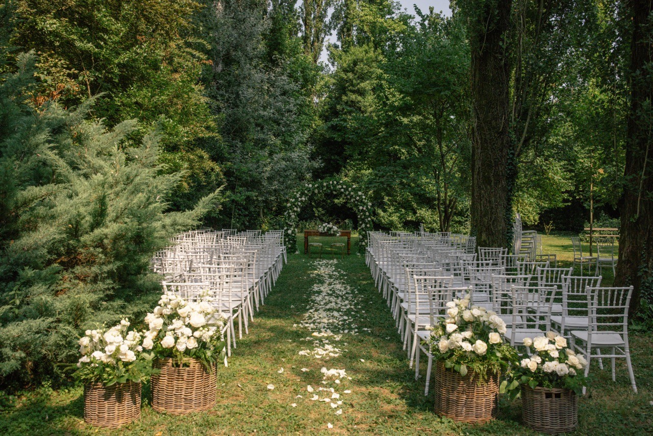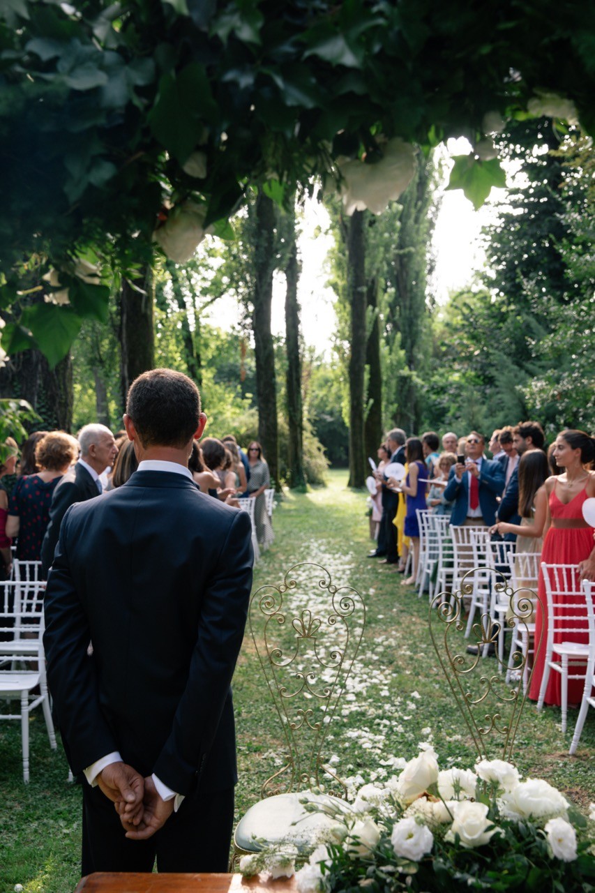 Francesca appare lungo il sentiero cosparso di petali con il bouquet bianco tra le mani, mentre Pietro la attende sotto l'arco di rose, tra sedie leggere che disegnano una piccola radura nel verde. Gli ospiti si stringono attorno a loro con naturalezza, partecipando a ogni gesto: uno sguardo trattenuto, una risata libera, l'emozione che affiora durante la promessa.