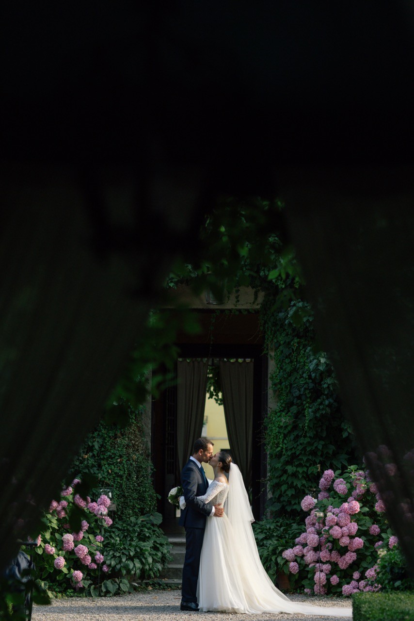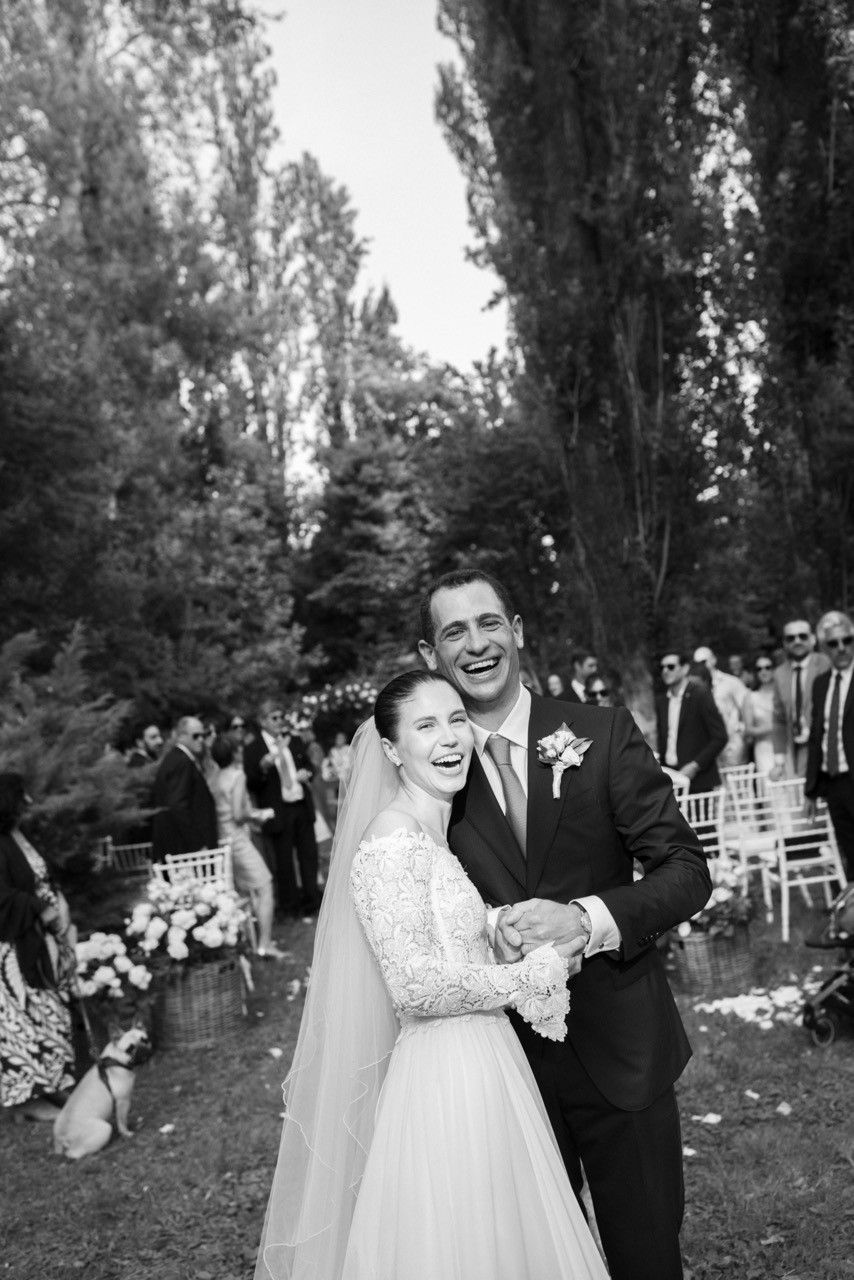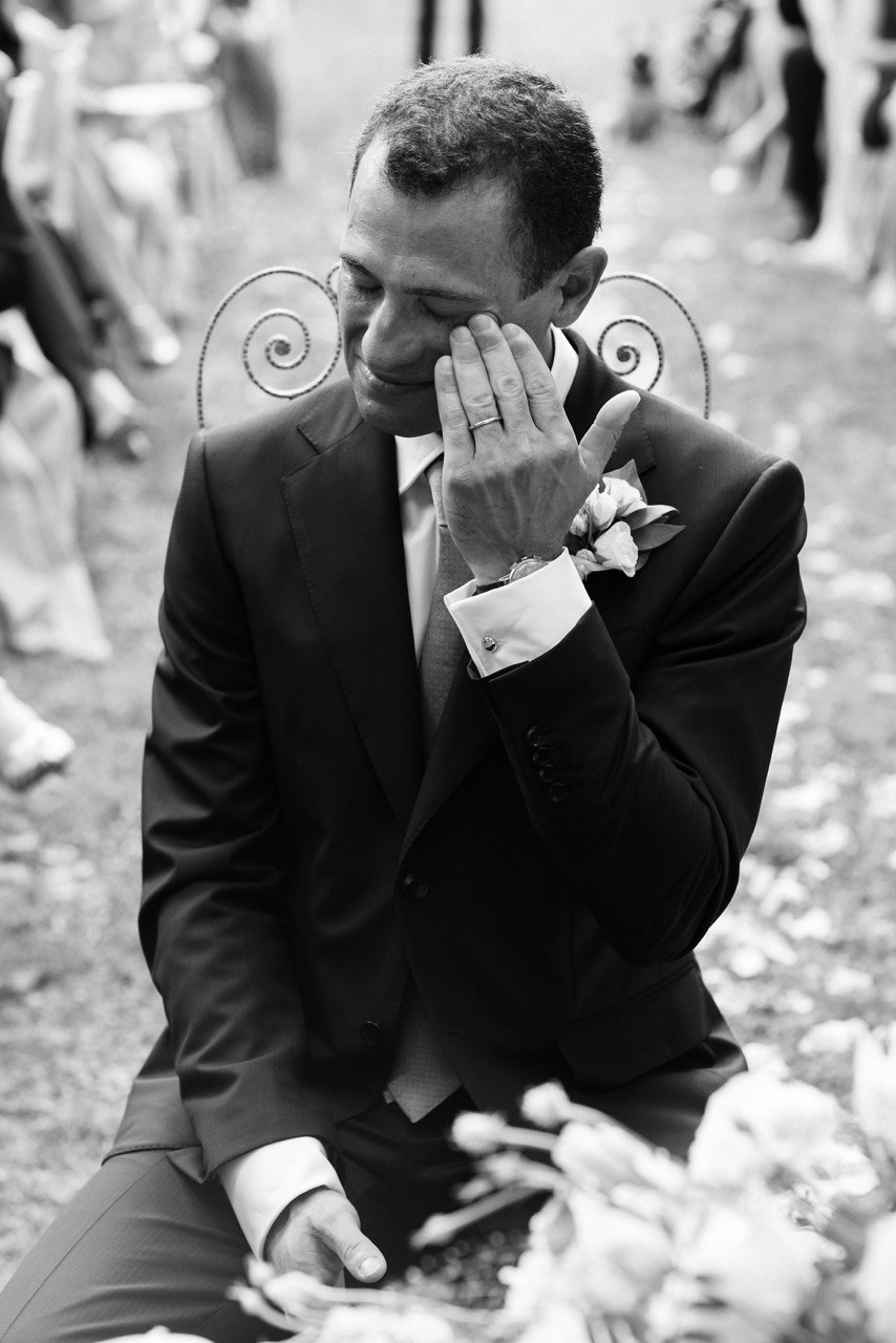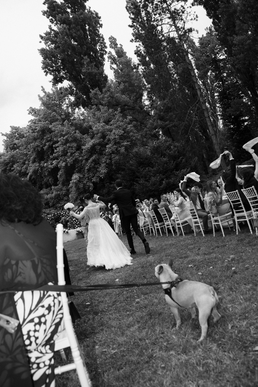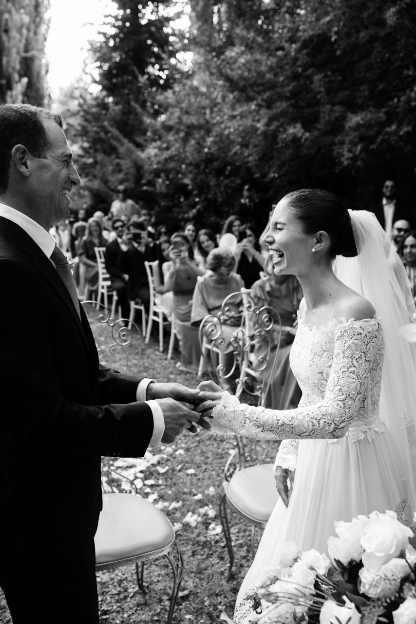 Francesca appare lungo il sentiero cosparso di petali con il bouquet bianco tra le mani, mentre Pietro la attende sotto l'arco di rose, tra sedie leggere che disegnano una piccola radura nel verde. Gli ospiti si stringono attorno a loro con naturalezza, partecipando a ogni gesto: uno sguardo trattenuto, una risata libera, l'emozione che affiora durante la promessa.