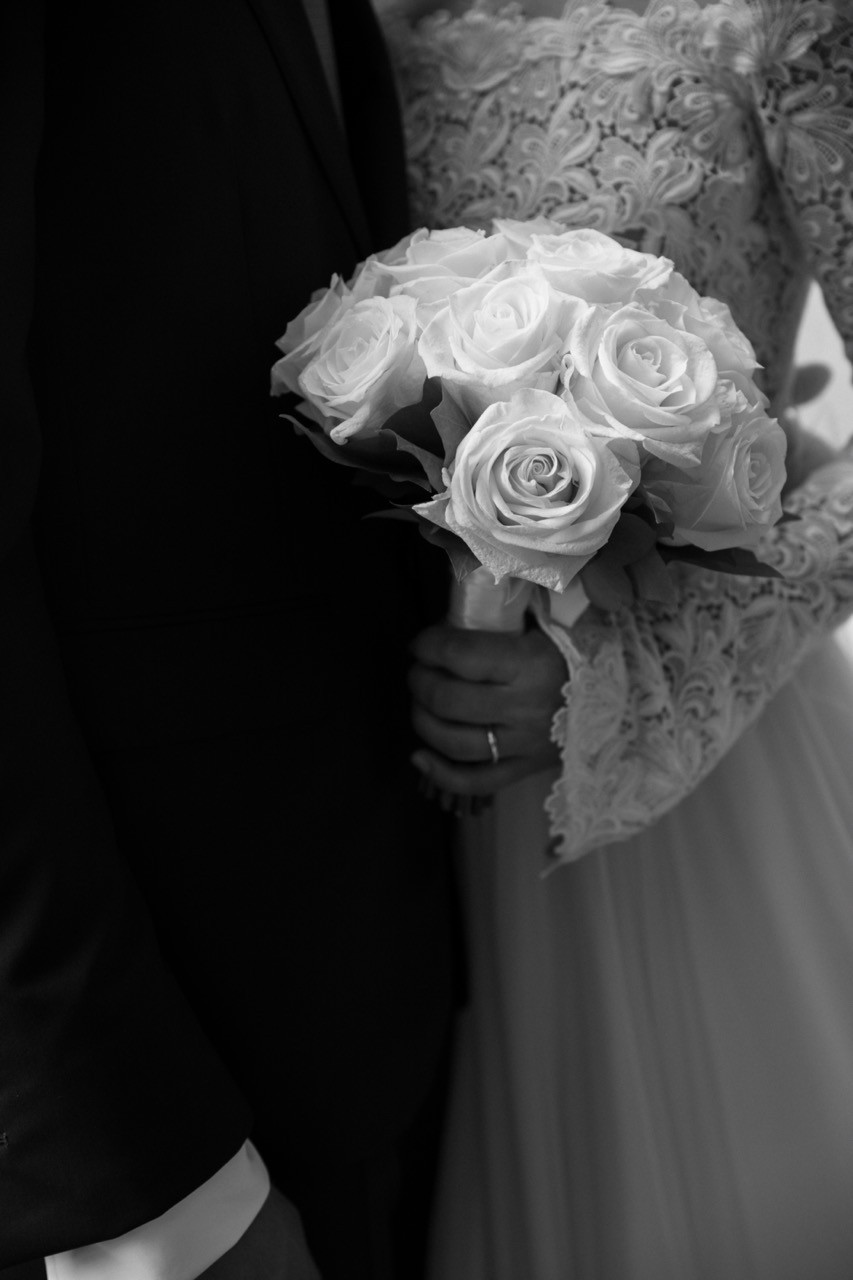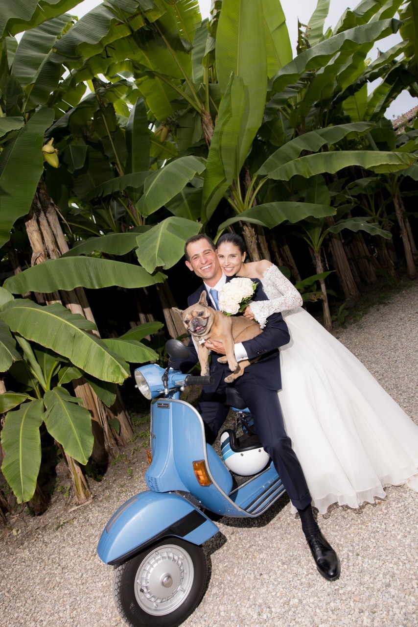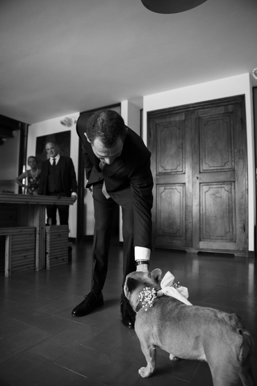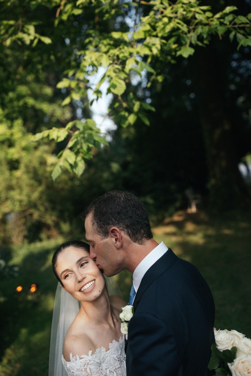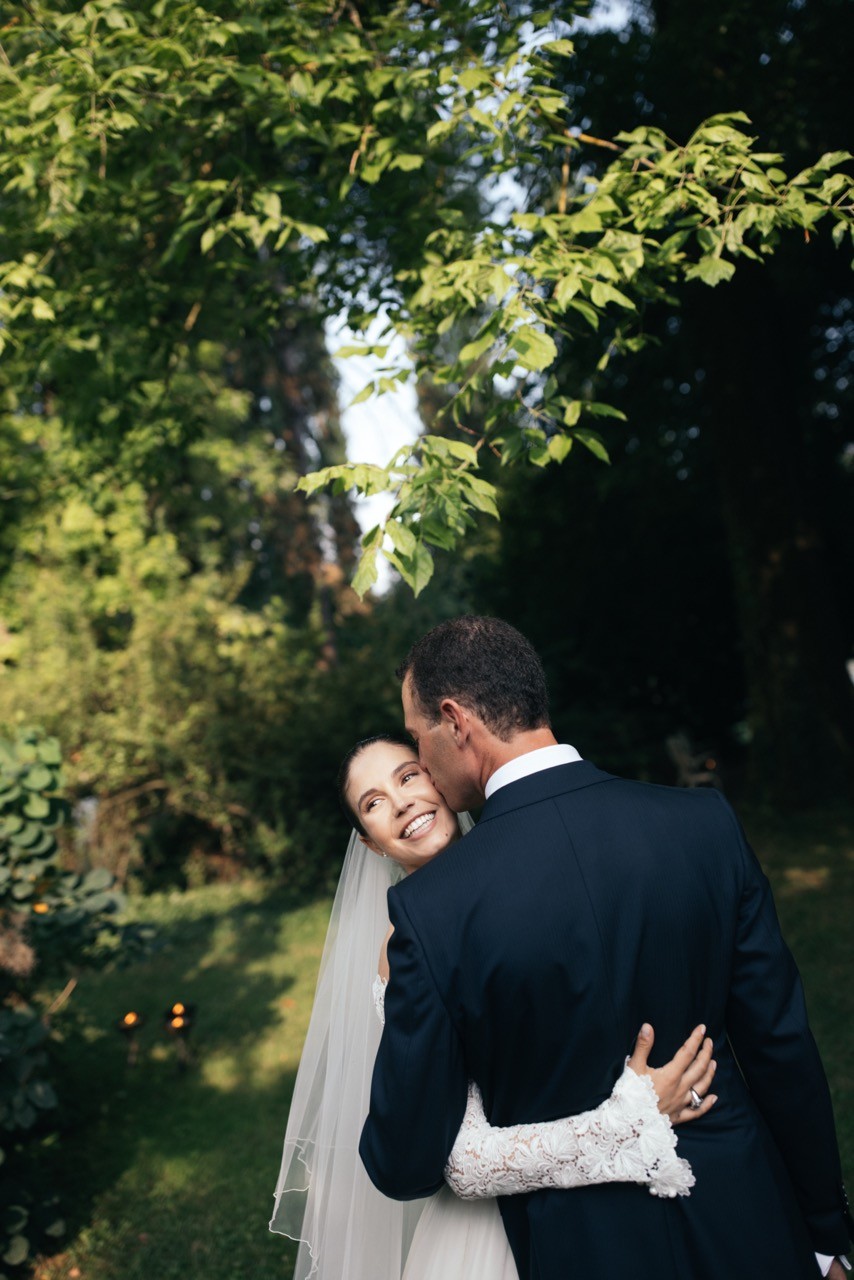 Francesca appare lungo il sentiero cosparso di petali con il bouquet bianco tra le mani, mentre Pietro la attende sotto l'arco di rose, tra sedie leggere che disegnano una piccola radura nel verde. Gli ospiti si stringono attorno a loro con naturalezza, partecipando a ogni gesto: uno sguardo trattenuto, una risata libera, l'emozione che affiora durante la promessa.