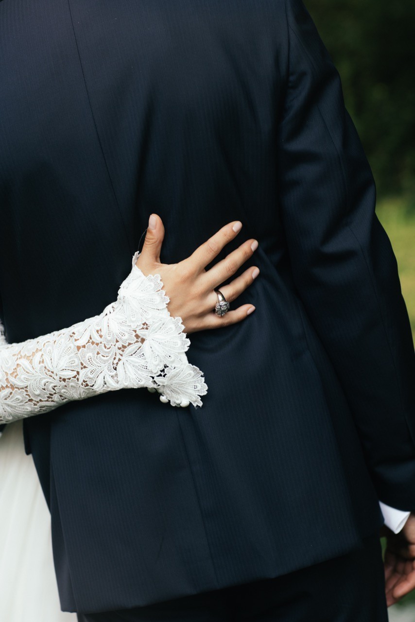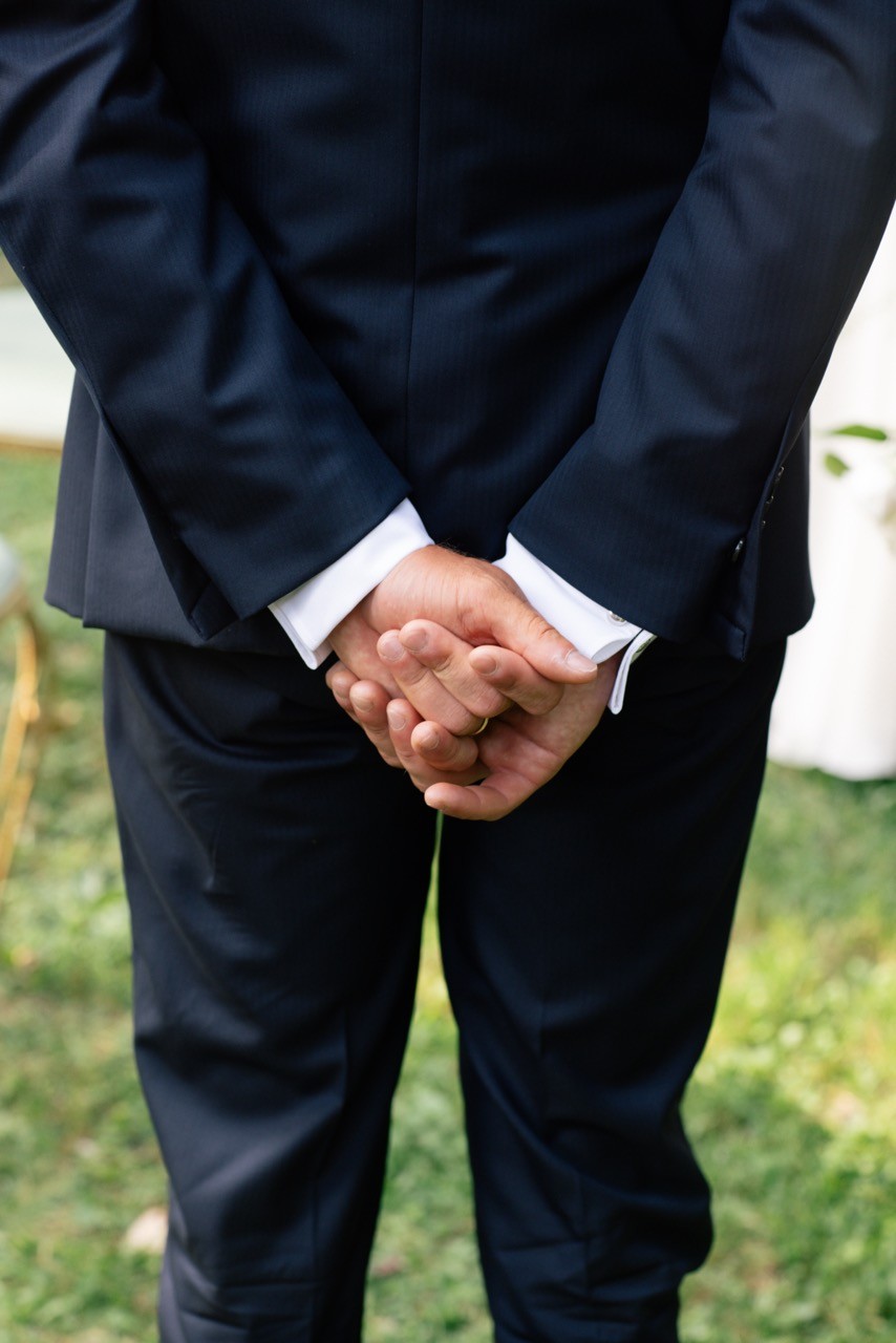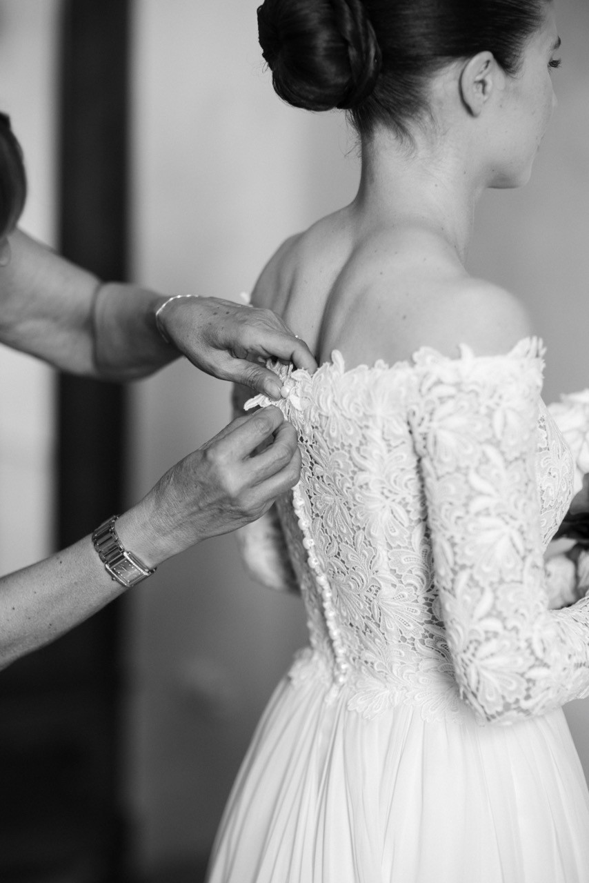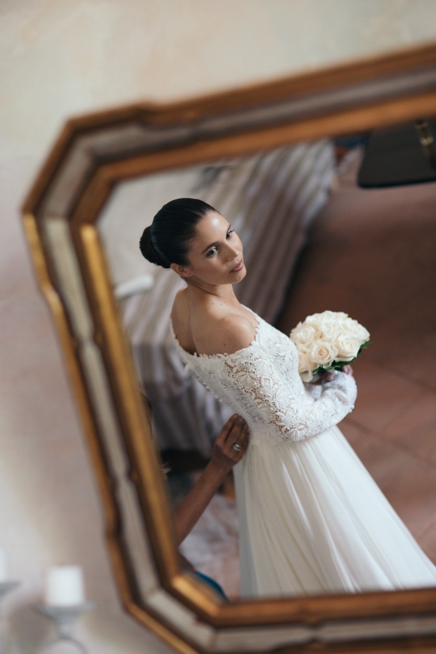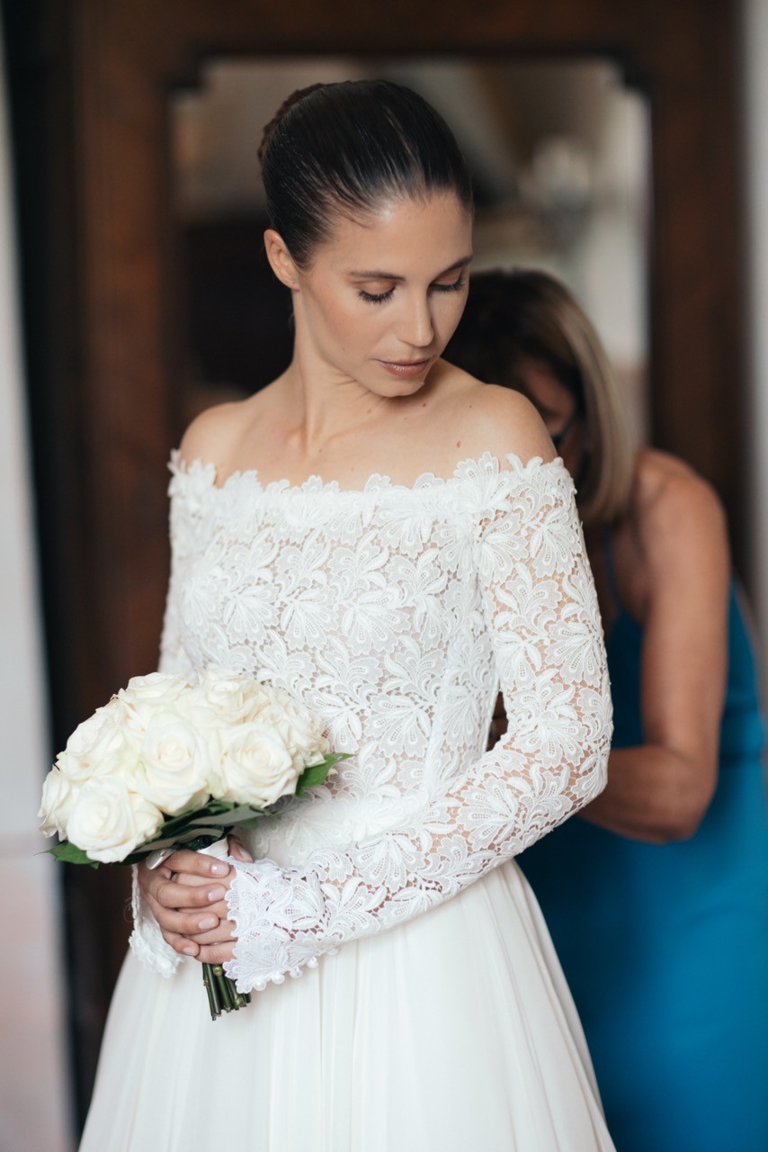Francesca appare lungo il sentiero cosparso di petali con il bouquet bianco tra le mani, mentre Pietro la attende sotto l'arco di rose, tra sedie leggere che disegnano una piccola radura nel verde. Gli ospiti si stringono attorno a loro con naturalezza, partecipando a ogni gesto: uno sguardo trattenuto, una risata libera, l'emozione che affiora durante la promessa.