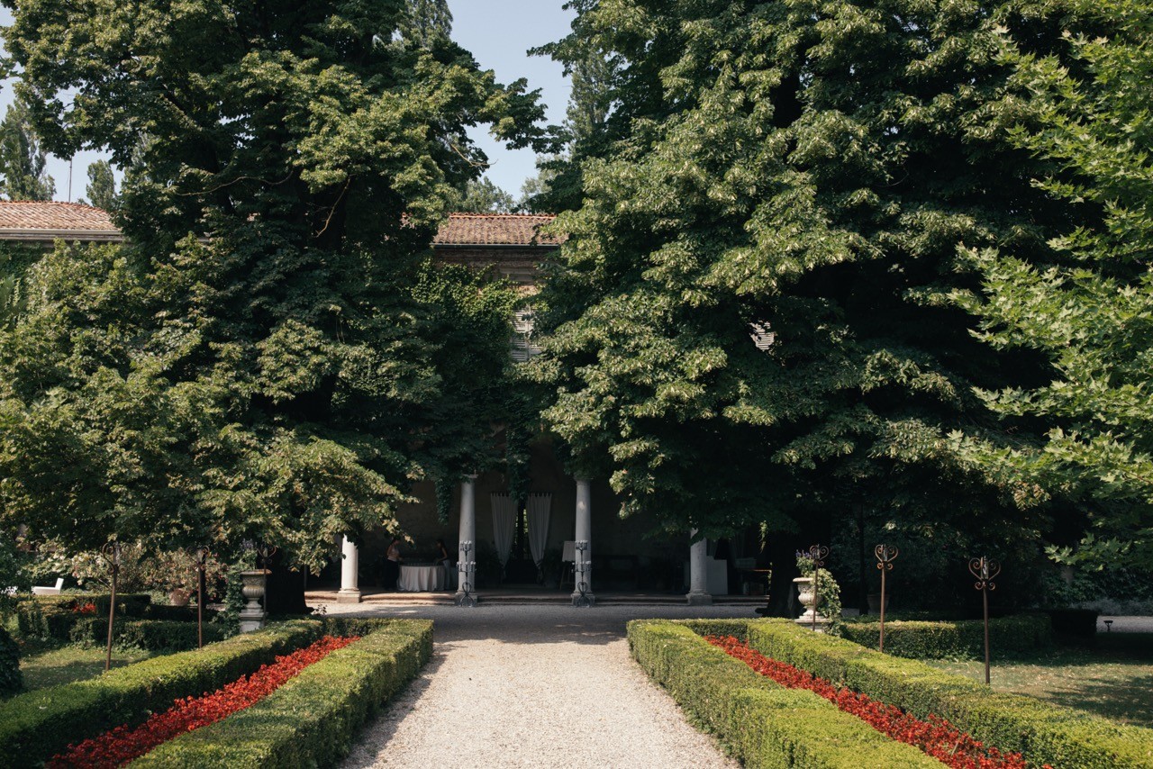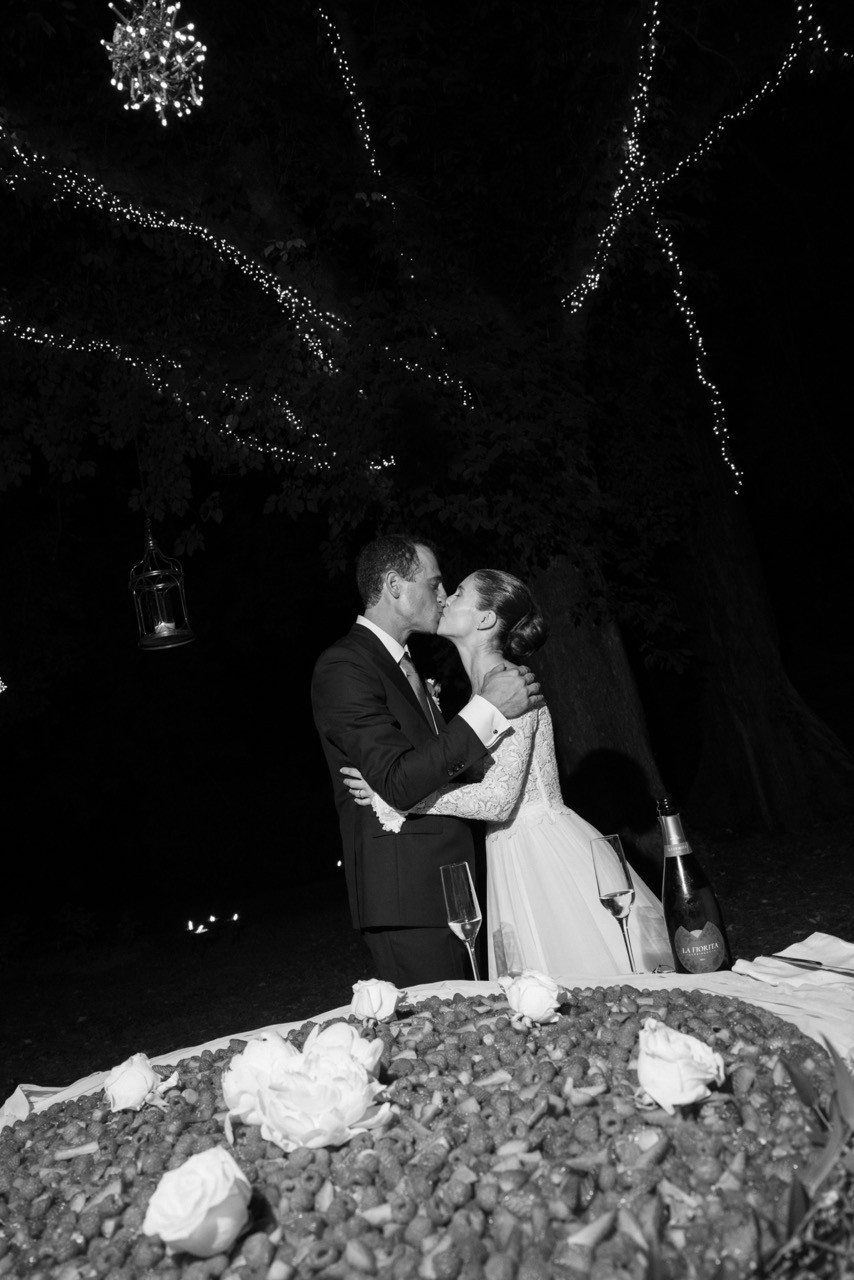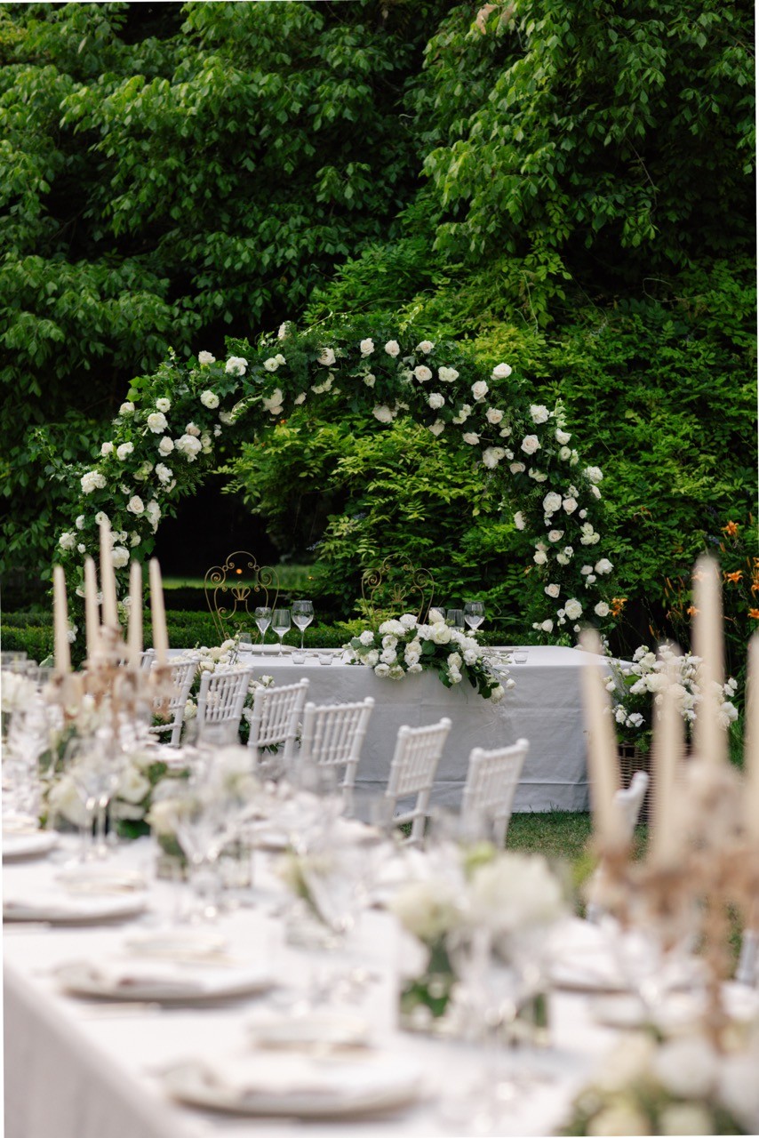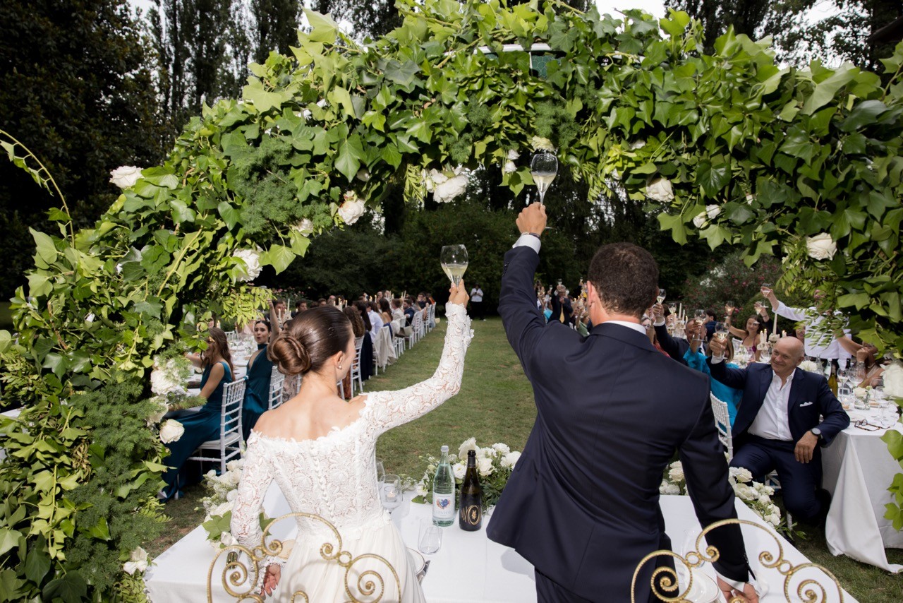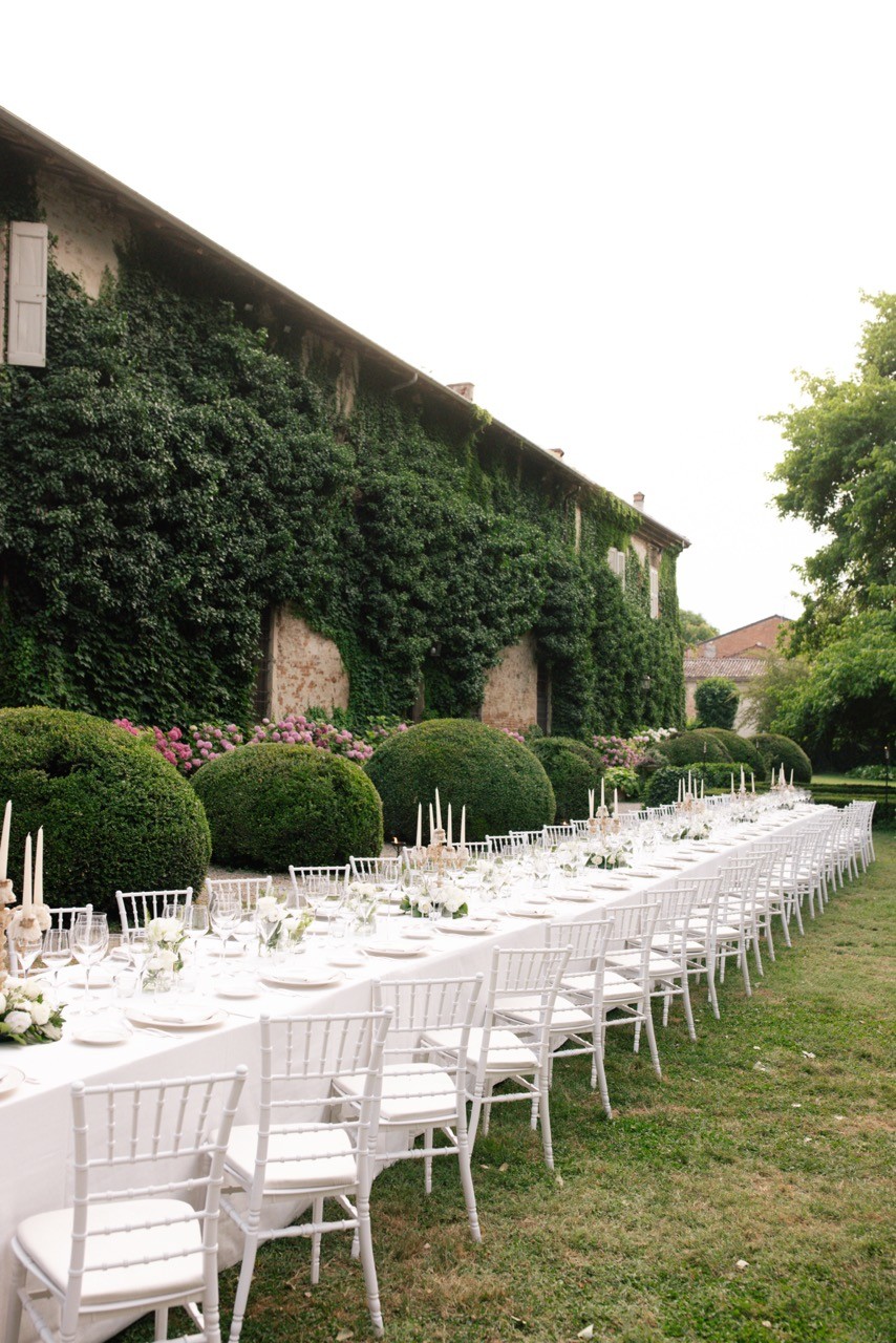 Più tardi l'atmosfera cambia. Davanti alla facciata velata d'edera, le tavolate si allungano sull'erba in una prospettiva ordinata. I candelabri antichi si accendono lentamente e la cera colata ne segna il tempo, mentre i bicchieri si alzano e le voci si mescolano nel tepore della sera.