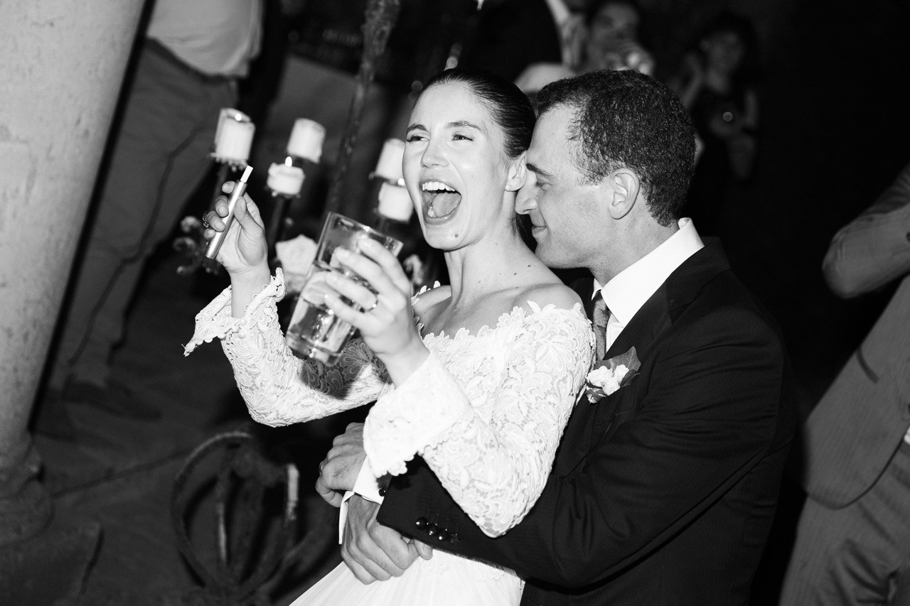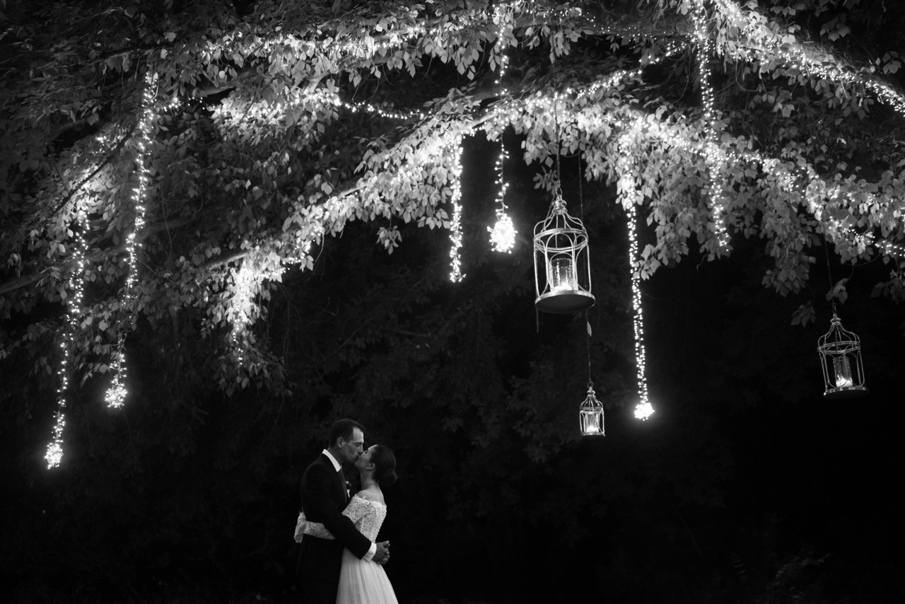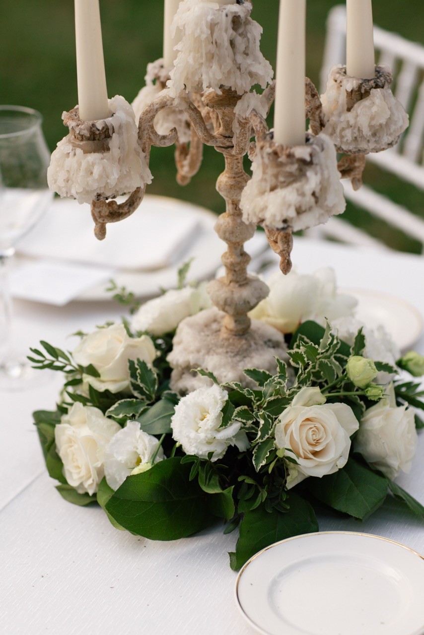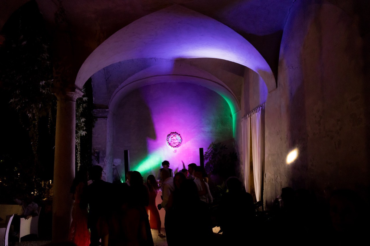 Più tardi l'atmosfera cambia. Davanti alla facciata velata d'edera, le tavolate si allungano sull'erba in una prospettiva ordinata. I candelabri antichi si accendono lentamente e la cera colata ne segna il tempo, mentre i bicchieri si alzano e le voci si mescolano nel tepore della sera.
