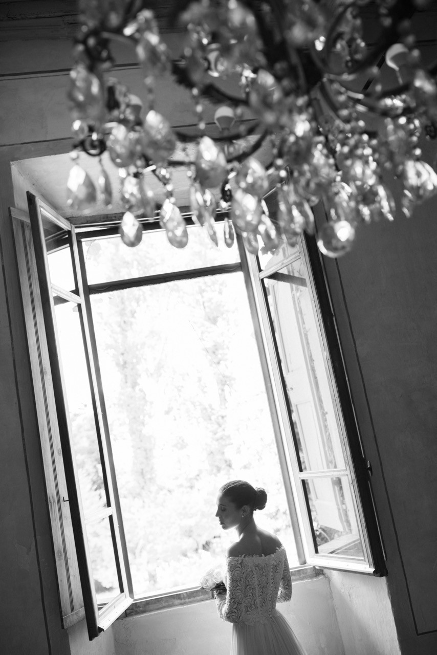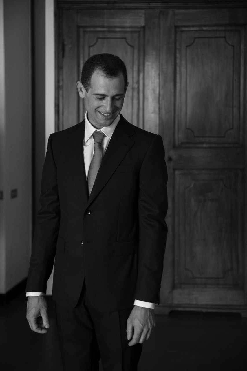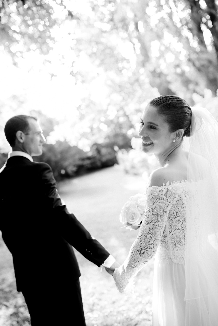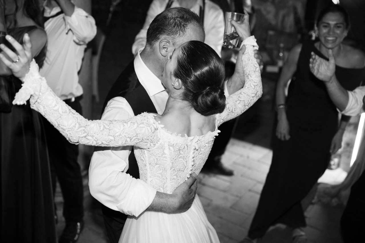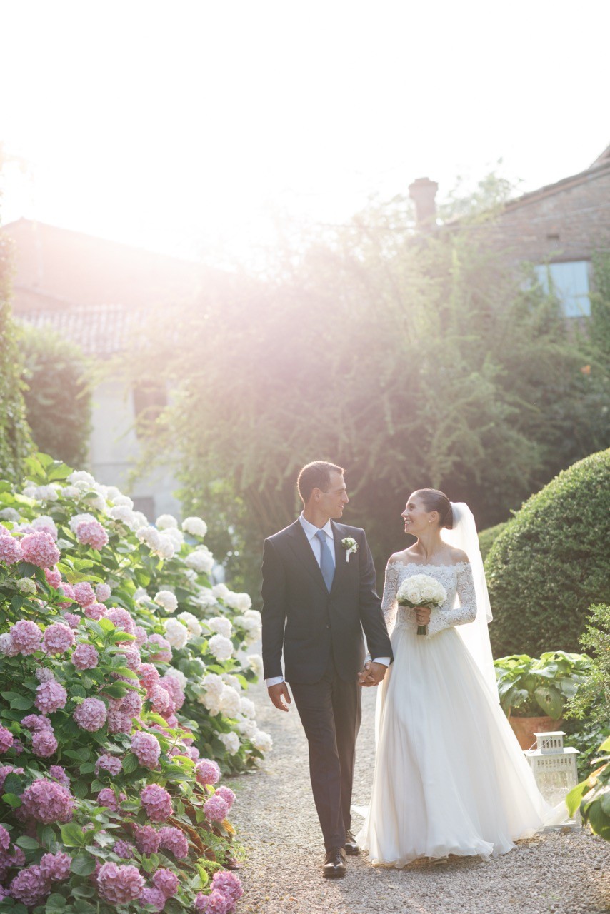 Più tardi l'atmosfera cambia. Davanti alla facciata velata d'edera, le tavolate si allungano sull'erba in una prospettiva ordinata. I candelabri antichi si accendono lentamente e la cera colata ne segna il tempo, mentre i bicchieri si alzano e le voci si mescolano nel tepore della sera.