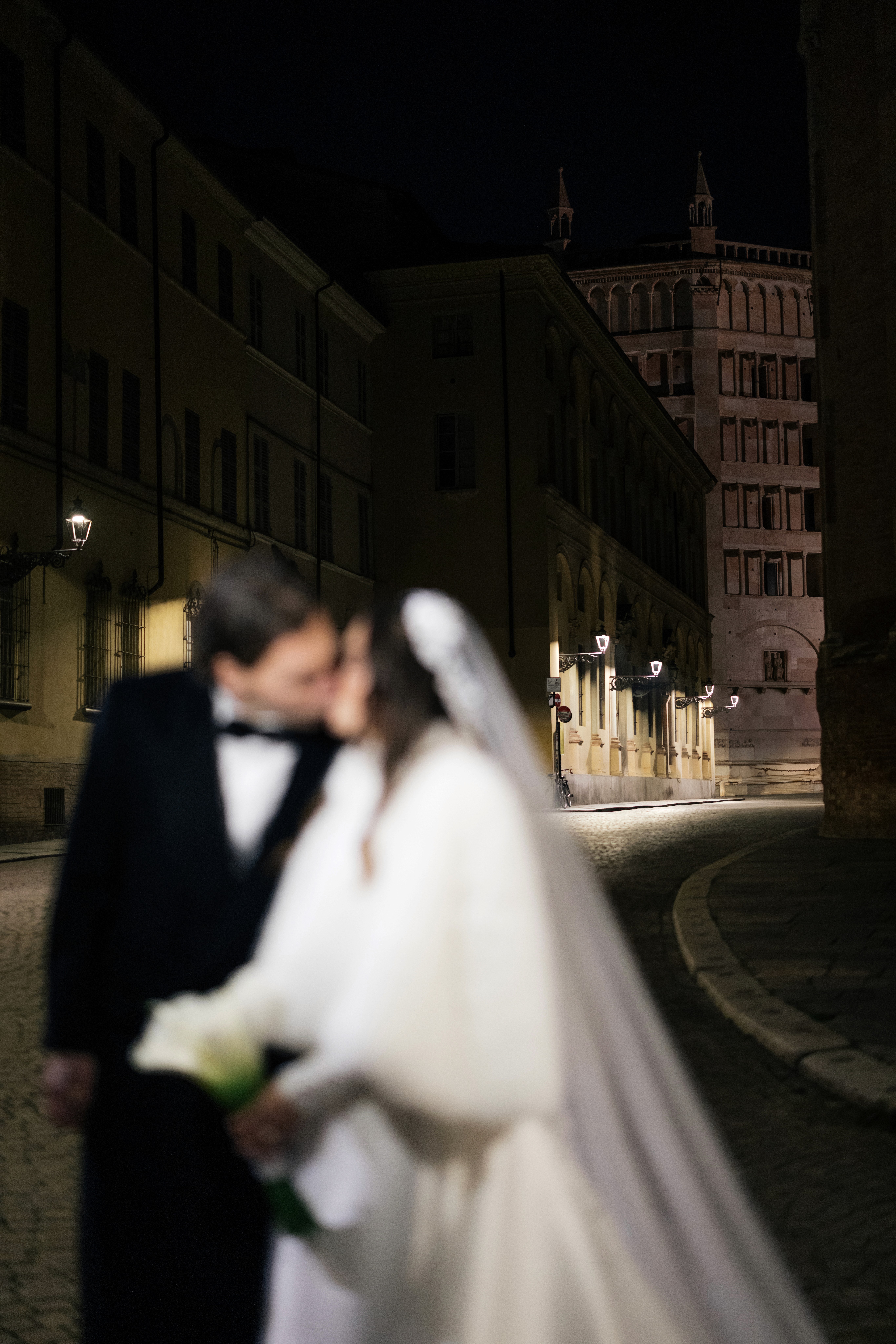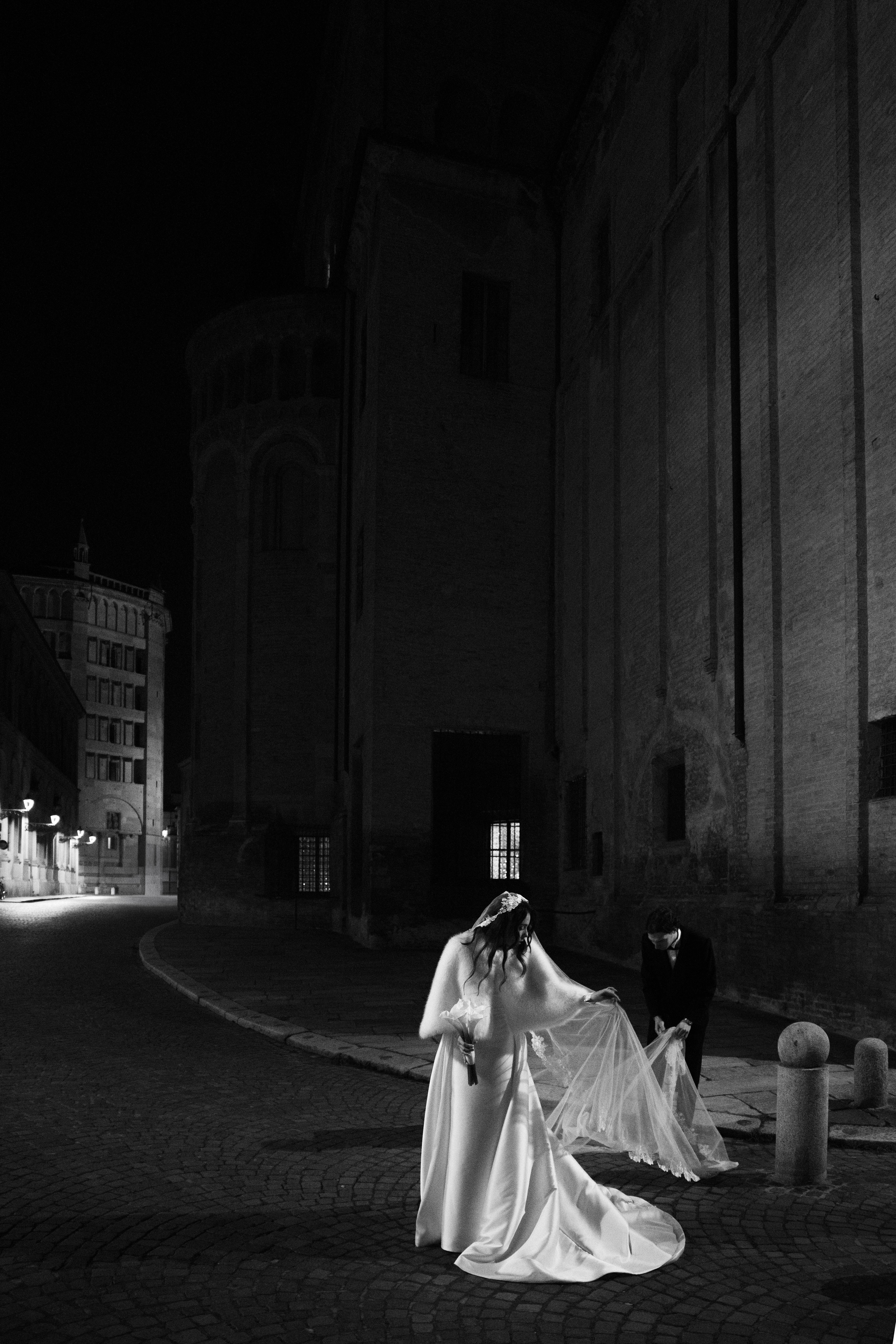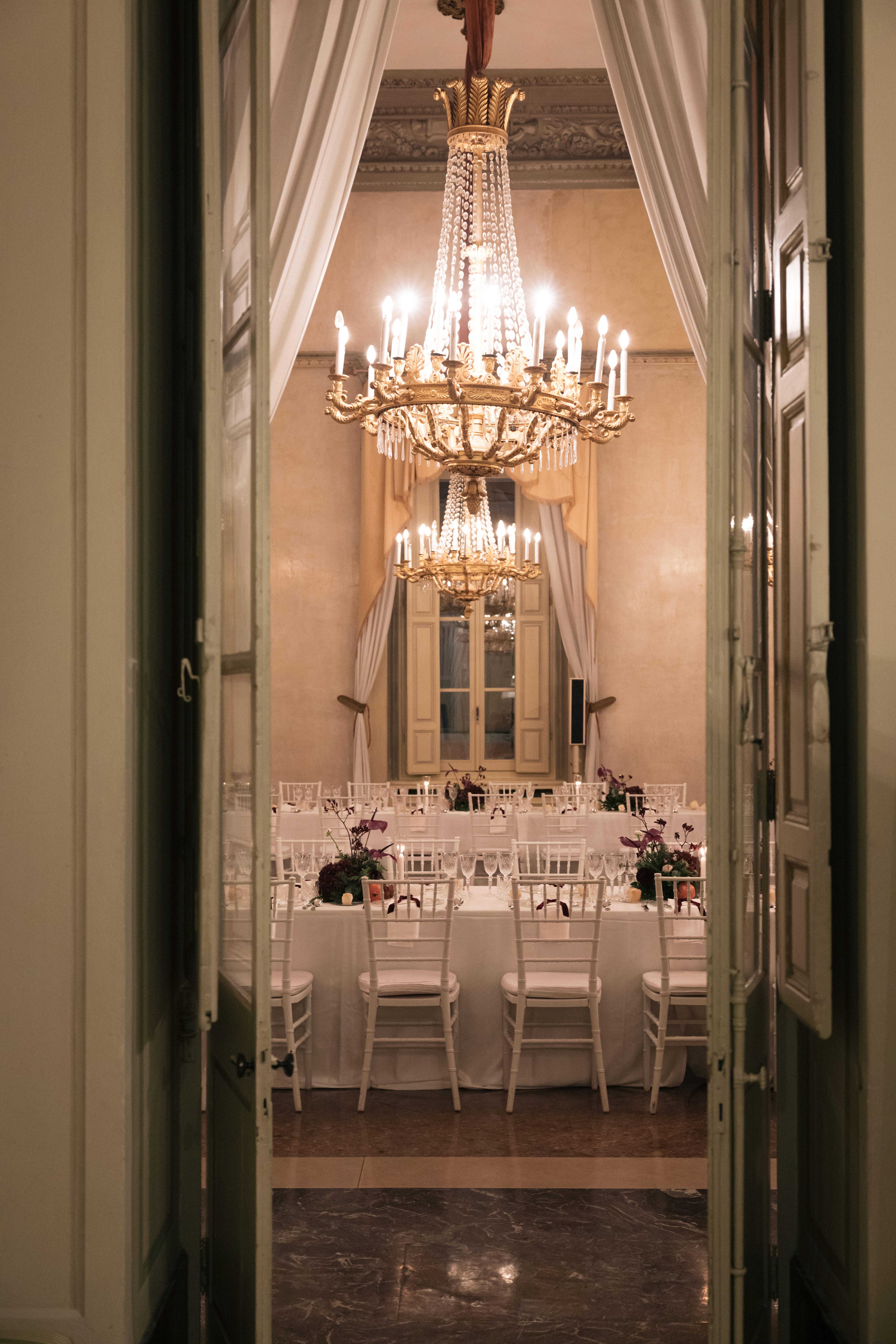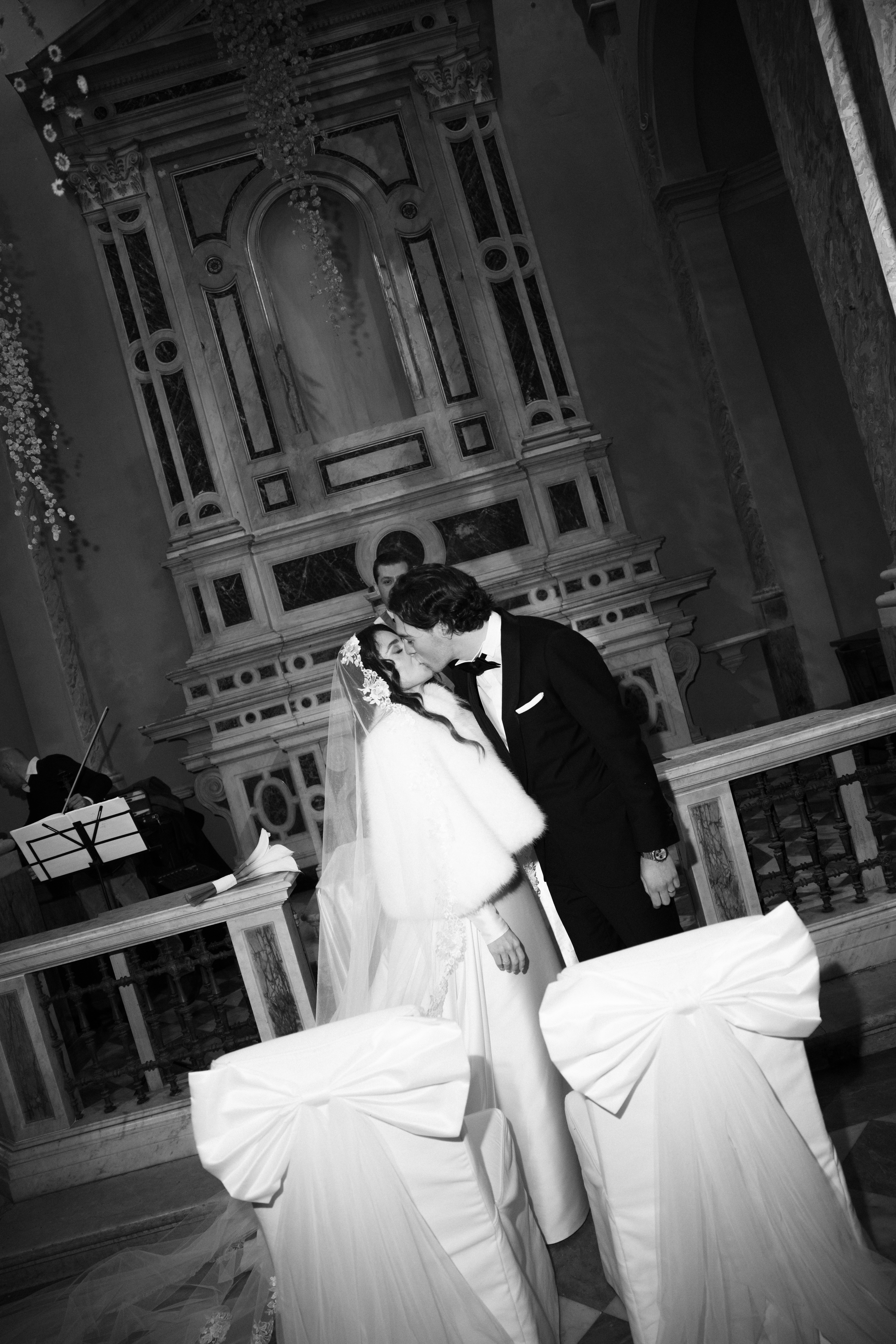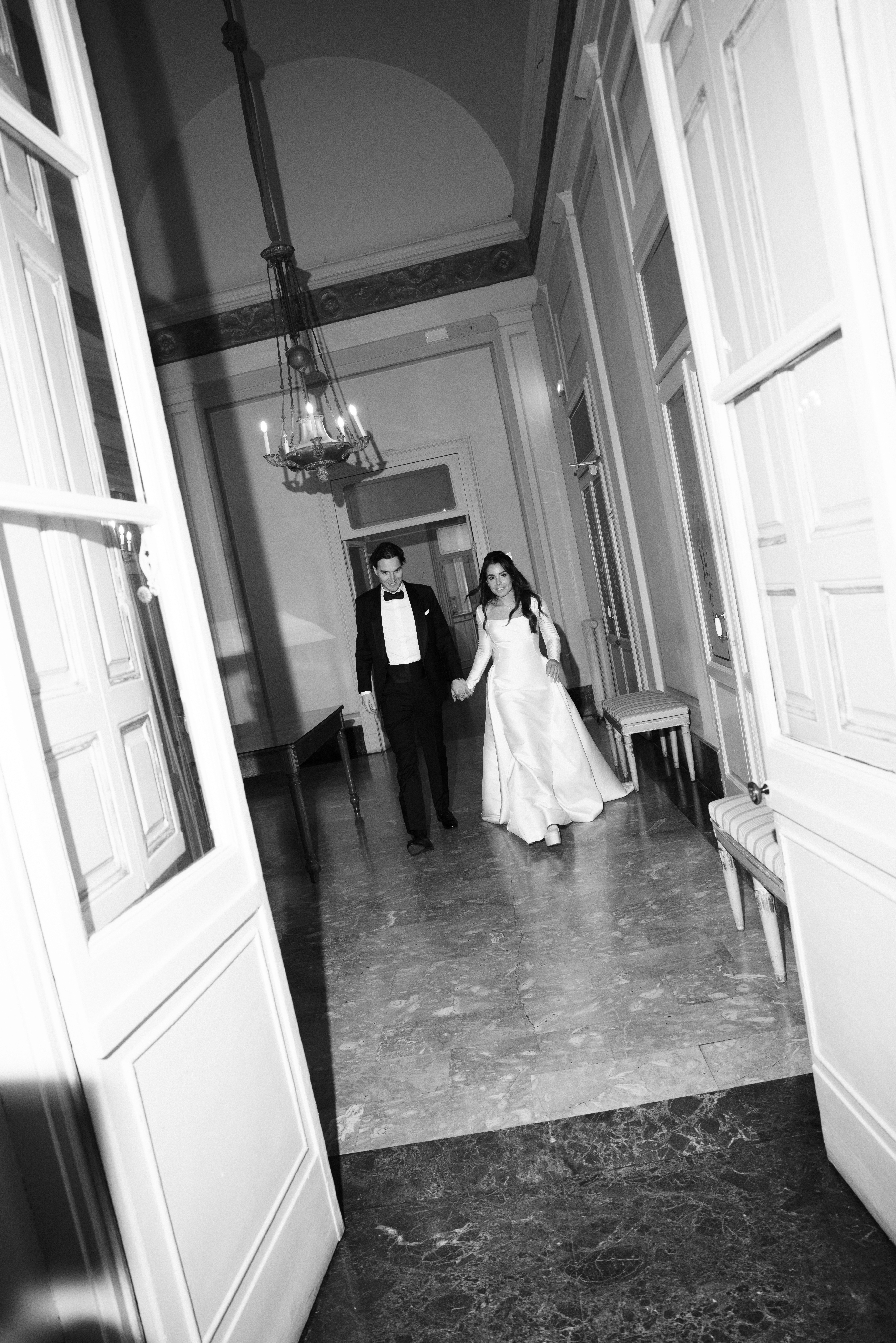 Tra le sale affrescate del Palazzo, attimi di spontaneità: un sorriso accarezzato dal trucco, mani accorte che sistemano il velo, l'abito in mikado che cattura ogni riflesso, il delicato bouquet di calle, gli ospiti che si lasciano trasportare dalla musica. La scenografica torta di bignè, protagonista dei festeggiamenti, incornicia il bacio degli sposi con vivacità e dolcezza.