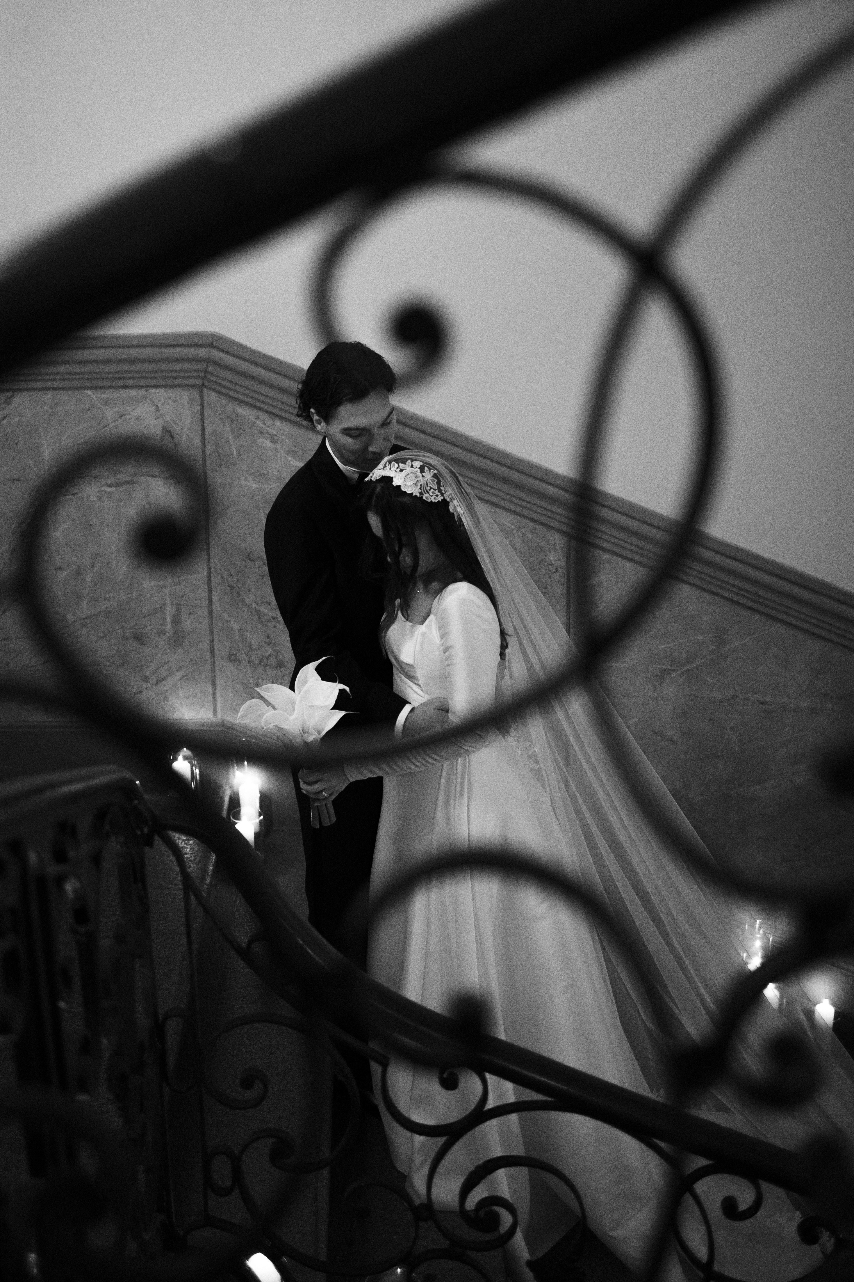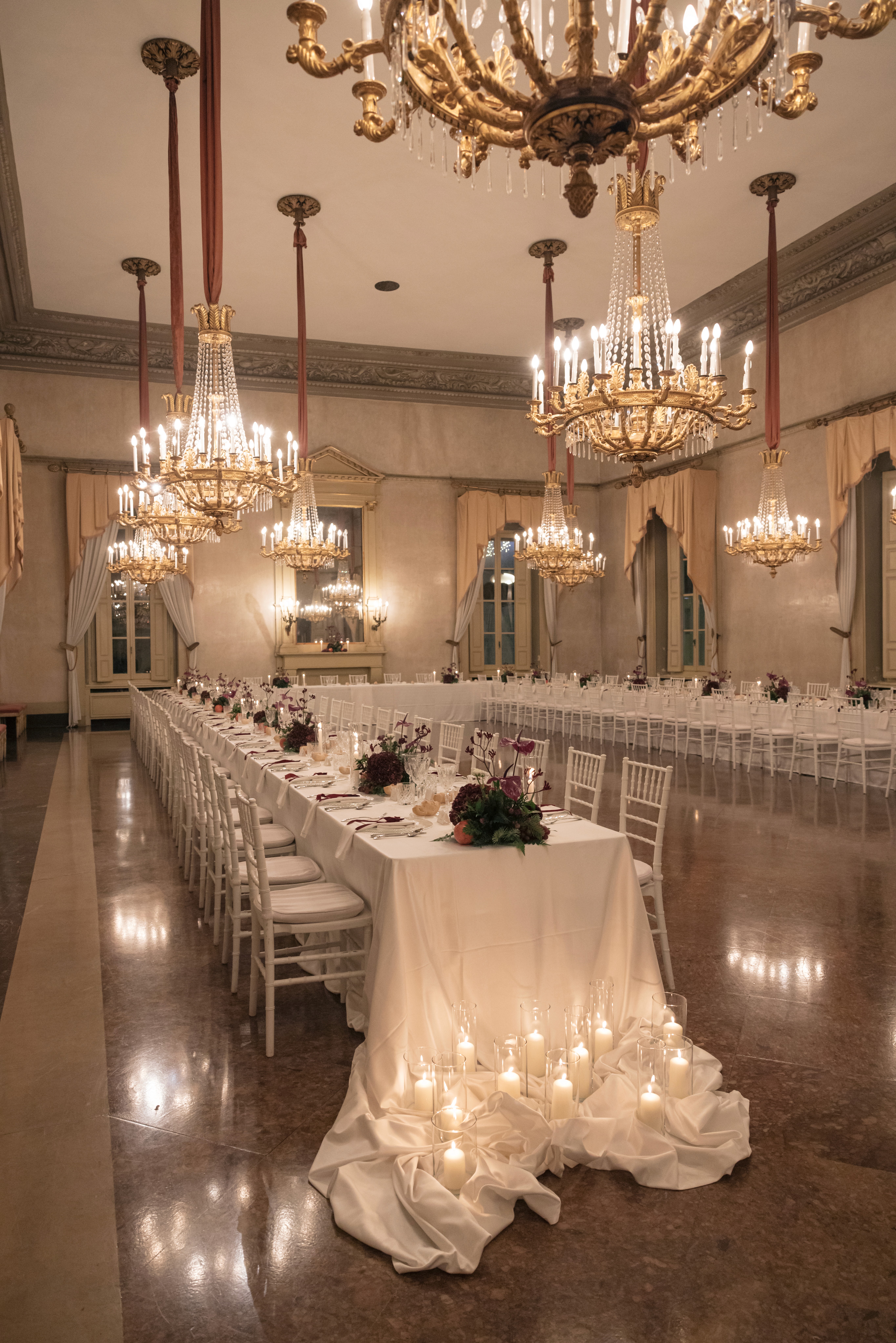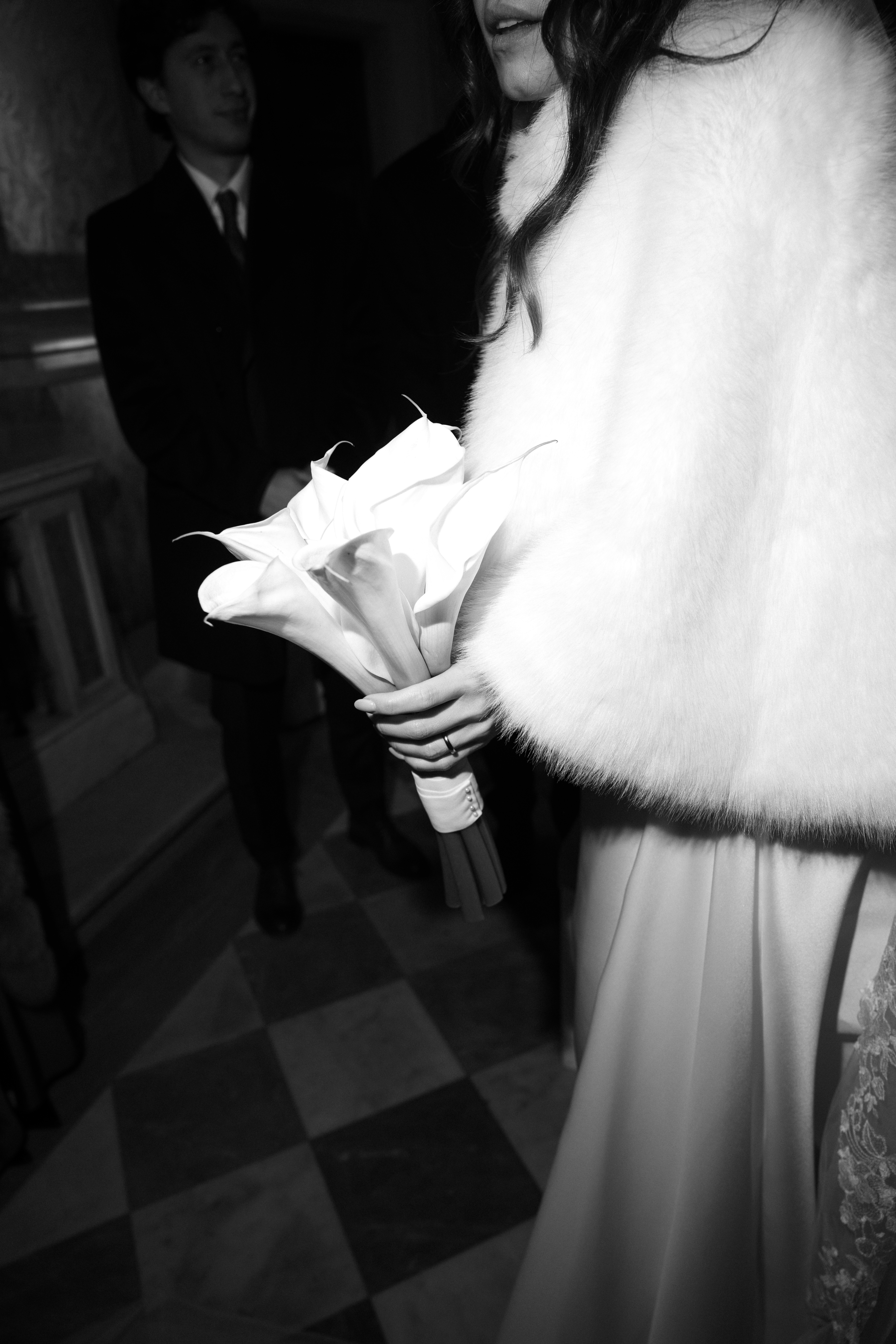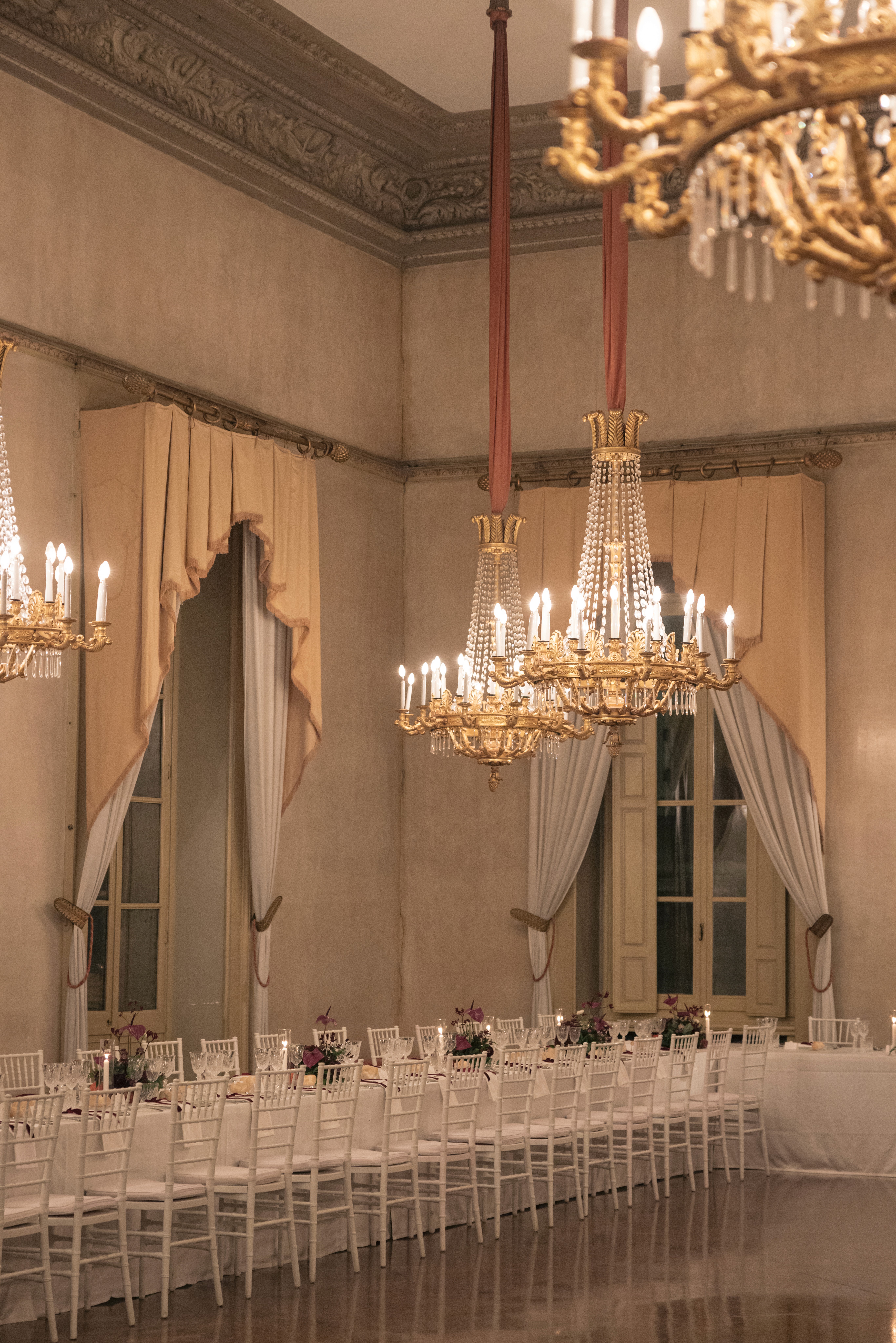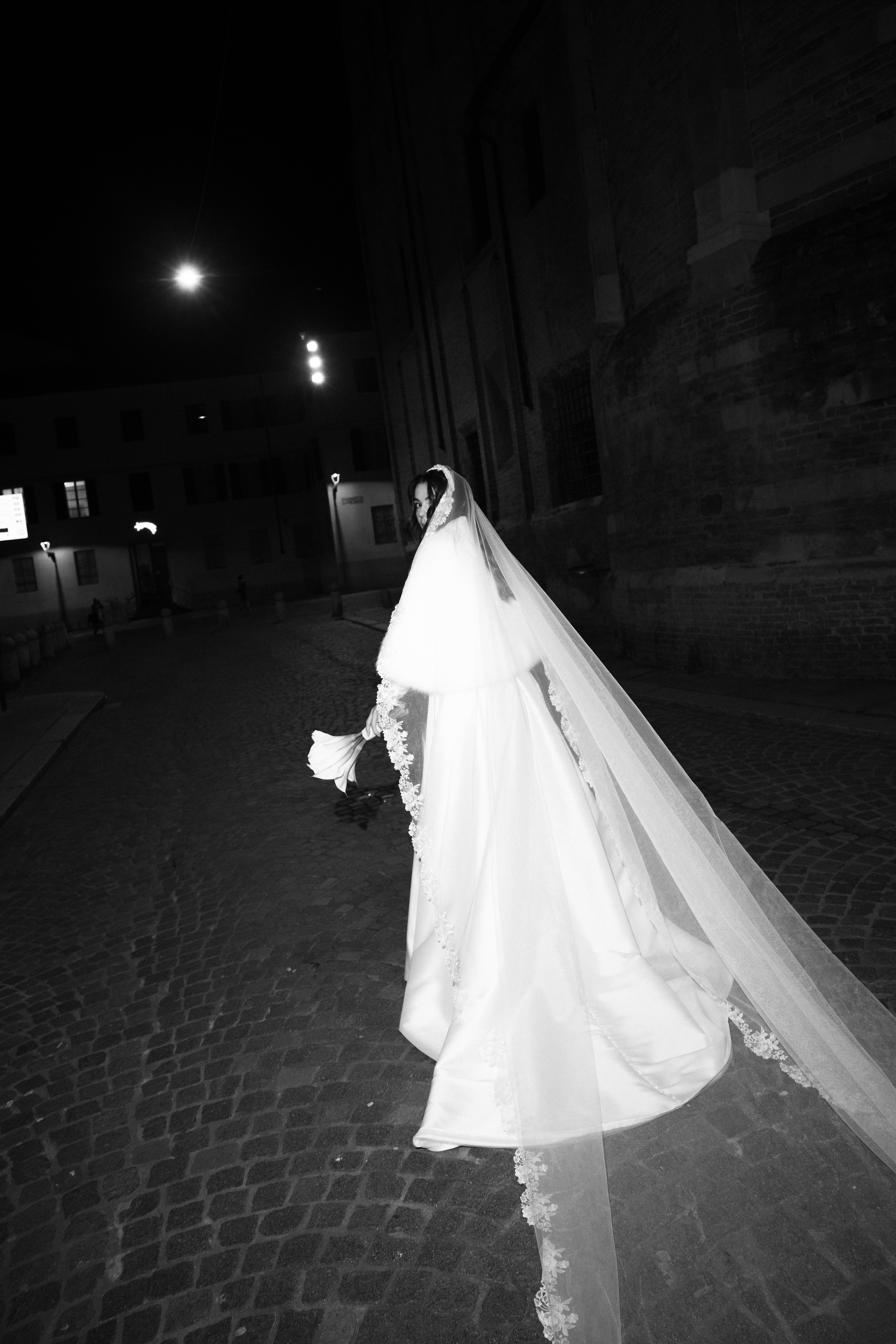 Tra le sale affrescate del Palazzo, attimi di spontaneità: un sorriso accarezzato dal trucco, mani accorte che sistemano il velo, l'abito in mikado che cattura ogni riflesso, il delicato bouquet di calle, gli ospiti che si lasciano trasportare dalla musica. La scenografica torta di bignè, protagonista dei festeggiamenti, incornicia il bacio degli sposi con vivacità e dolcezza.