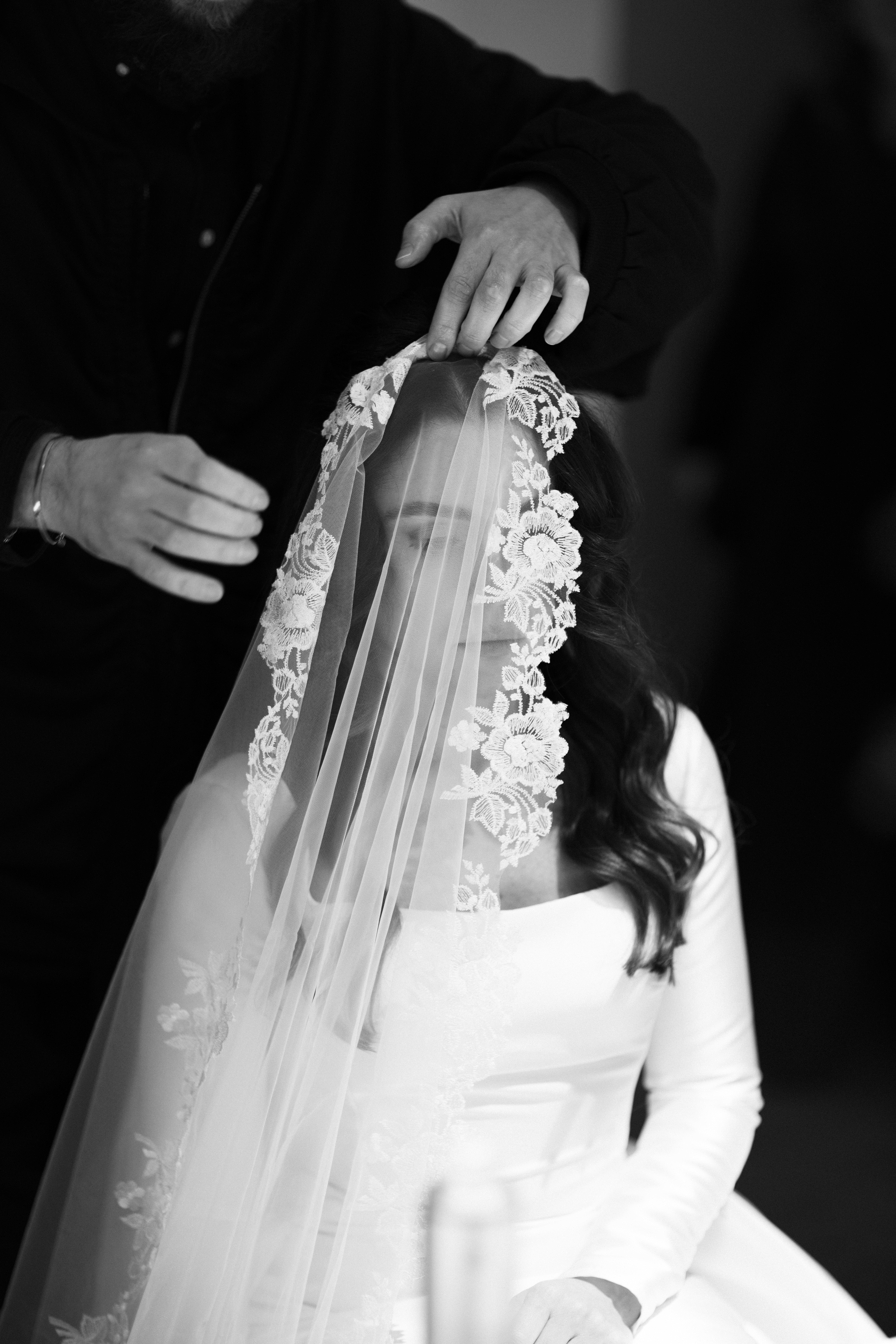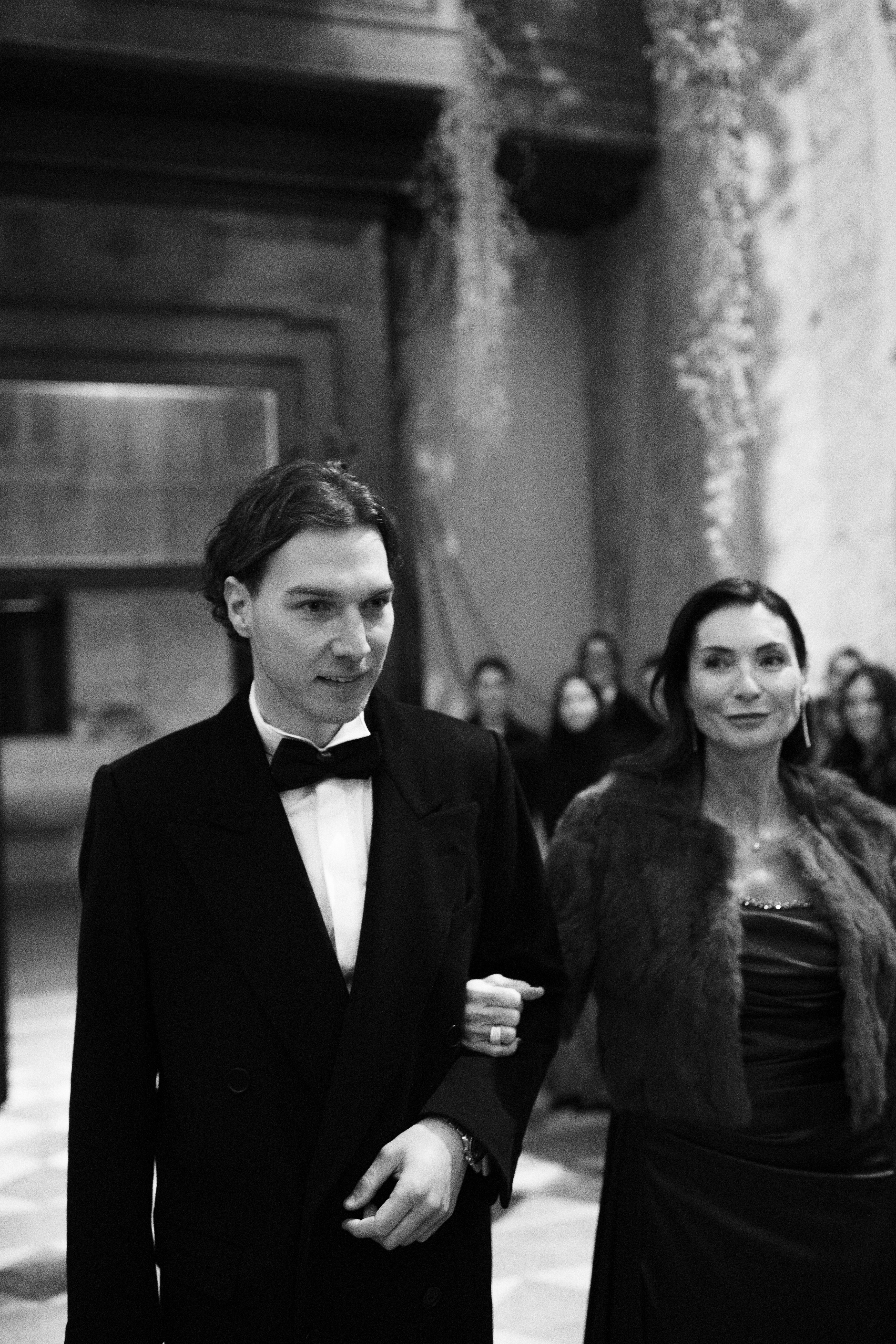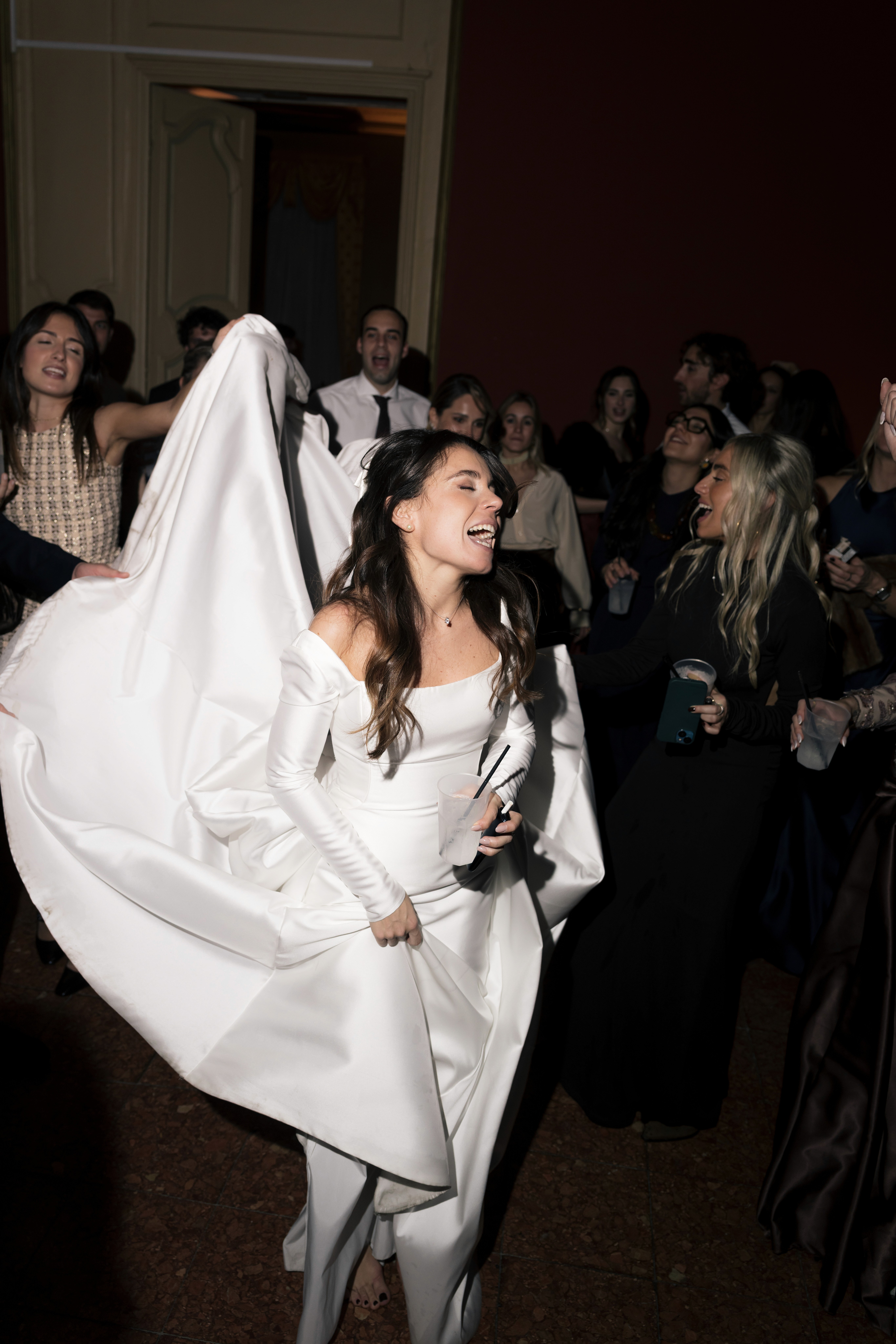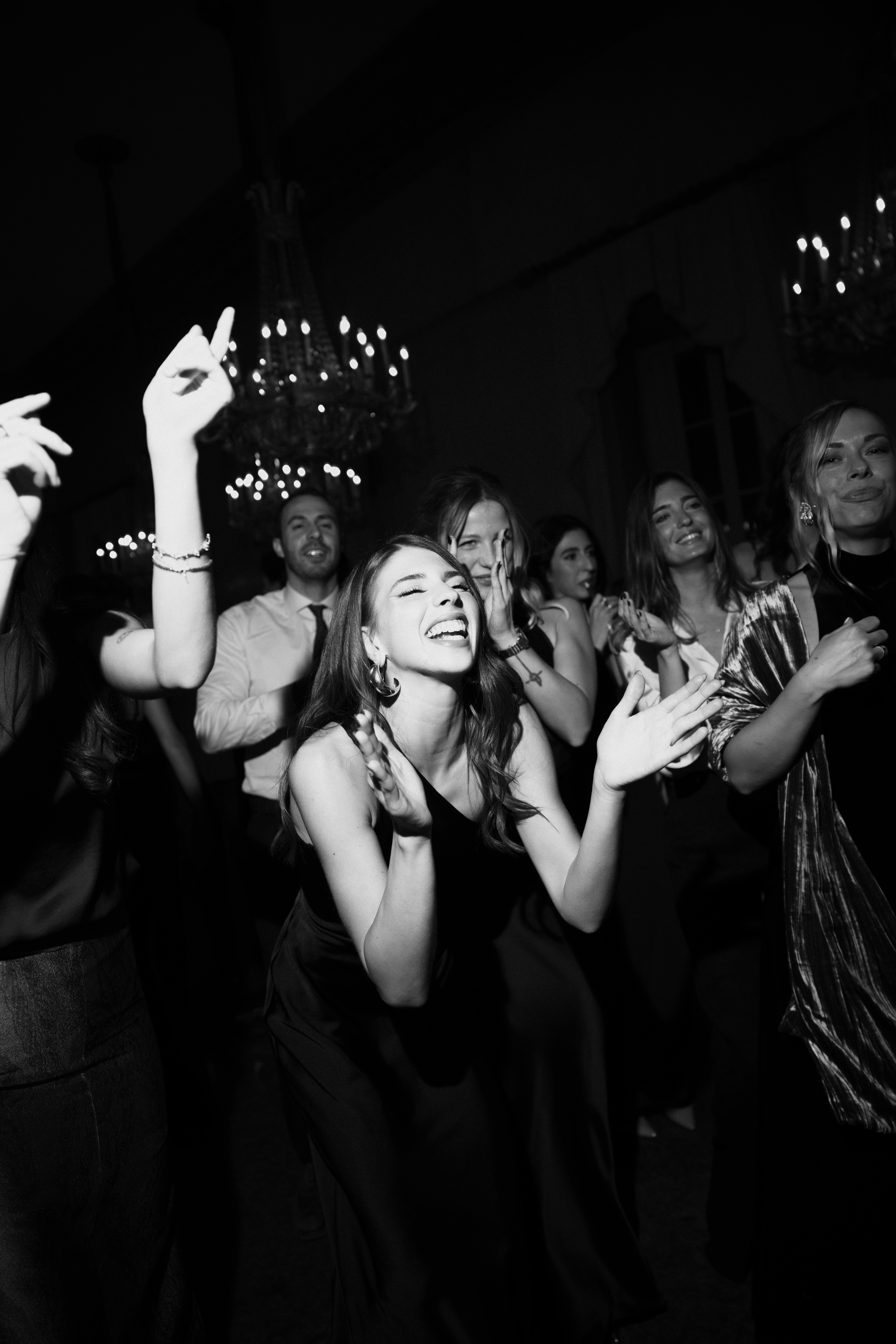 Tra le sale affrescate del Palazzo, attimi di spontaneità: un sorriso accarezzato dal trucco, mani accorte che sistemano il velo, l'abito in mikado che cattura ogni riflesso, il delicato bouquet di calle, gli ospiti che si lasciano trasportare dalla musica. La scenografica torta di bignè, protagonista dei festeggiamenti, incornicia il bacio degli sposi con vivacità e dolcezza.