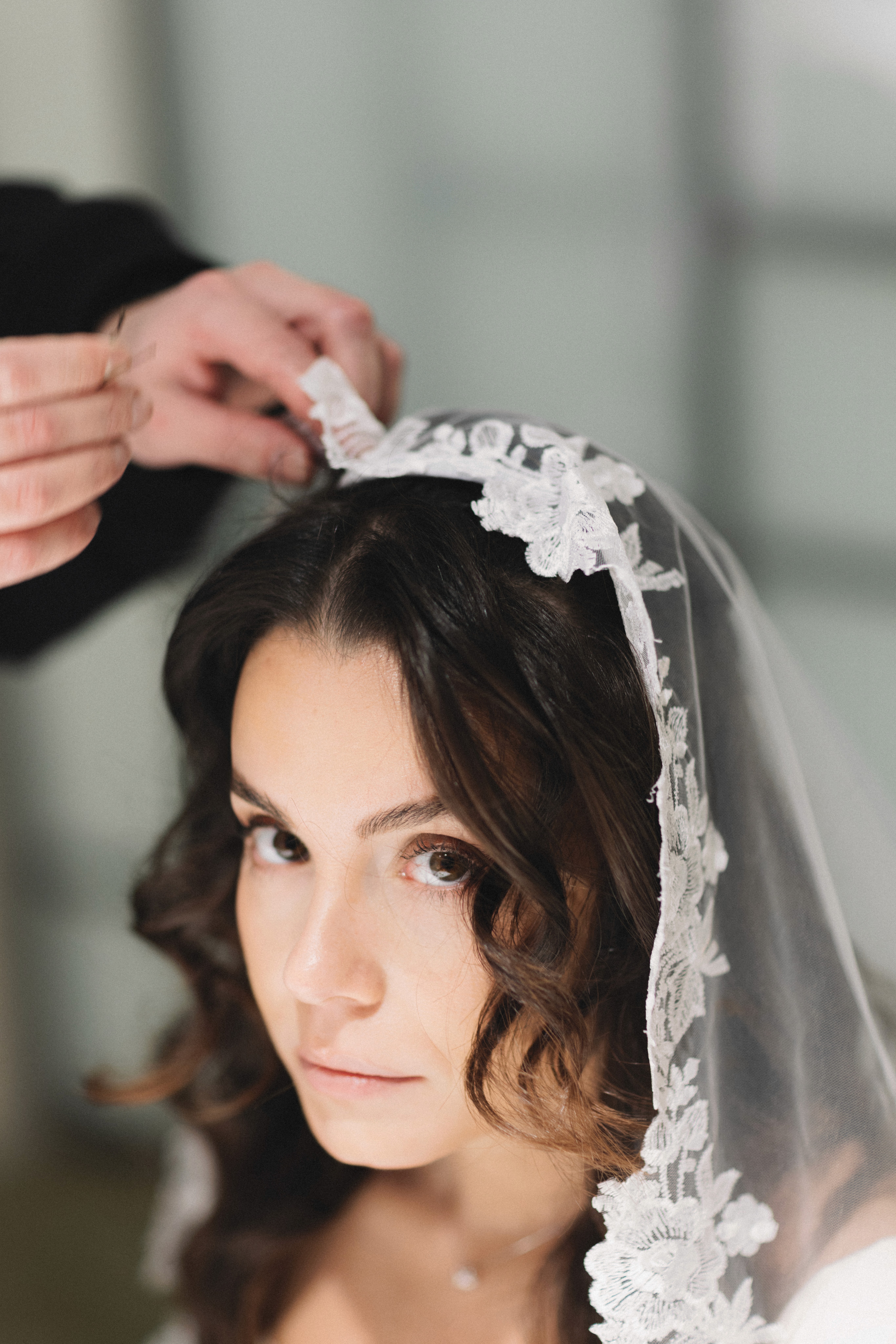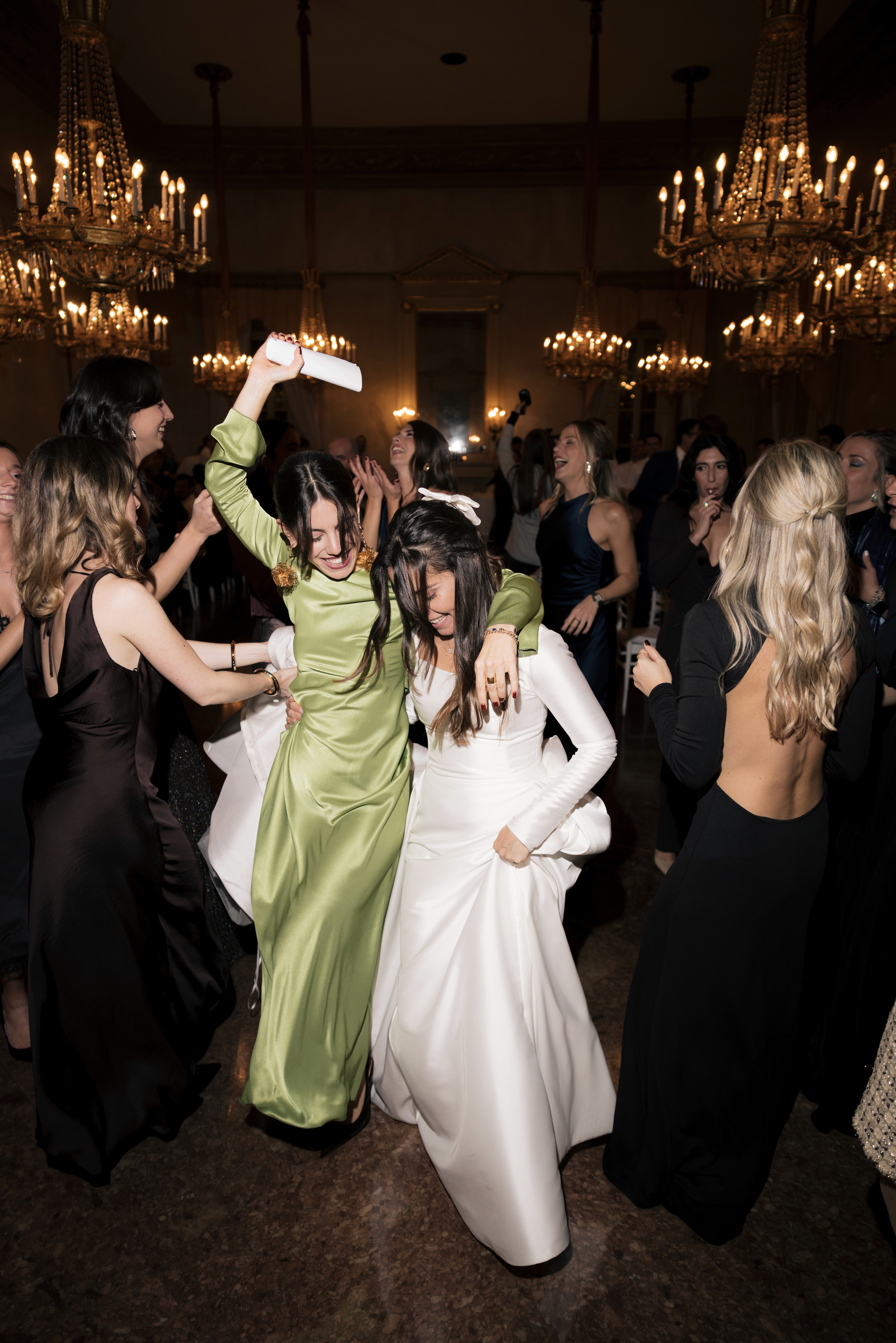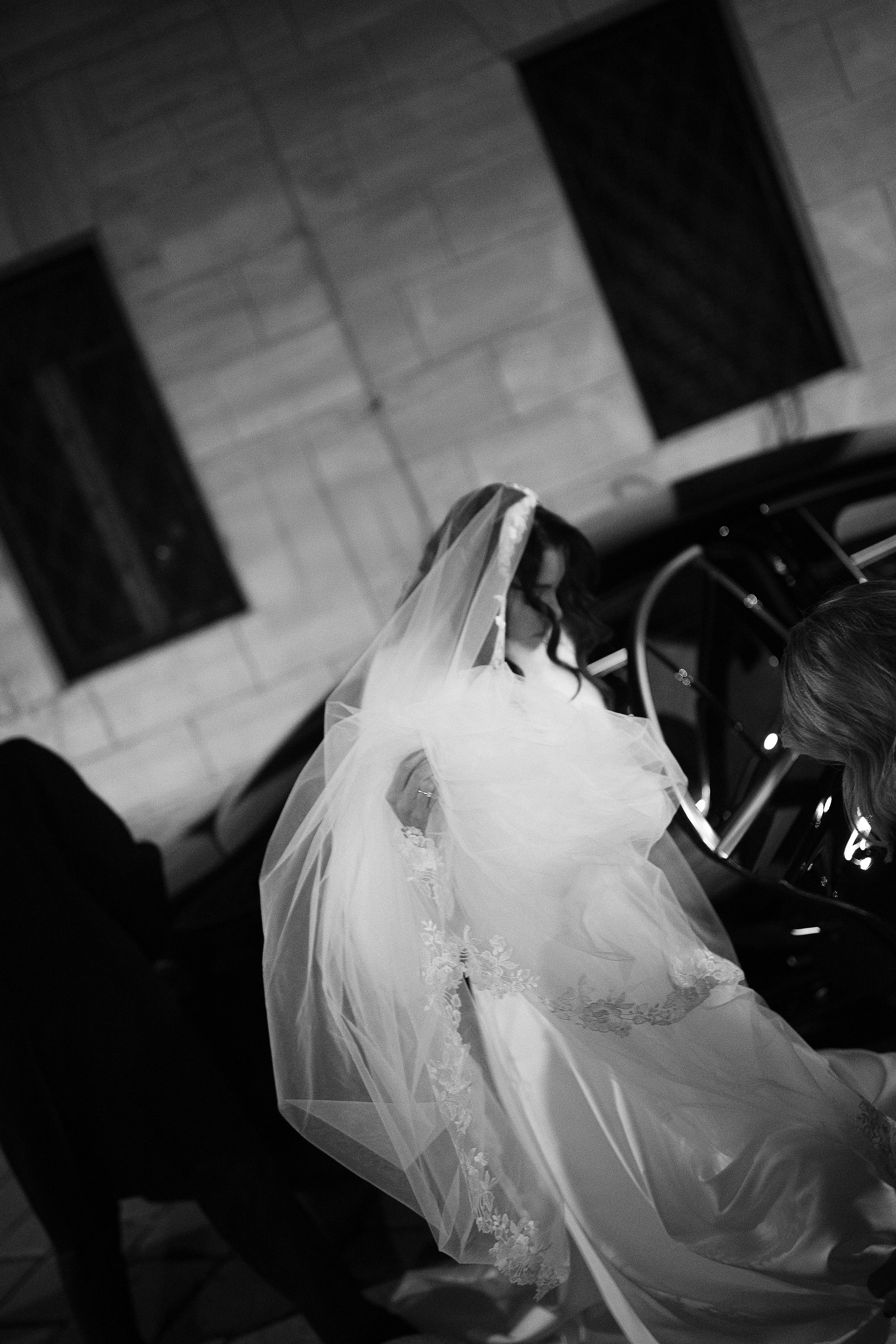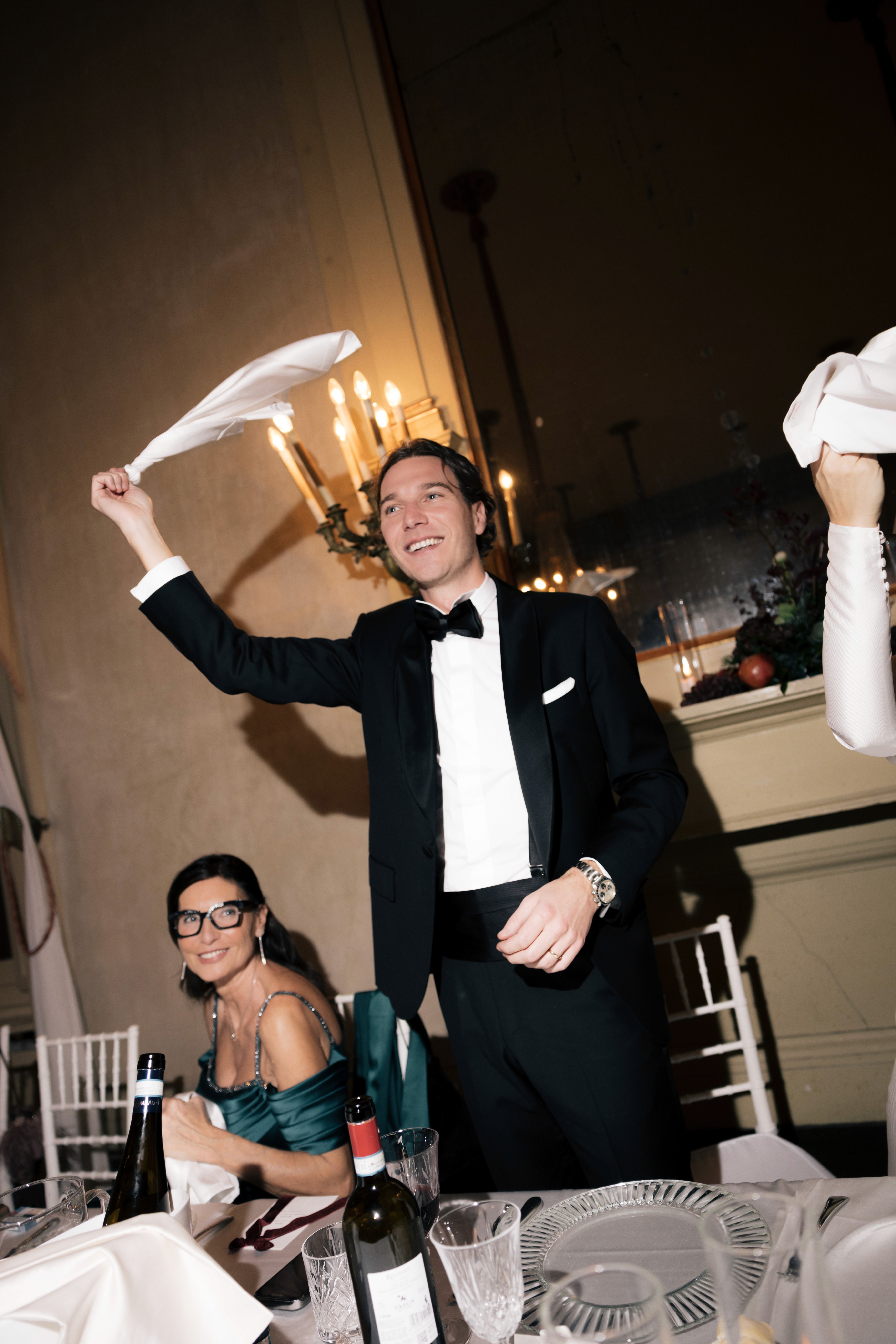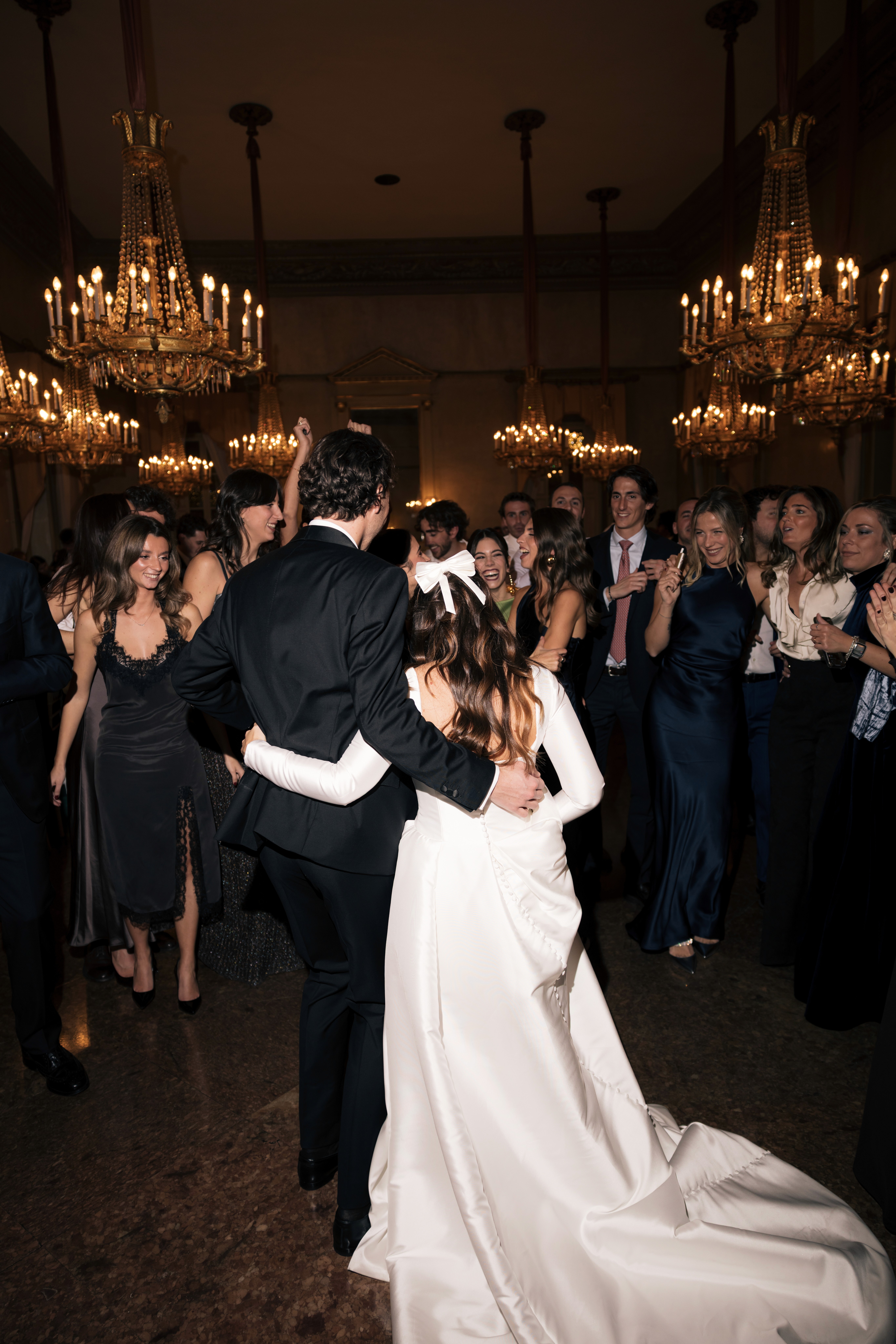 Tra le sale affrescate del Palazzo, attimi di spontaneità: un sorriso accarezzato dal trucco, mani accorte che sistemano il velo, l'abito in mikado che cattura ogni riflesso, il delicato bouquet di calle, gli ospiti che si lasciano trasportare dalla musica. La scenografica torta di bignè, protagonista dei festeggiamenti, incornicia il bacio degli sposi con vivacità e dolcezza.