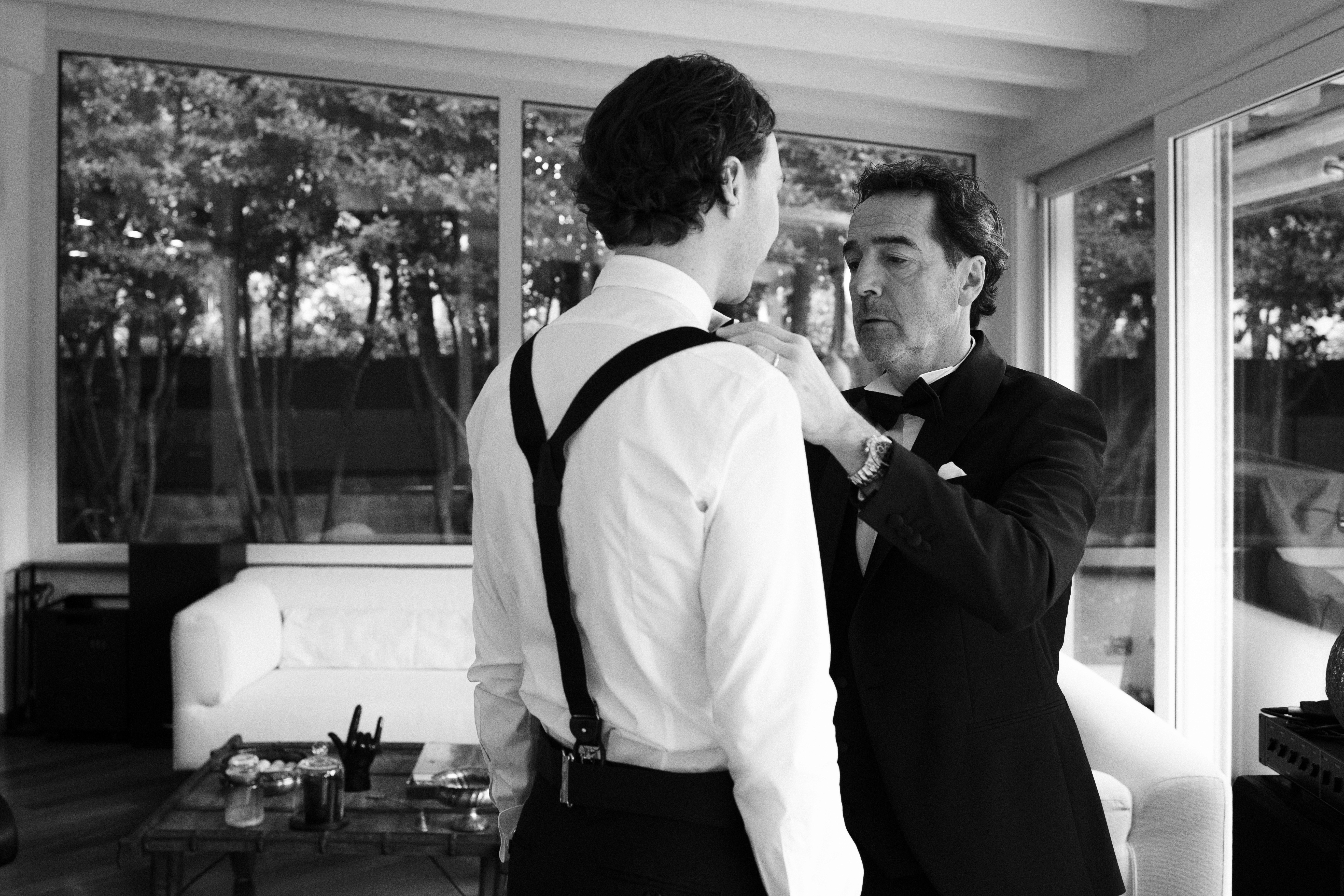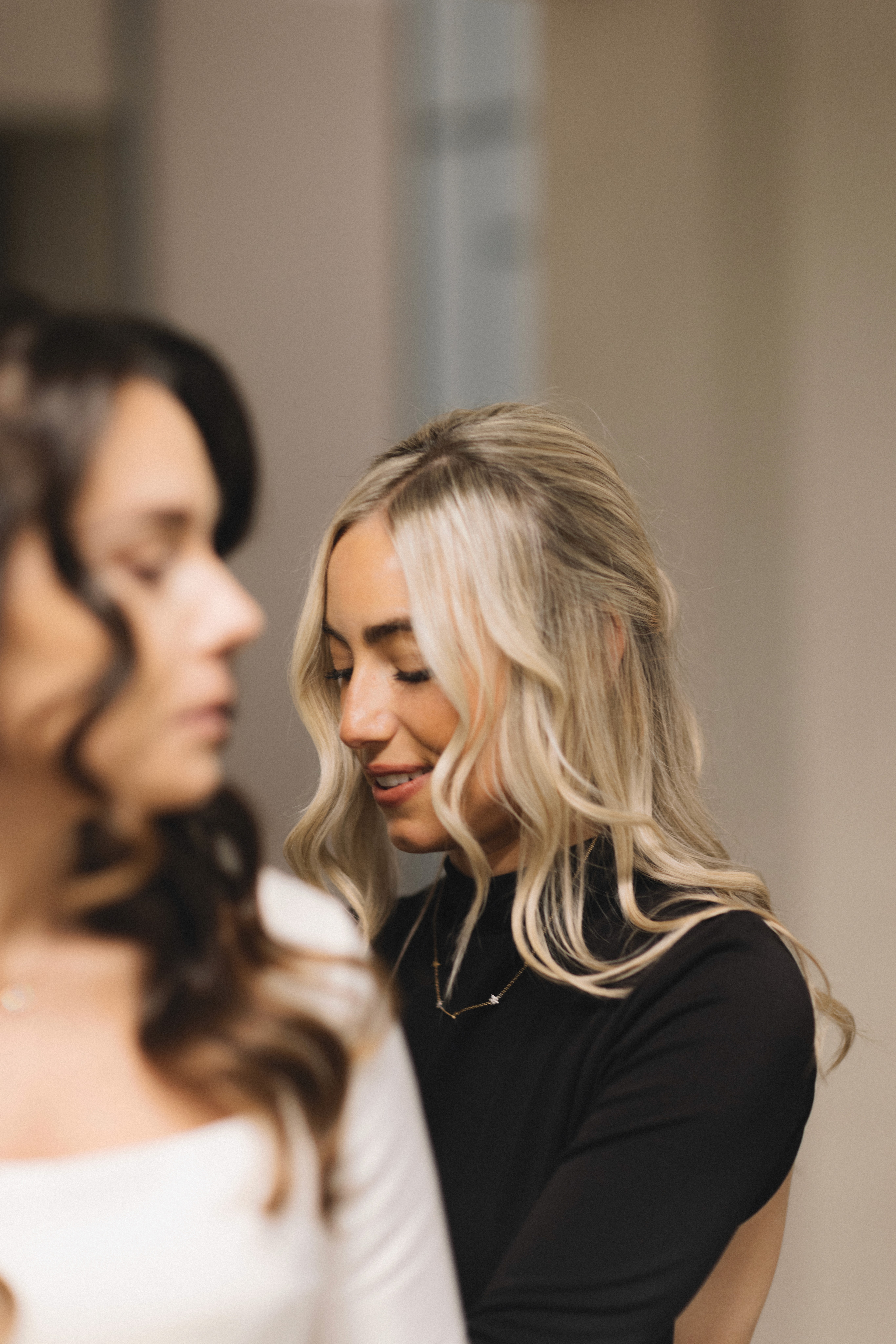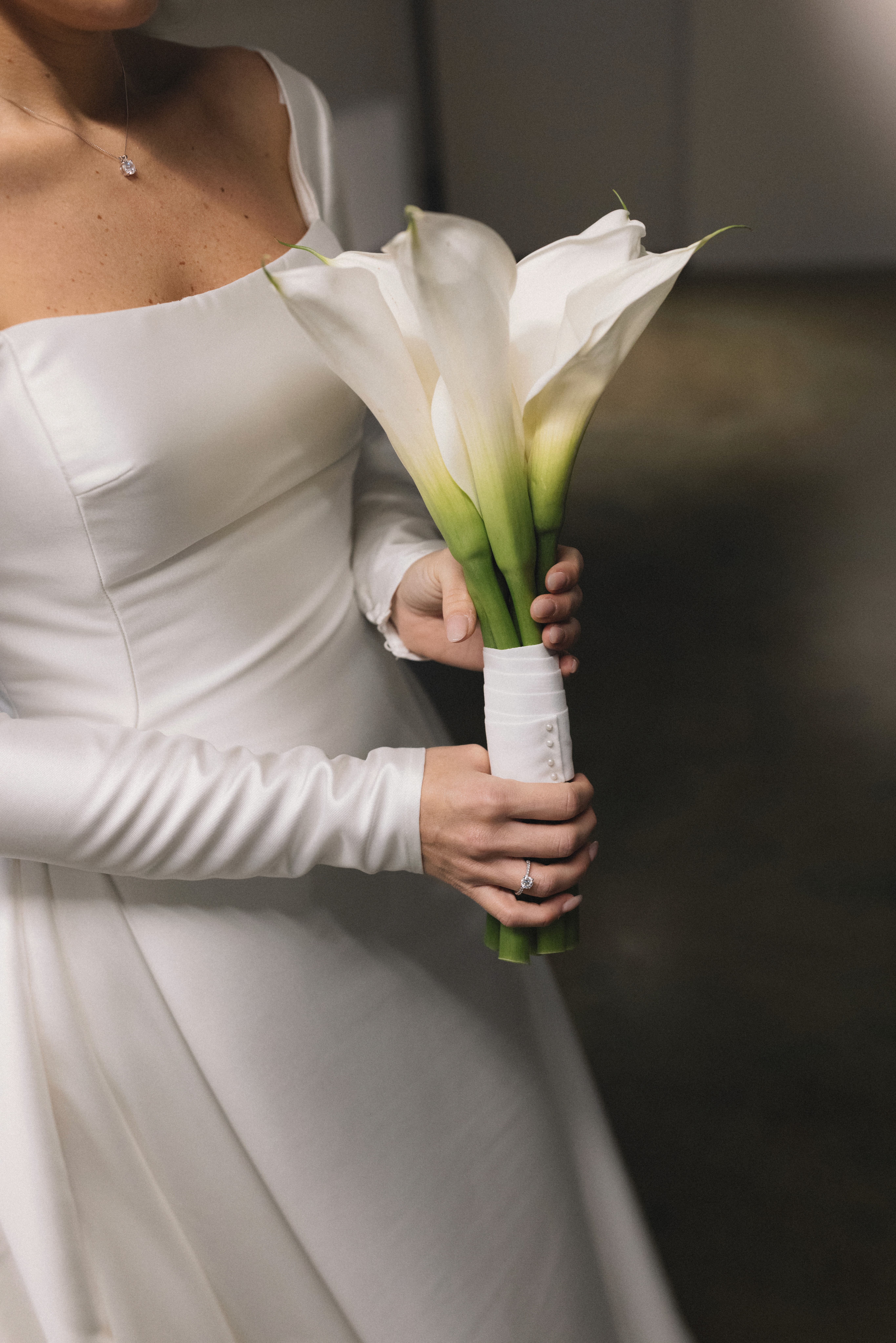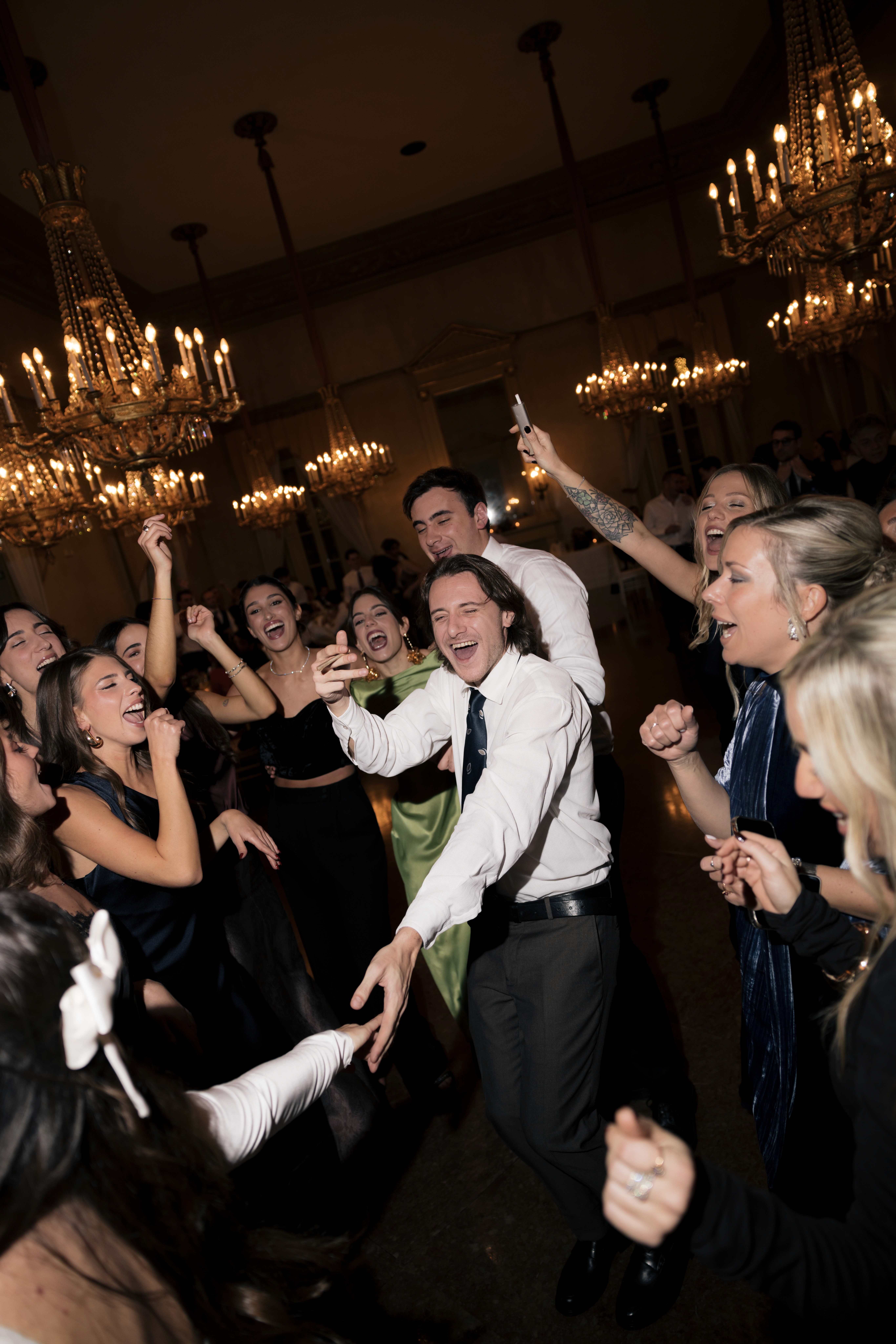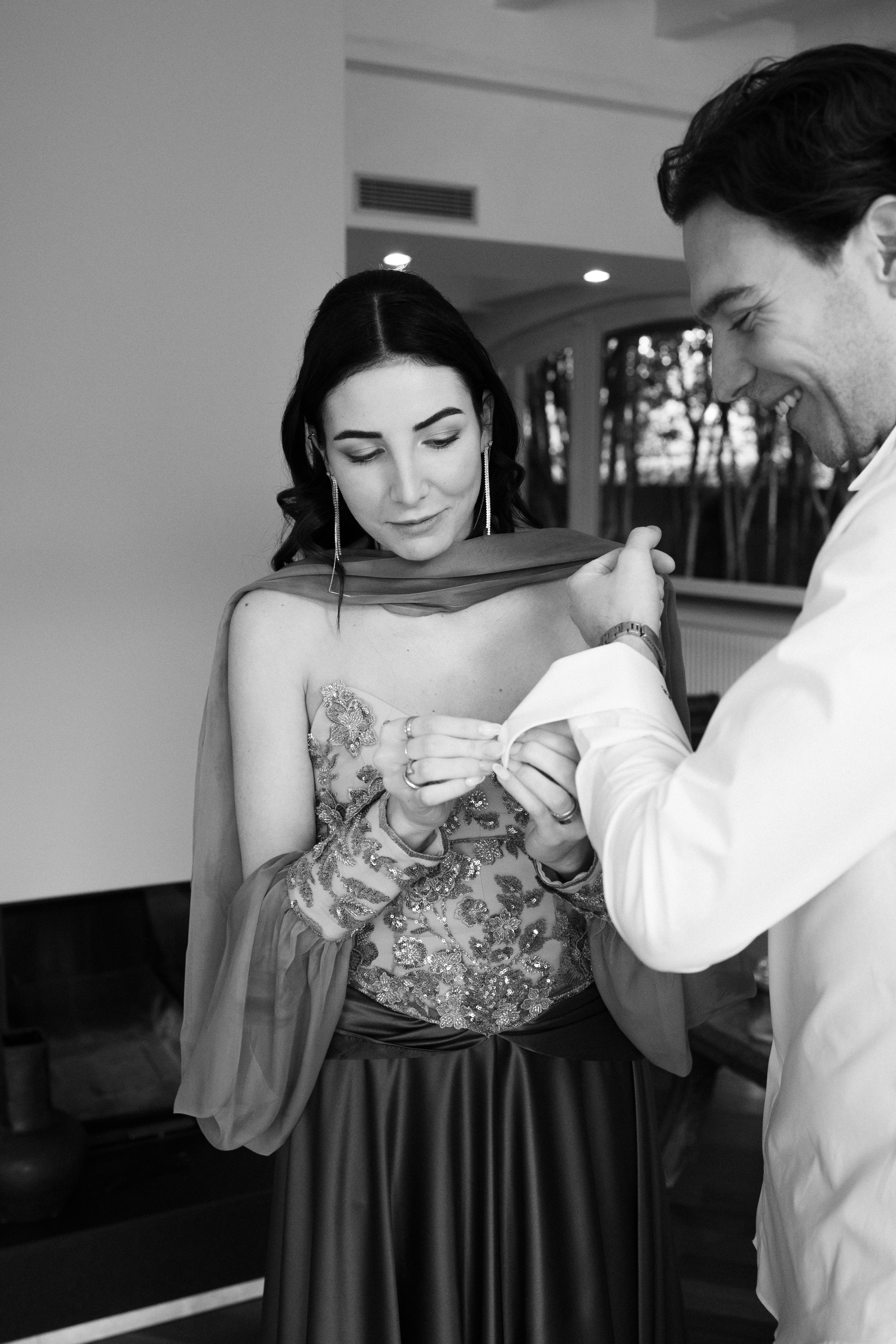 Tra le sale affrescate del Palazzo, attimi di spontaneità: un sorriso accarezzato dal trucco, mani accorte che sistemano il velo, l'abito in mikado che cattura ogni riflesso, il delicato bouquet di calle, gli ospiti che si lasciano trasportare dalla musica. La scenografica torta di bignè, protagonista dei festeggiamenti, incornicia il bacio degli sposi con vivacità e dolcezza.