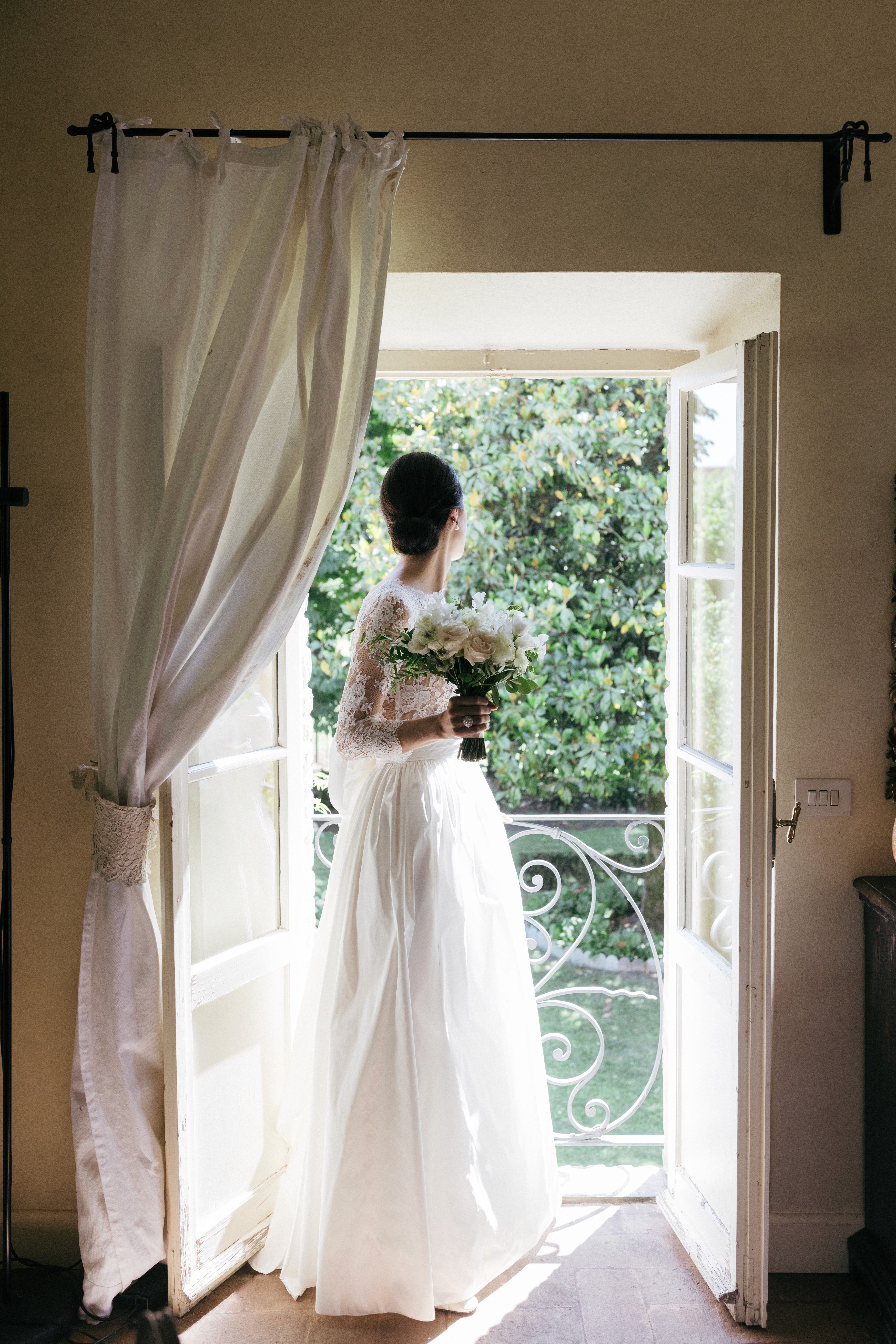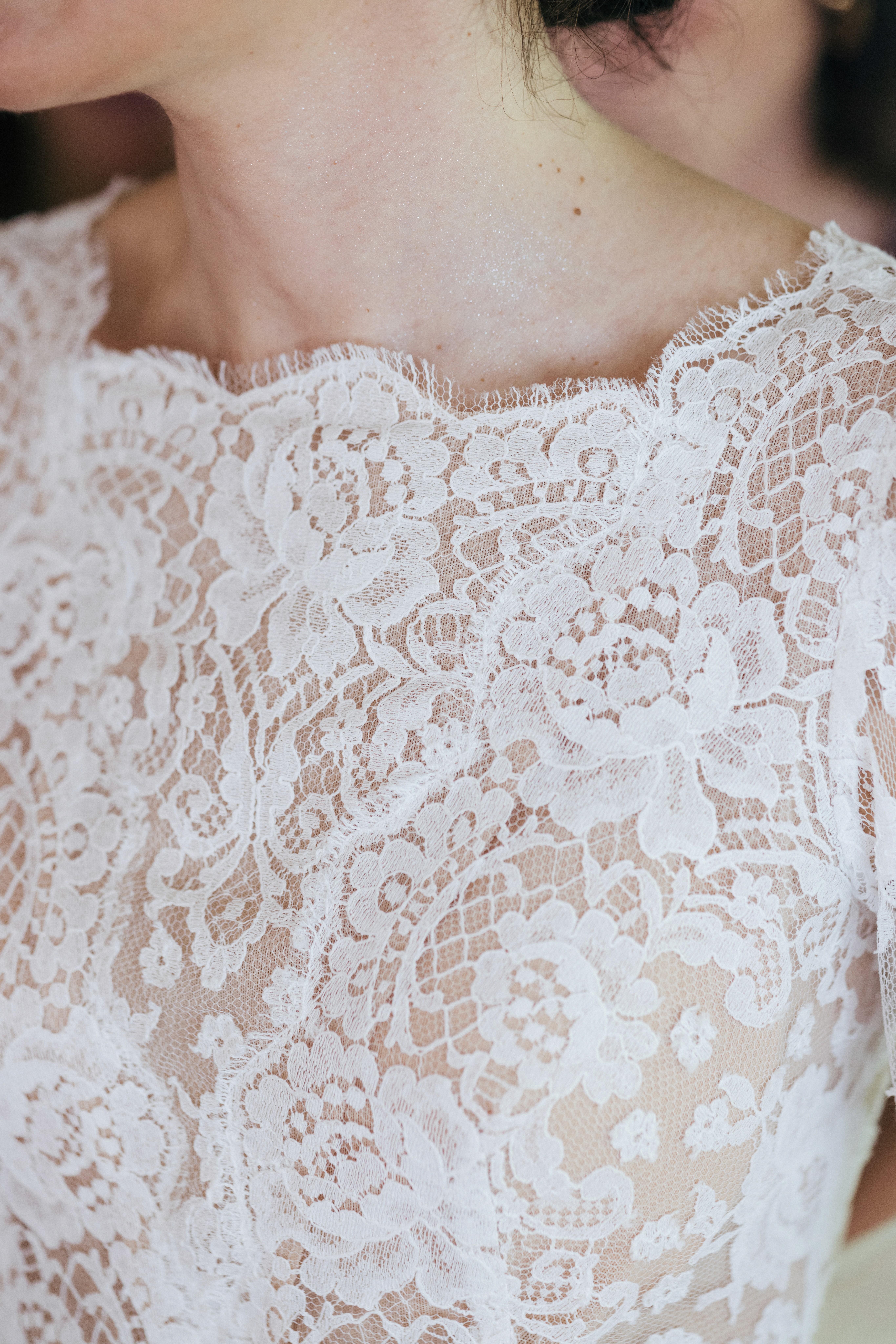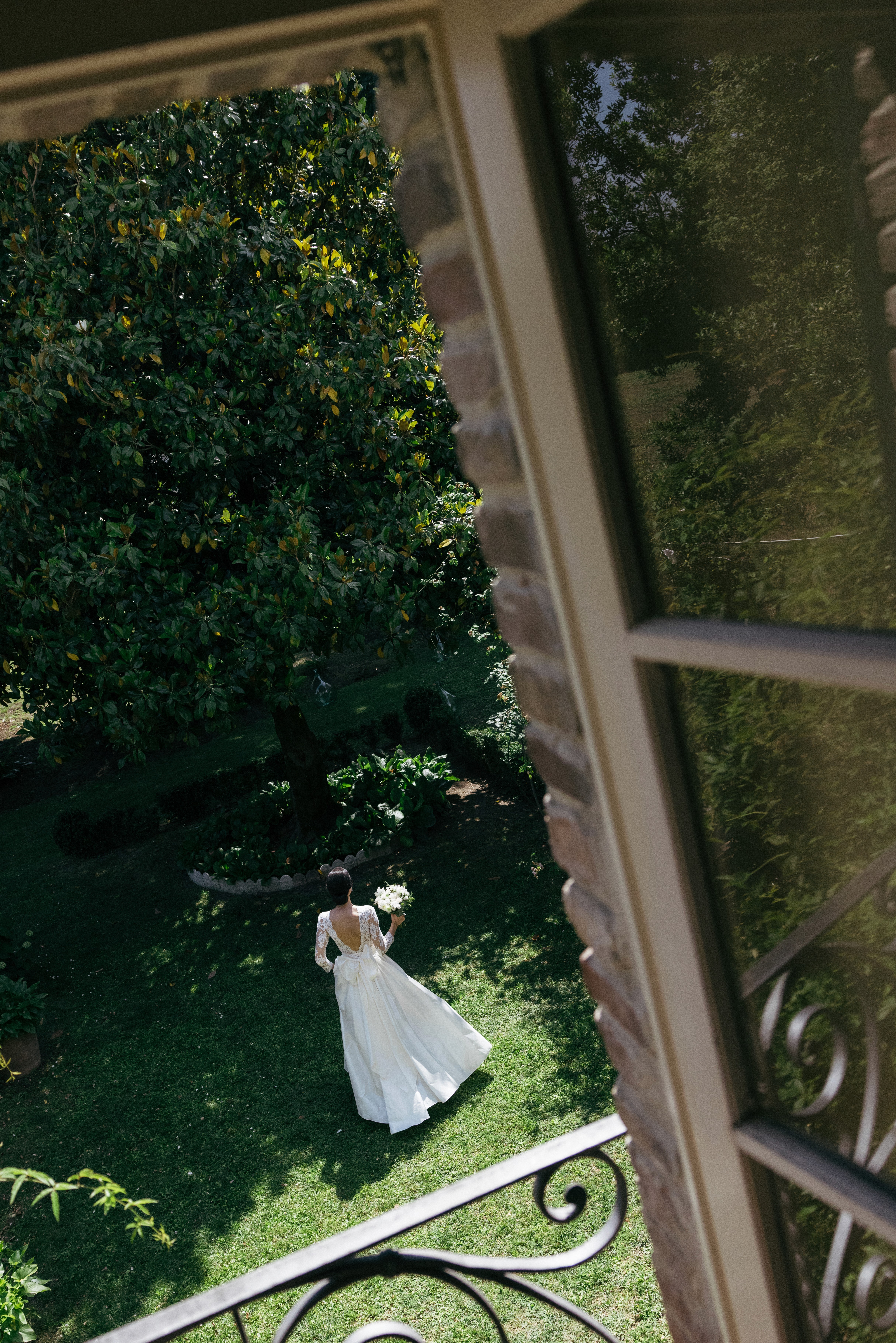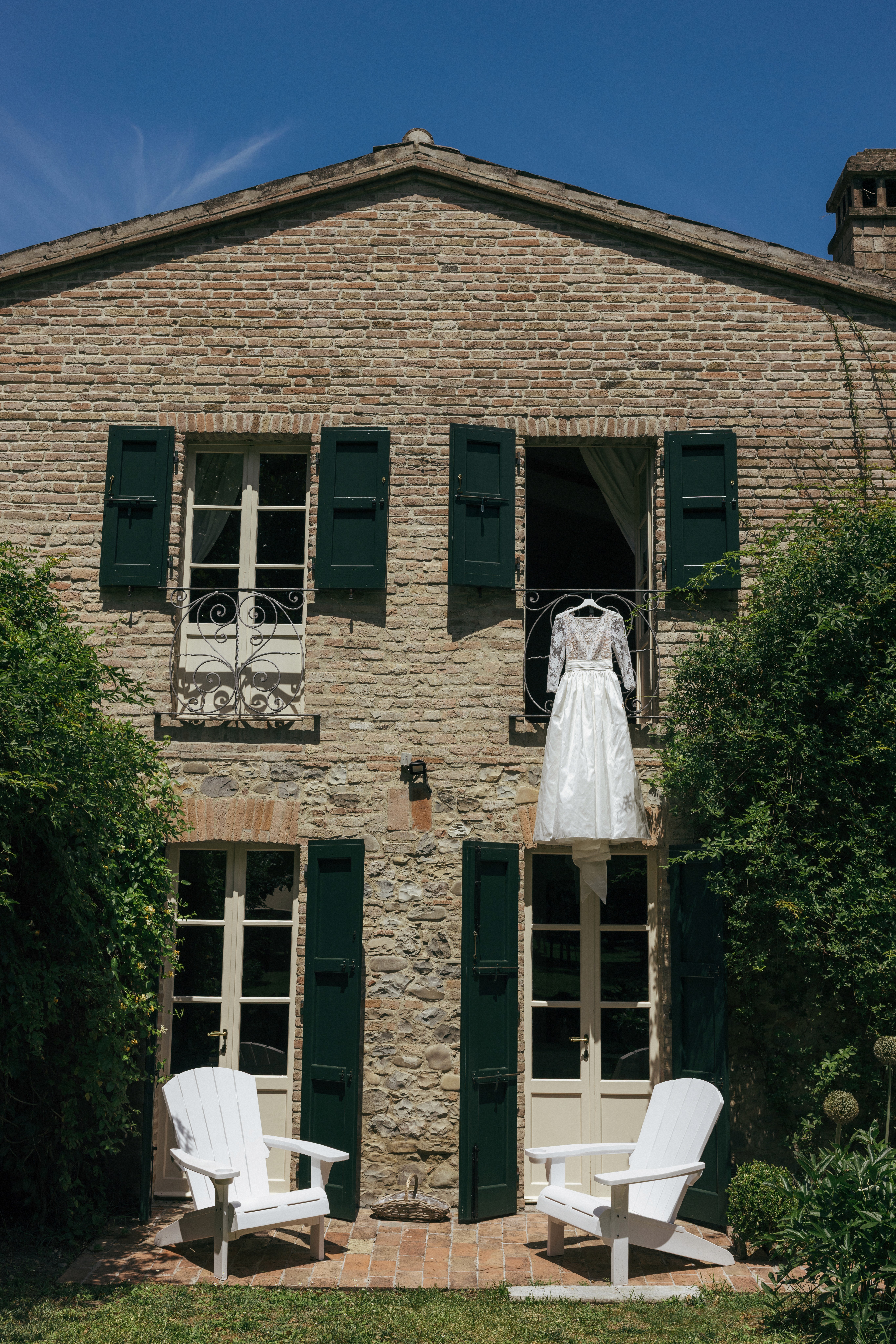 Il 31 maggio ha la nitidezza delle giornate che non chiedono nulla di più. L'abito attende sospeso alla finestra, disegnando una verticale leggera contro la facciata; dentro, il pizzo racconta la sua trama da vicino, tra nodi stretti con cura e trasparenze che sfiorano la pelle. Ogni dettaglio è una linea che guida lo sguardo.