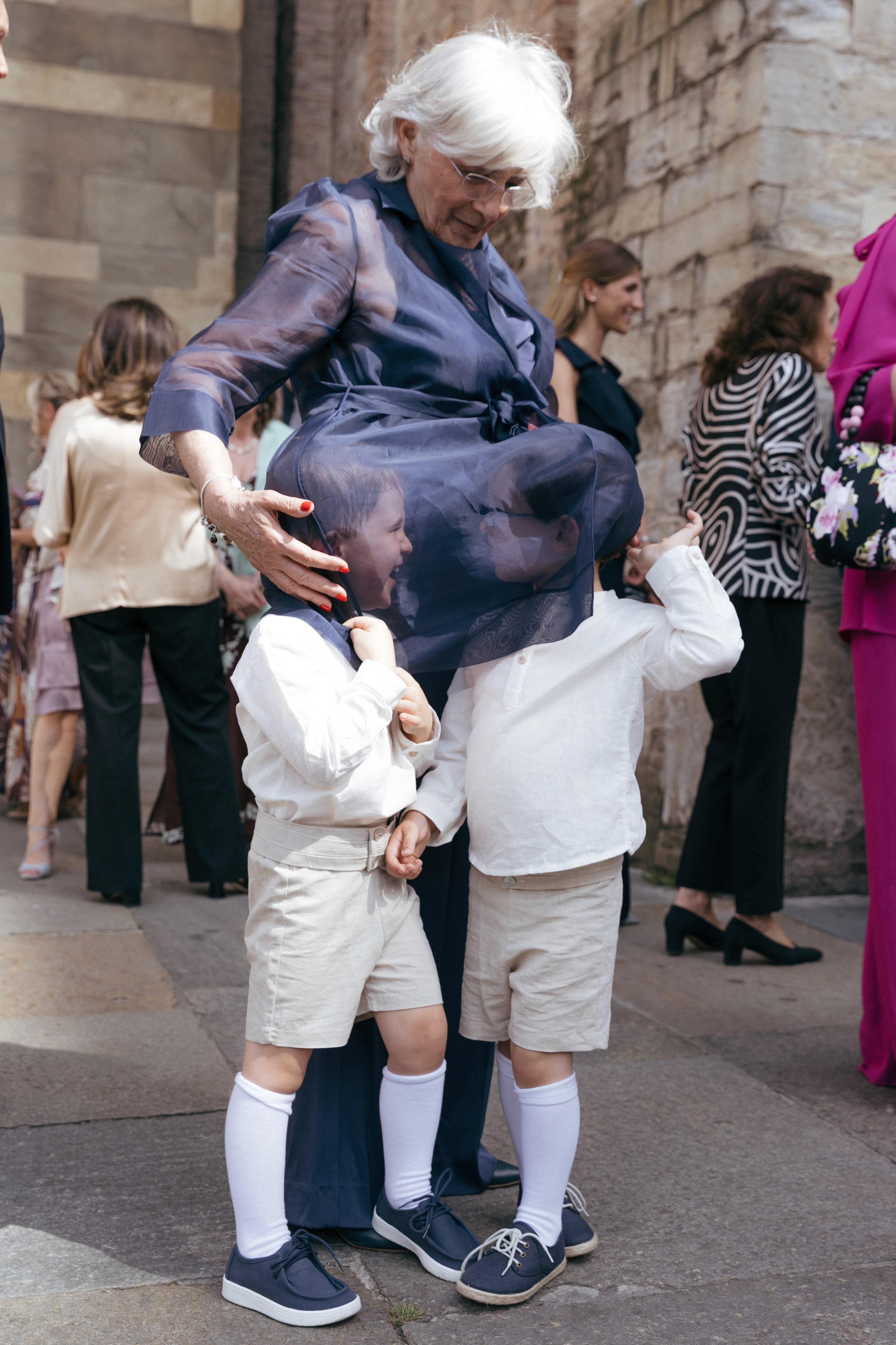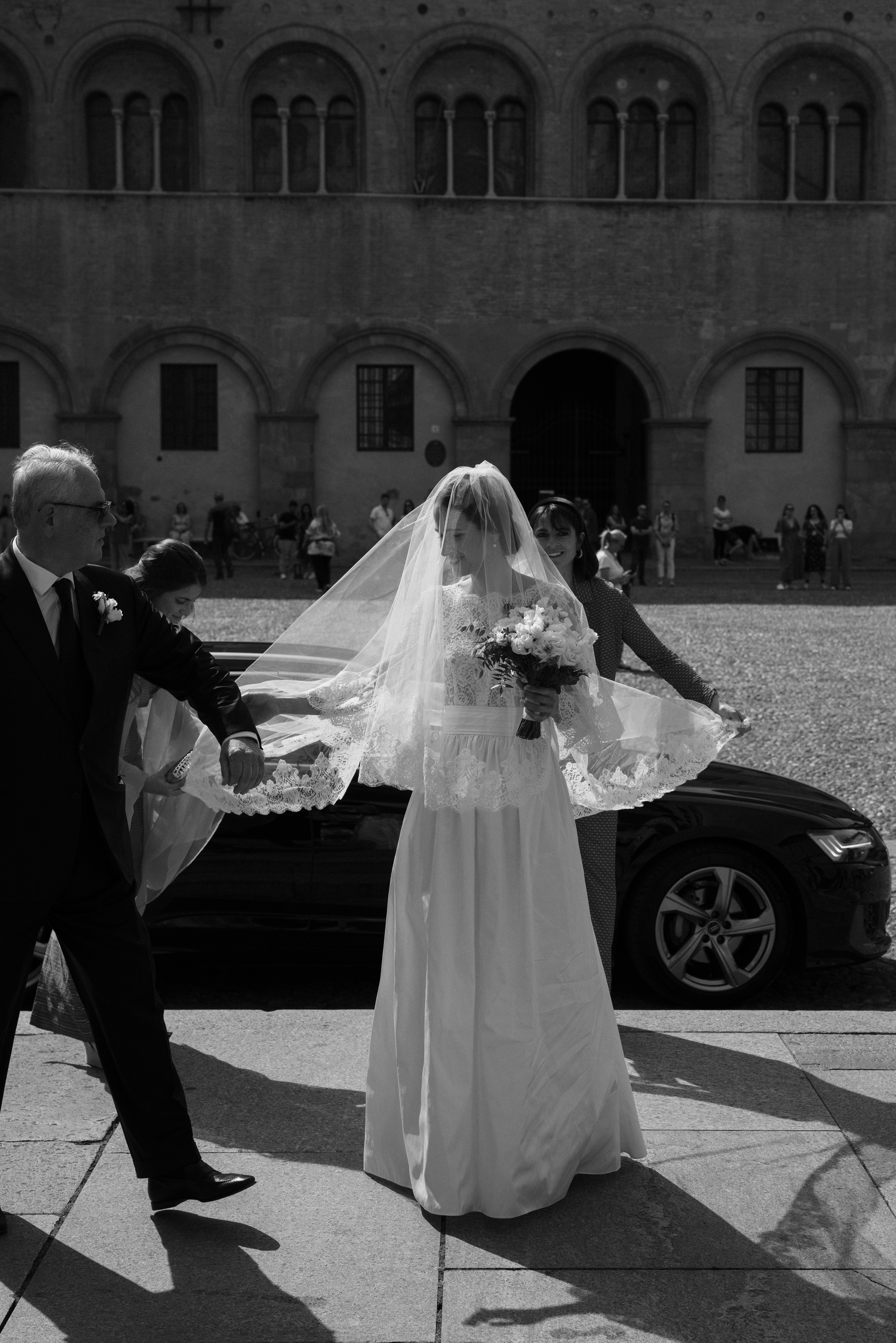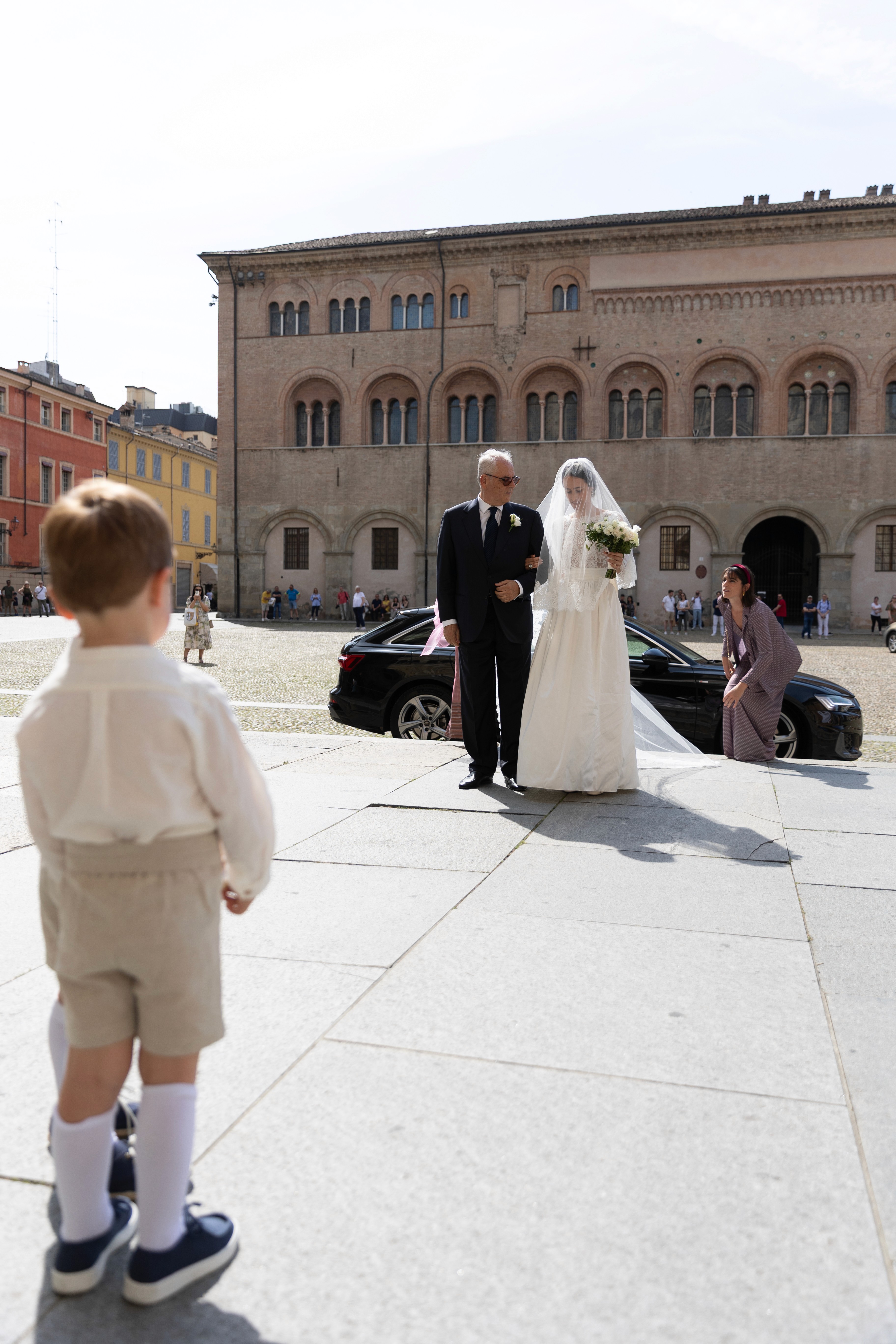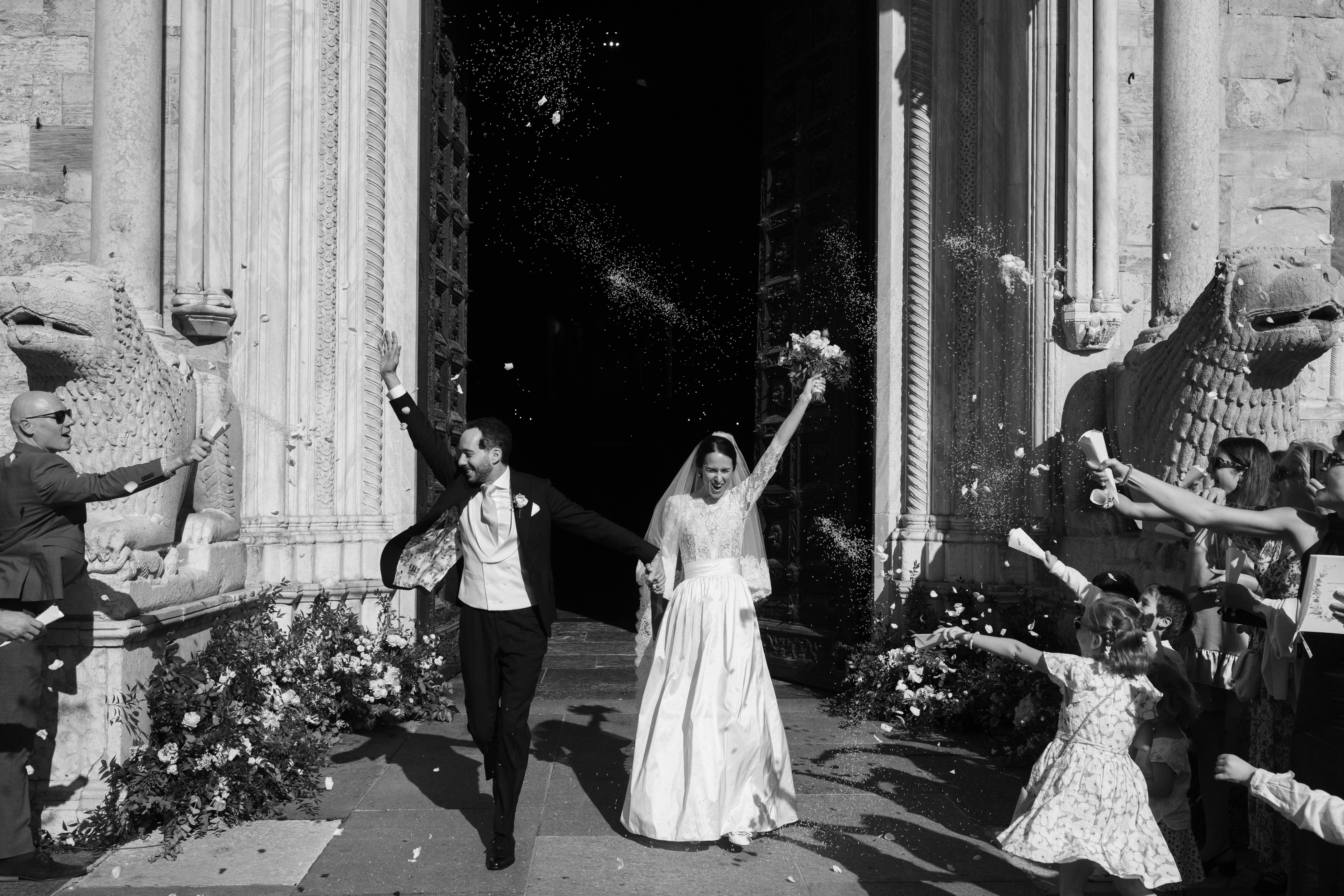 Poi il varco della chiesa: l'ombra incornicia, il bianco esplode oltre la soglia. Maria Virginia e Guillaume avanzano tra mani alzate e petali in volo, controluce netto che scolpisce i profili e trasforma il gesto in icona.