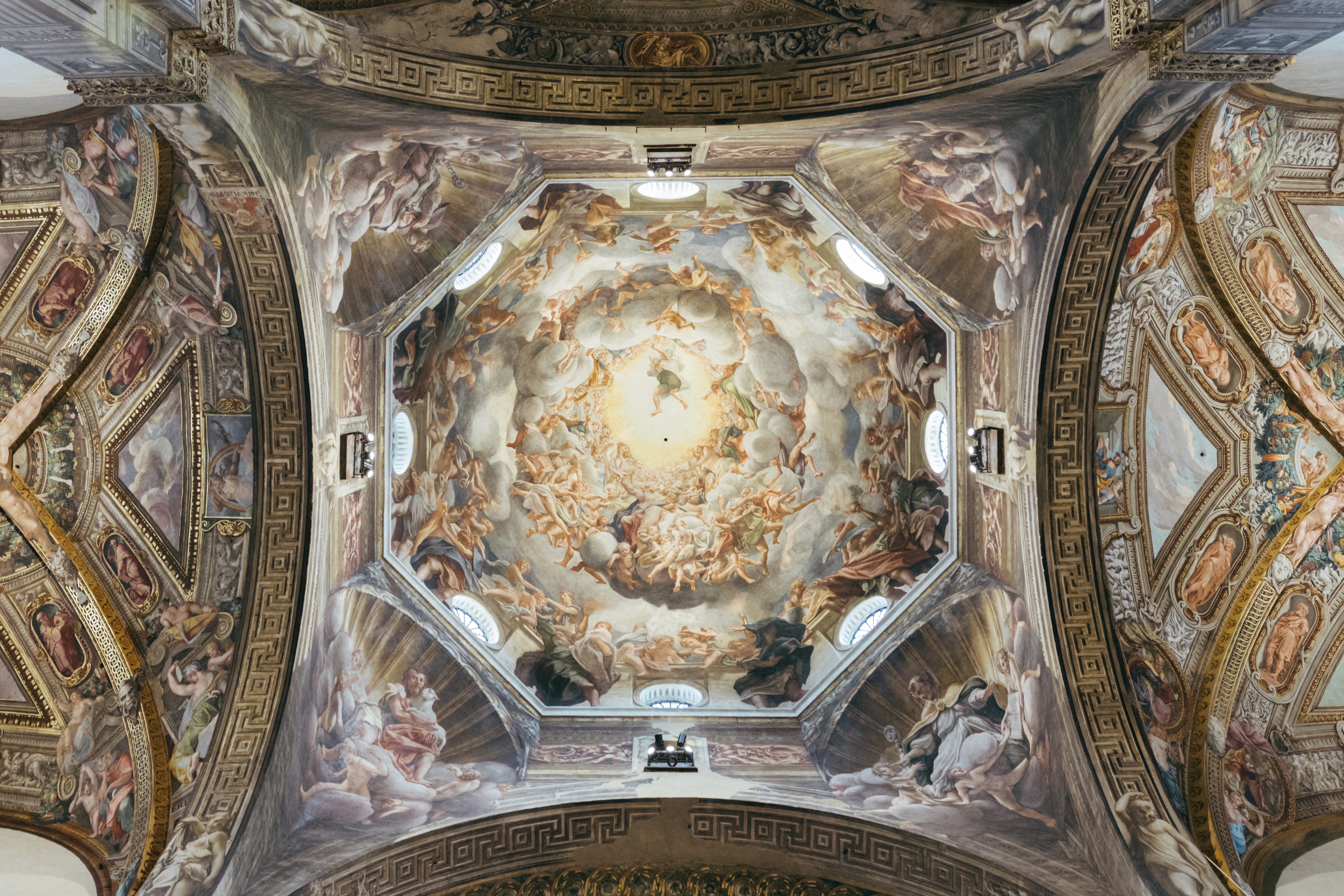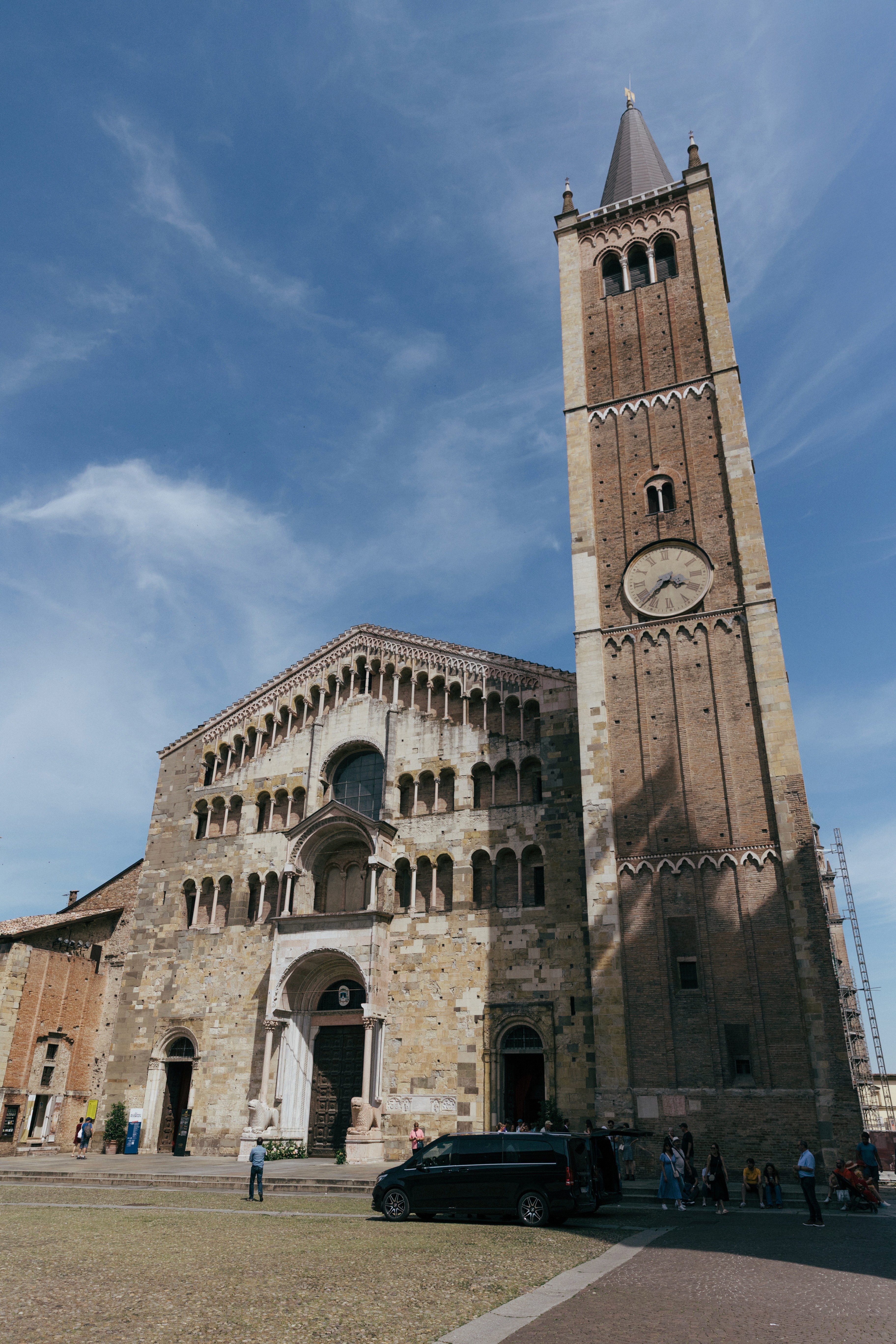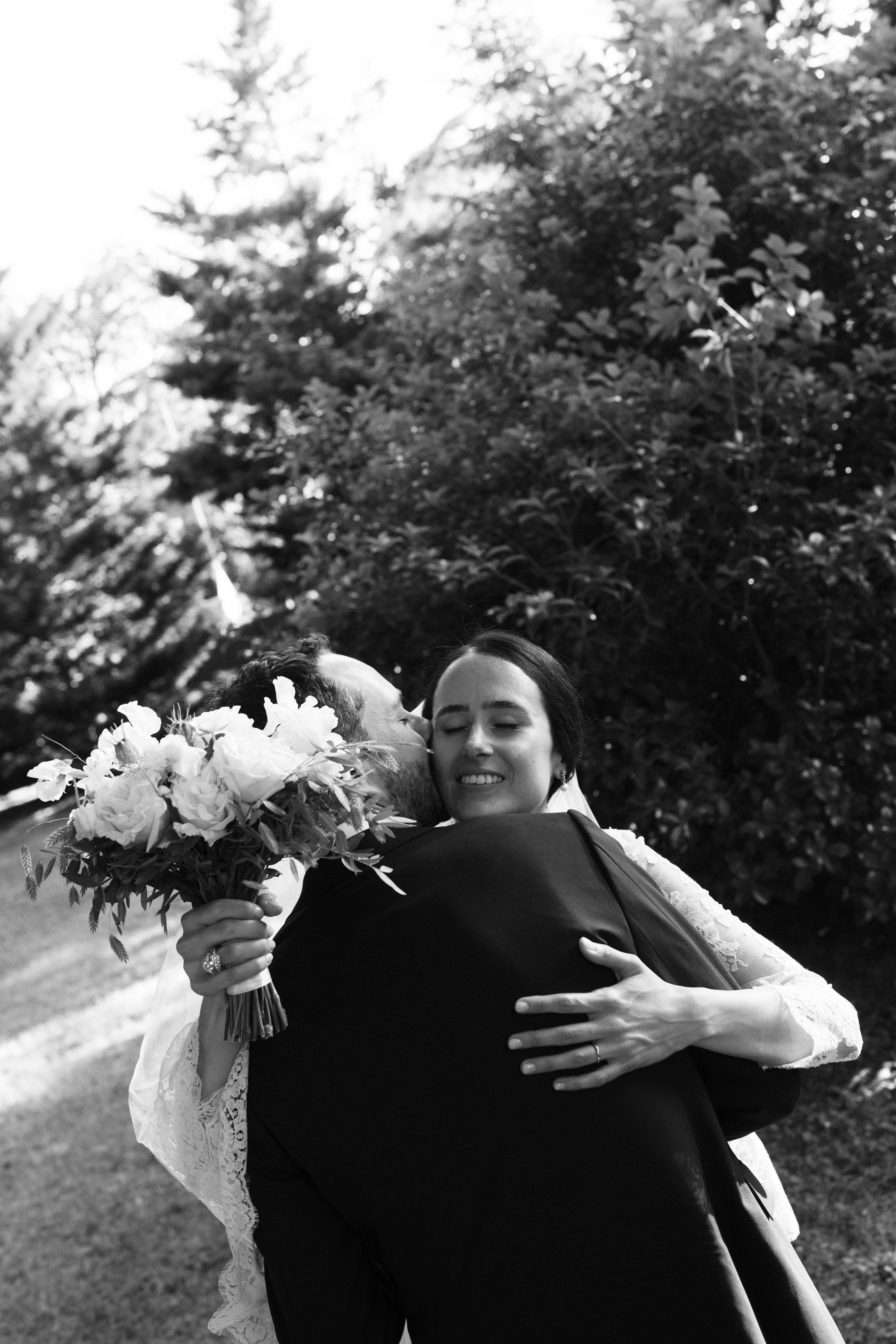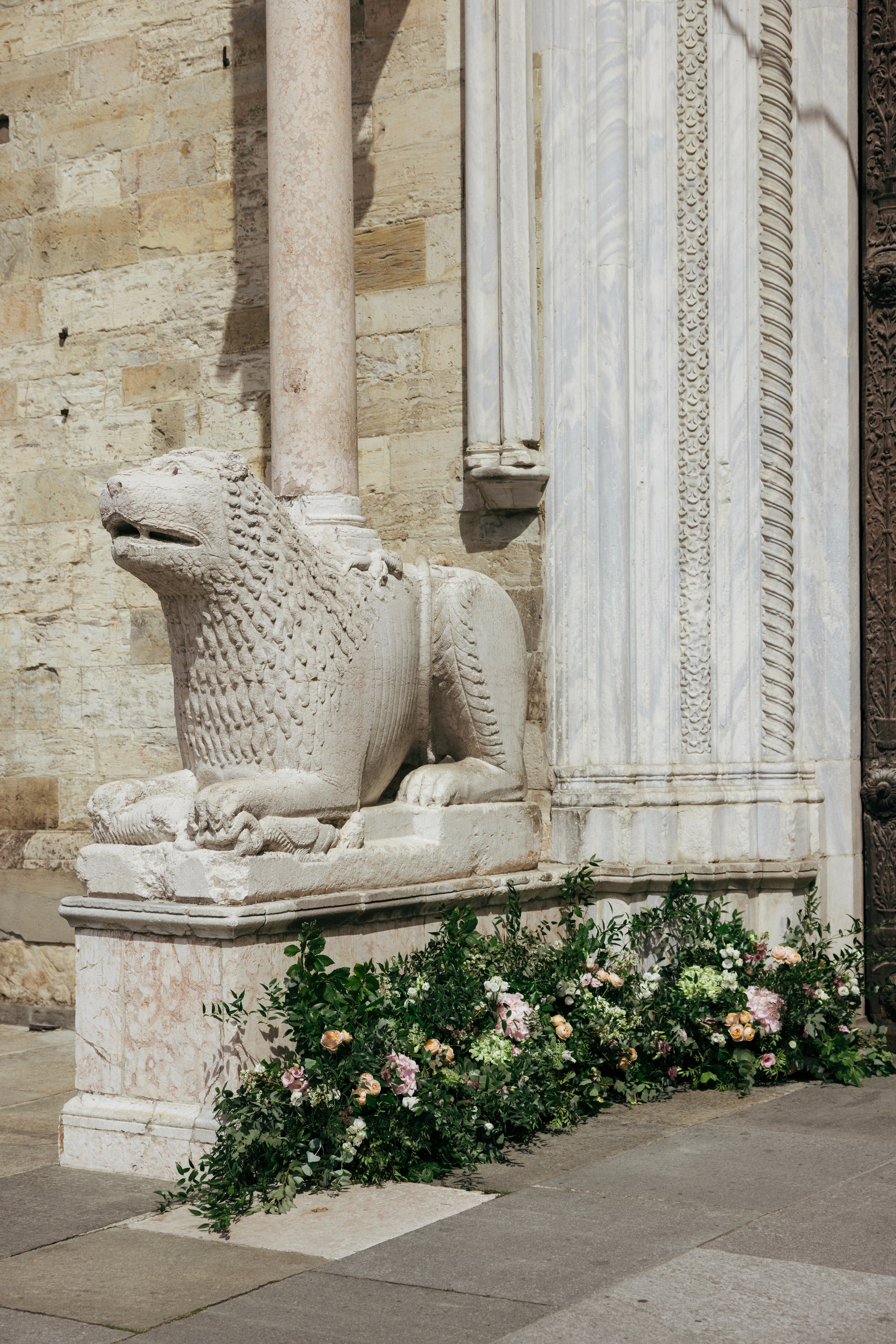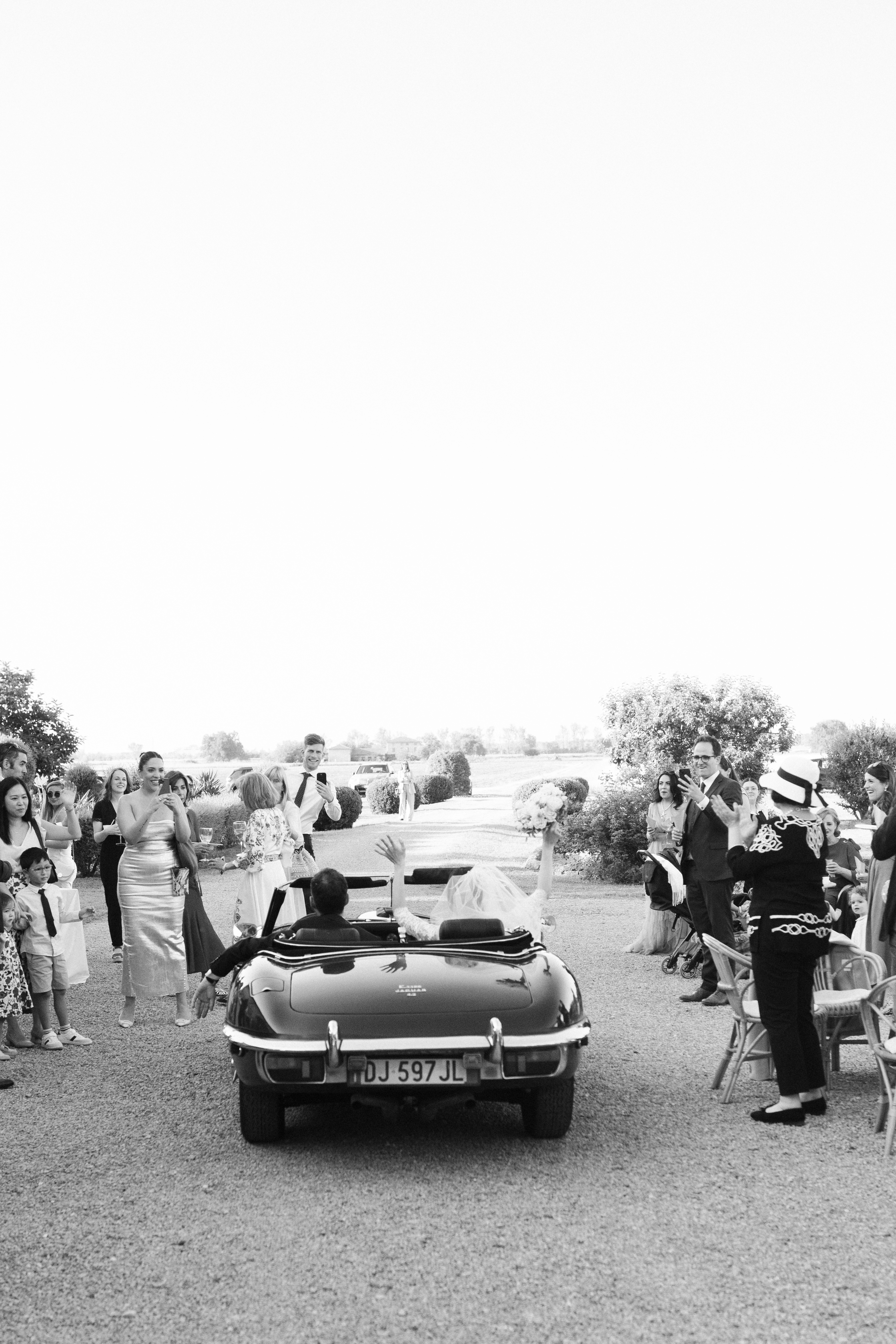 Poi il varco della chiesa: l'ombra incornicia, il bianco esplode oltre la soglia. Maria Virginia e Guillaume avanzano tra mani alzate e petali in volo, controluce netto che scolpisce i profili e trasforma il gesto in icona.