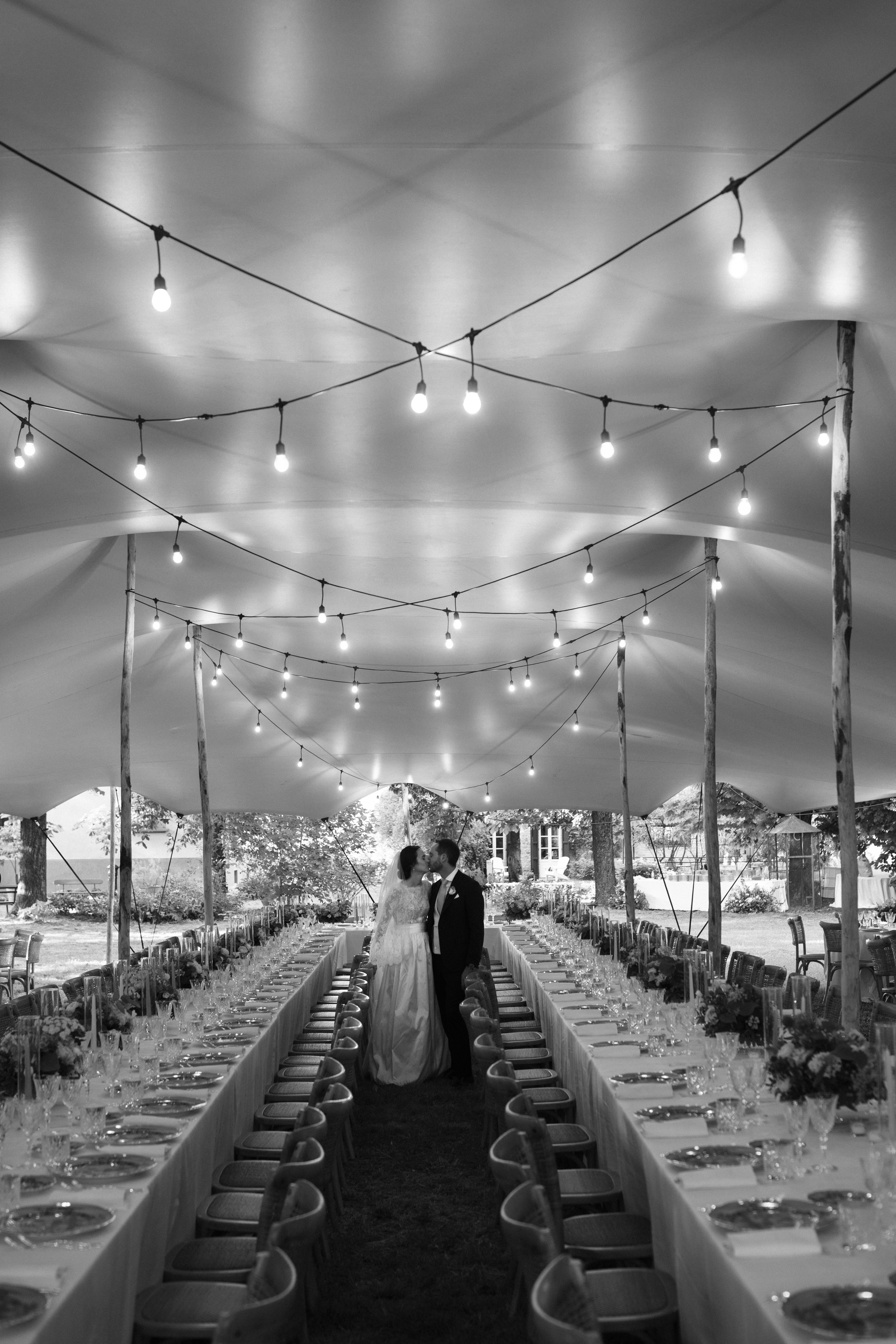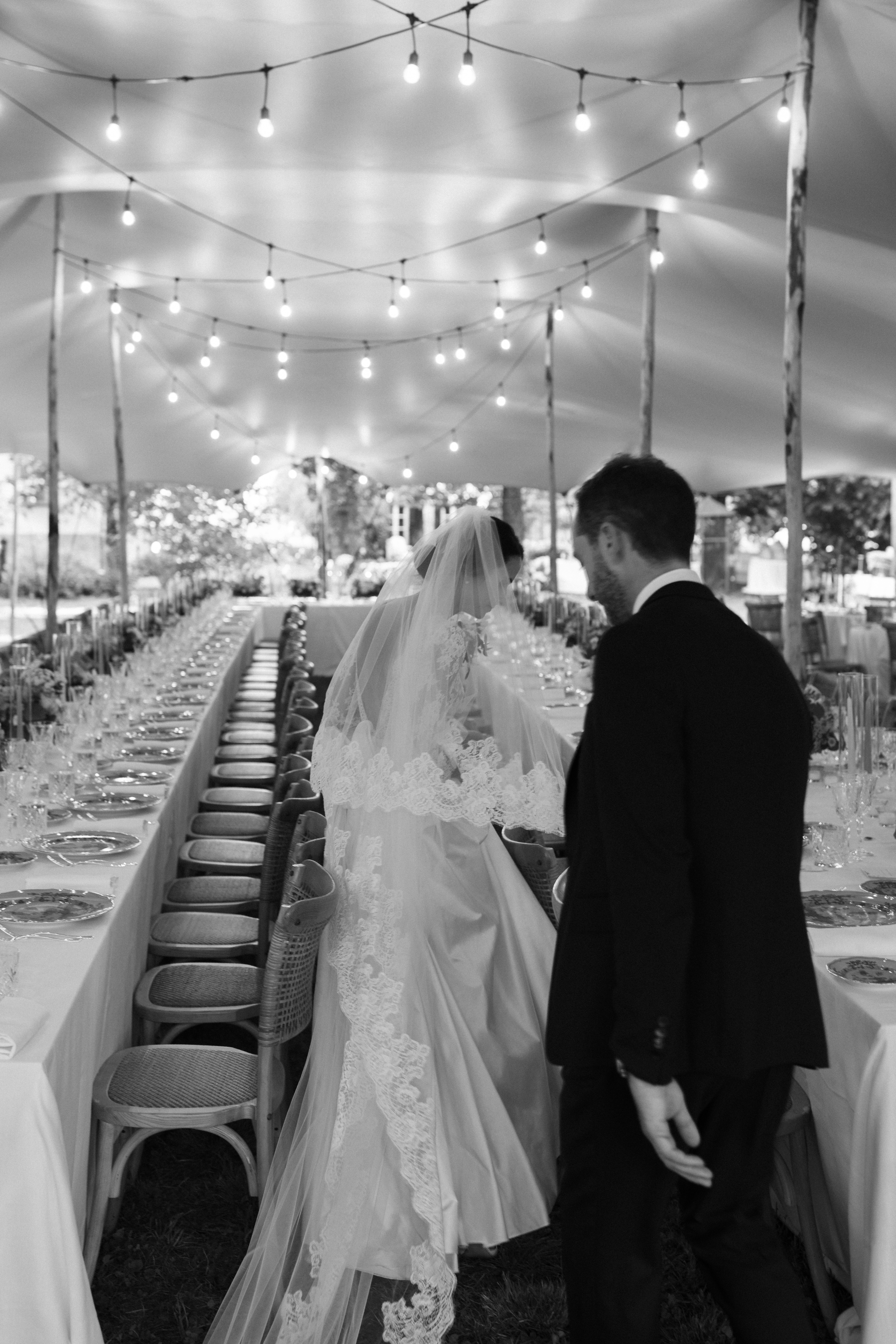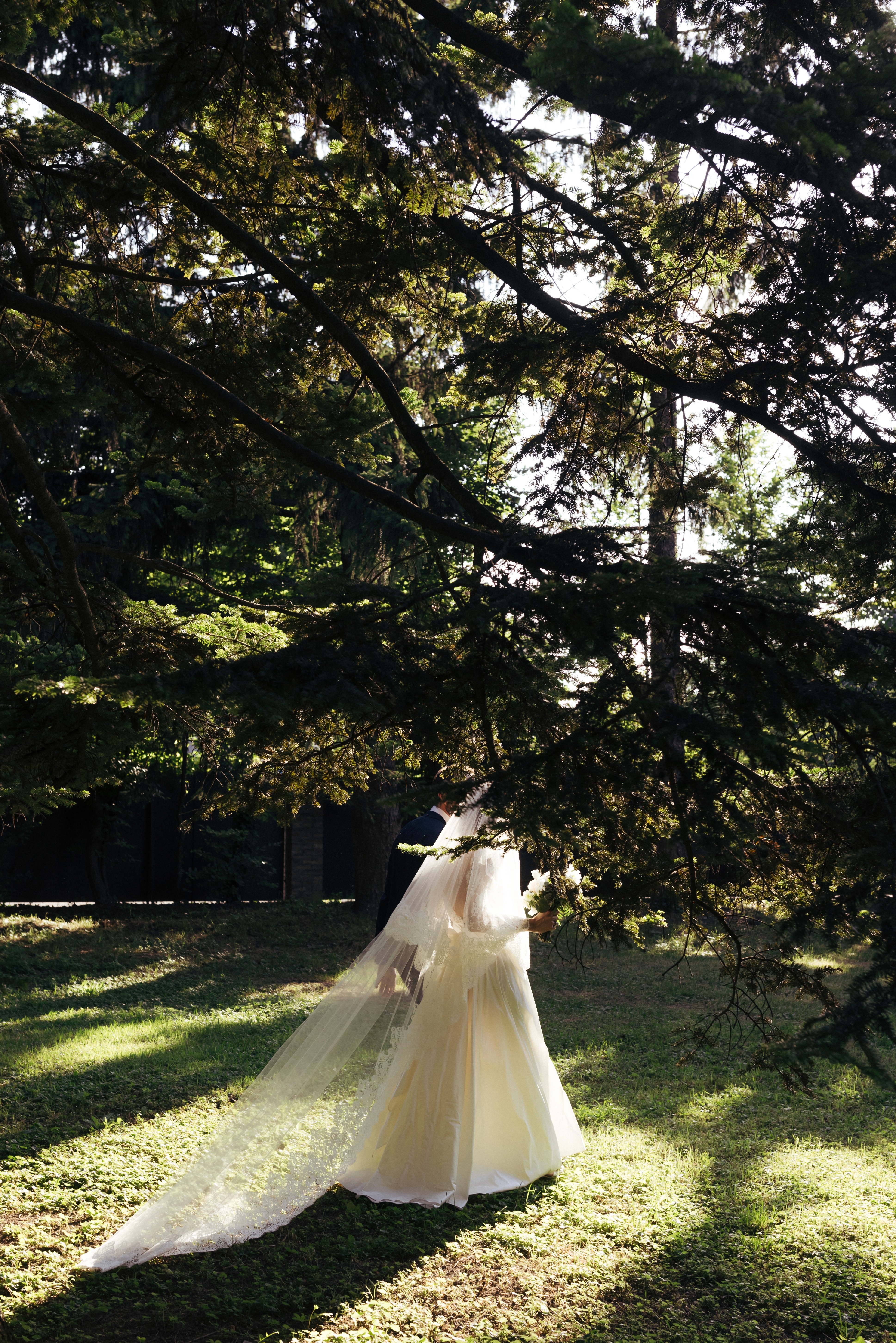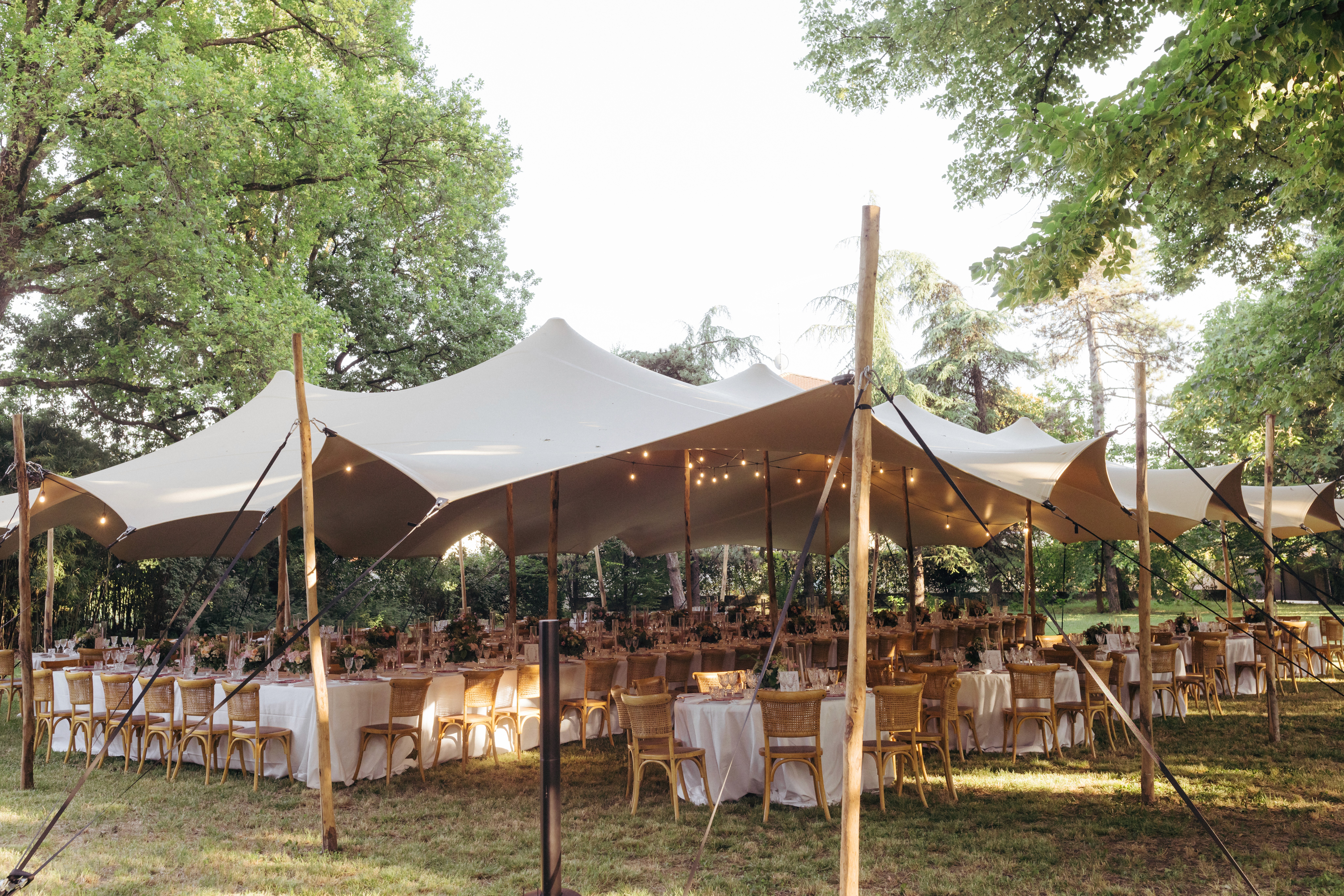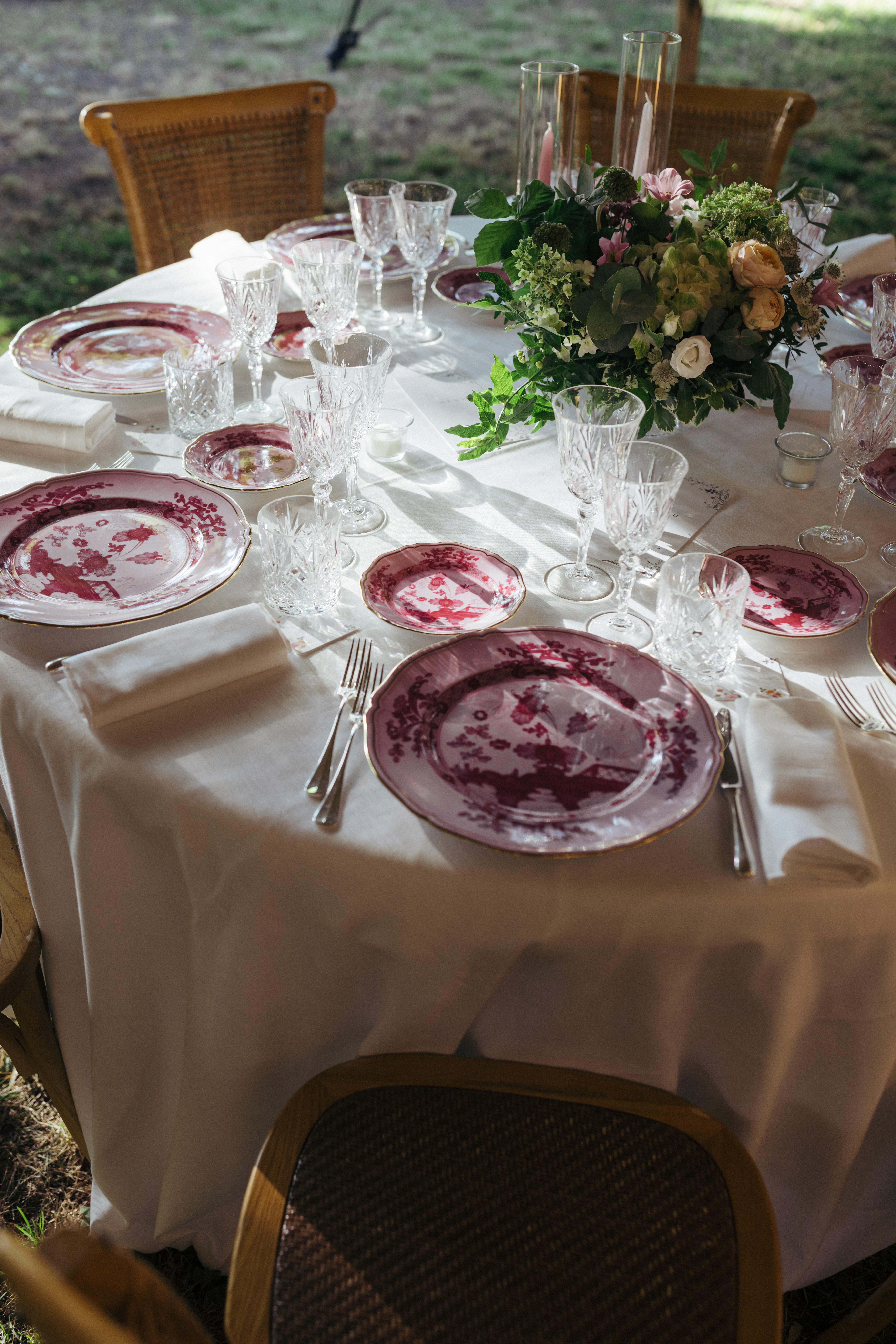 Nel giardino, il velo si distende come una scia luminosa tra gli alberi. La tavola si accende di riflessi rosati, cristalli e candele moltiplicano bagliori.