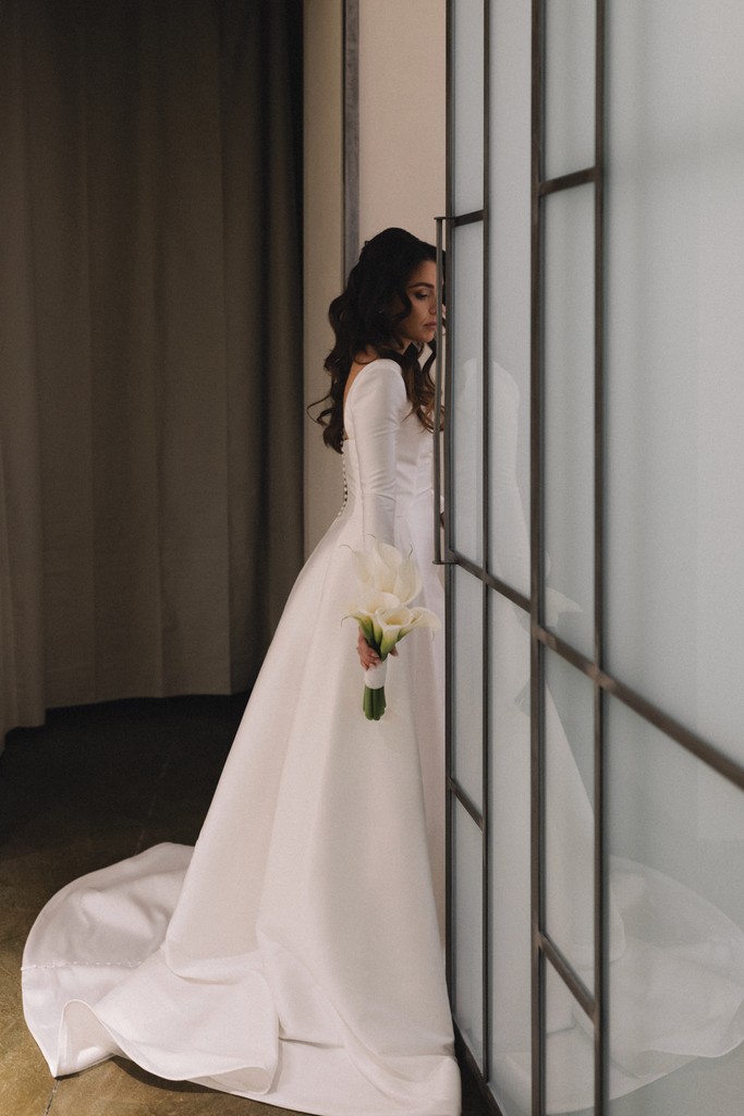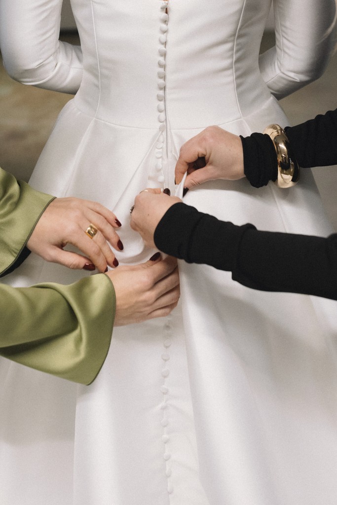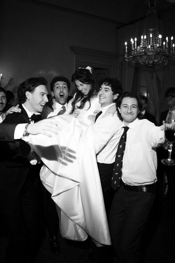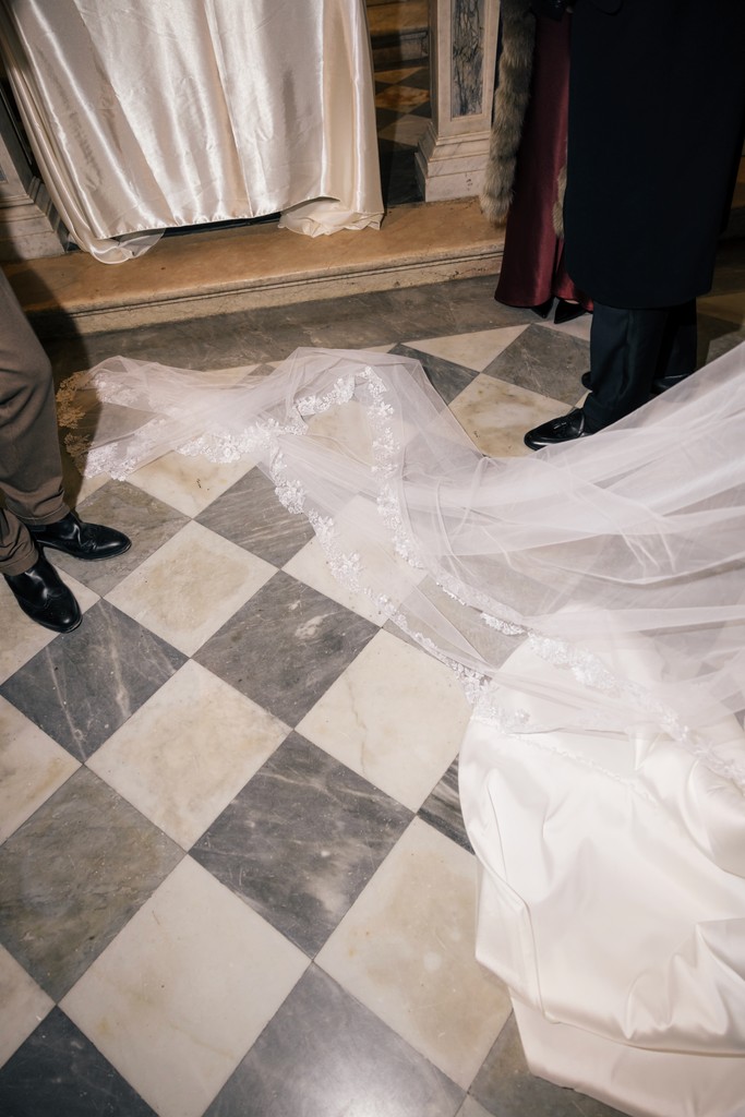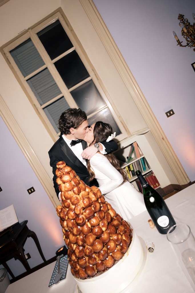 Tra le sale affrescate del Palazzo, attimi di spontaneità: un sorriso accarezzato dal trucco, mani accorte che sistemano il velo, l'abito in mikado che cattura ogni riflesso, il delicato bouquet di calle, gli ospiti che si lasciano trasportare dalla musica. La scenografica torta di bignè, protagonista dei festeggiamenti, incornicia il bacio degli sposi con vivacità e dolcezza.