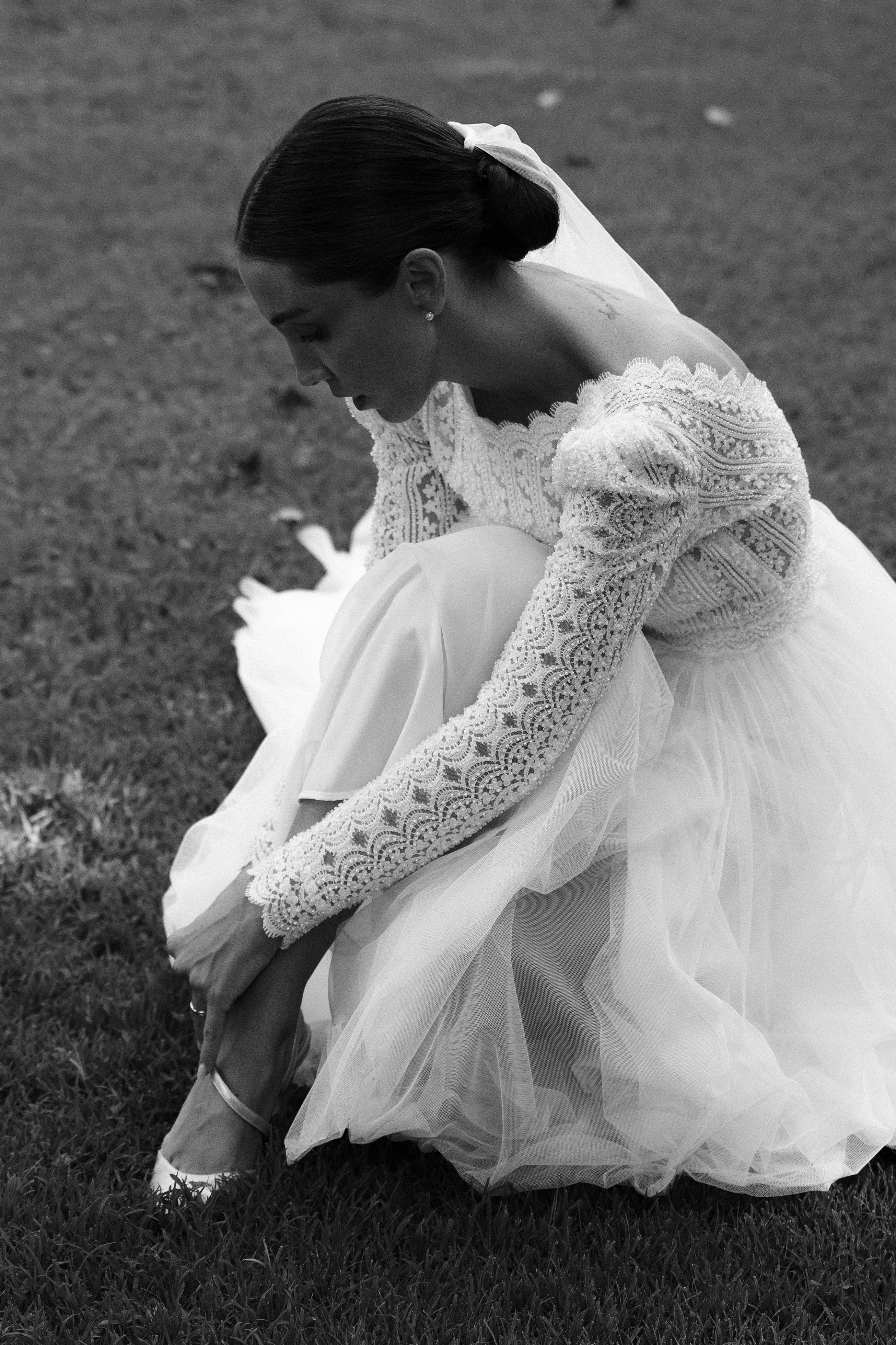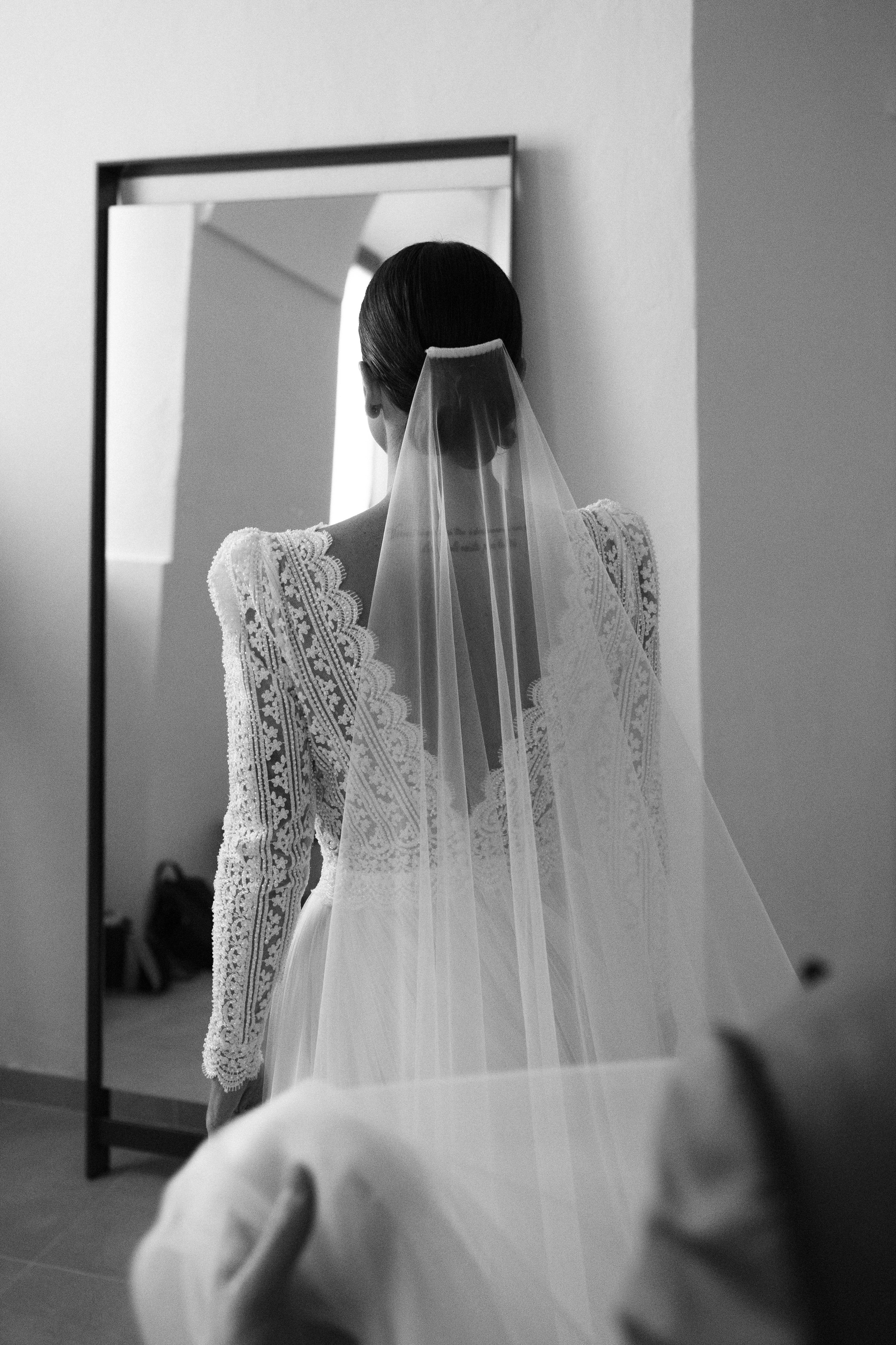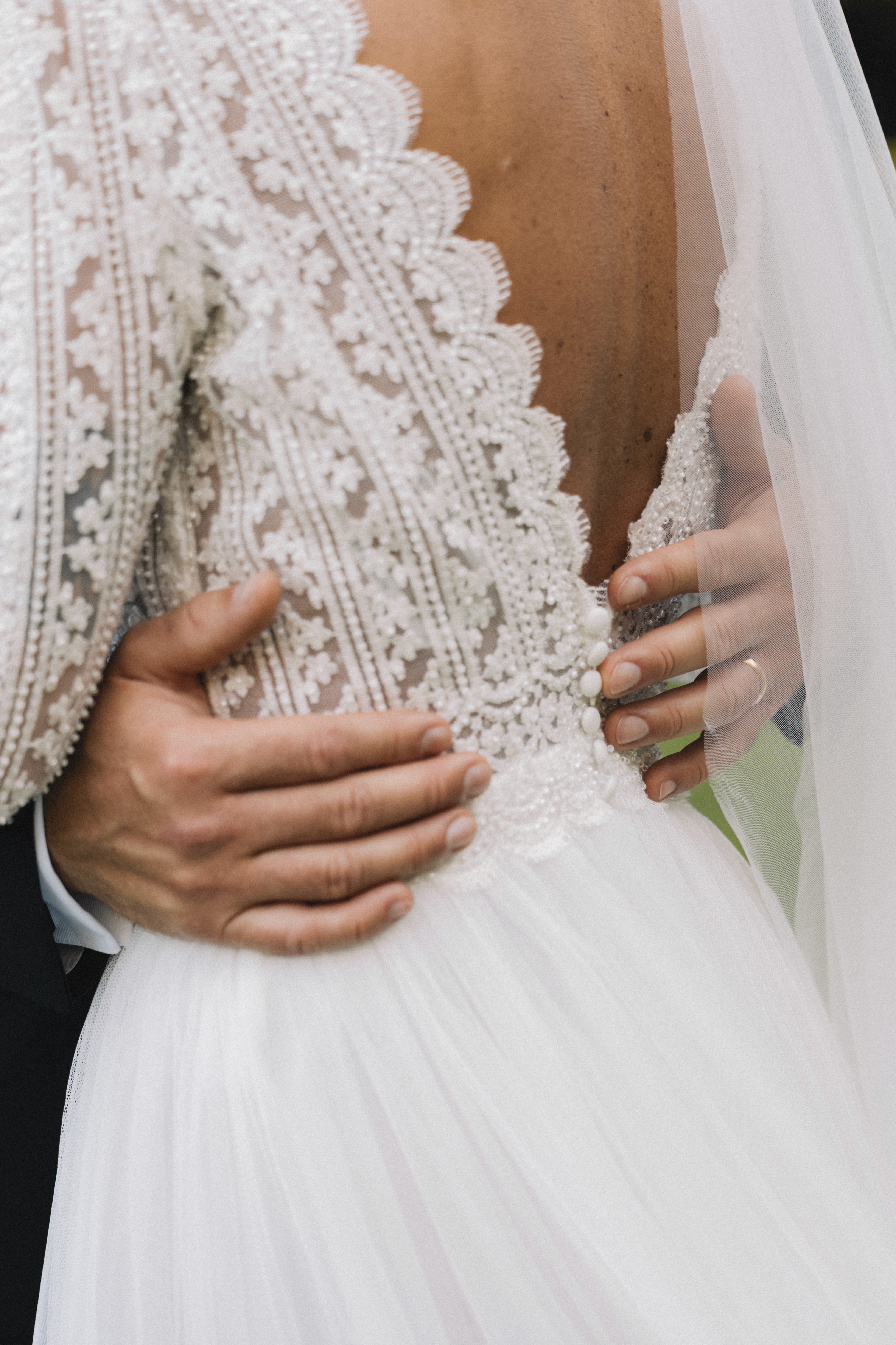 Nel giardino, il velo si solleva e li racchiude con delicata impalpabilità, creando una trama leggera che li unisce e li protegge. Un movimento semplice che diventa la perfetta immagine della loro unione.