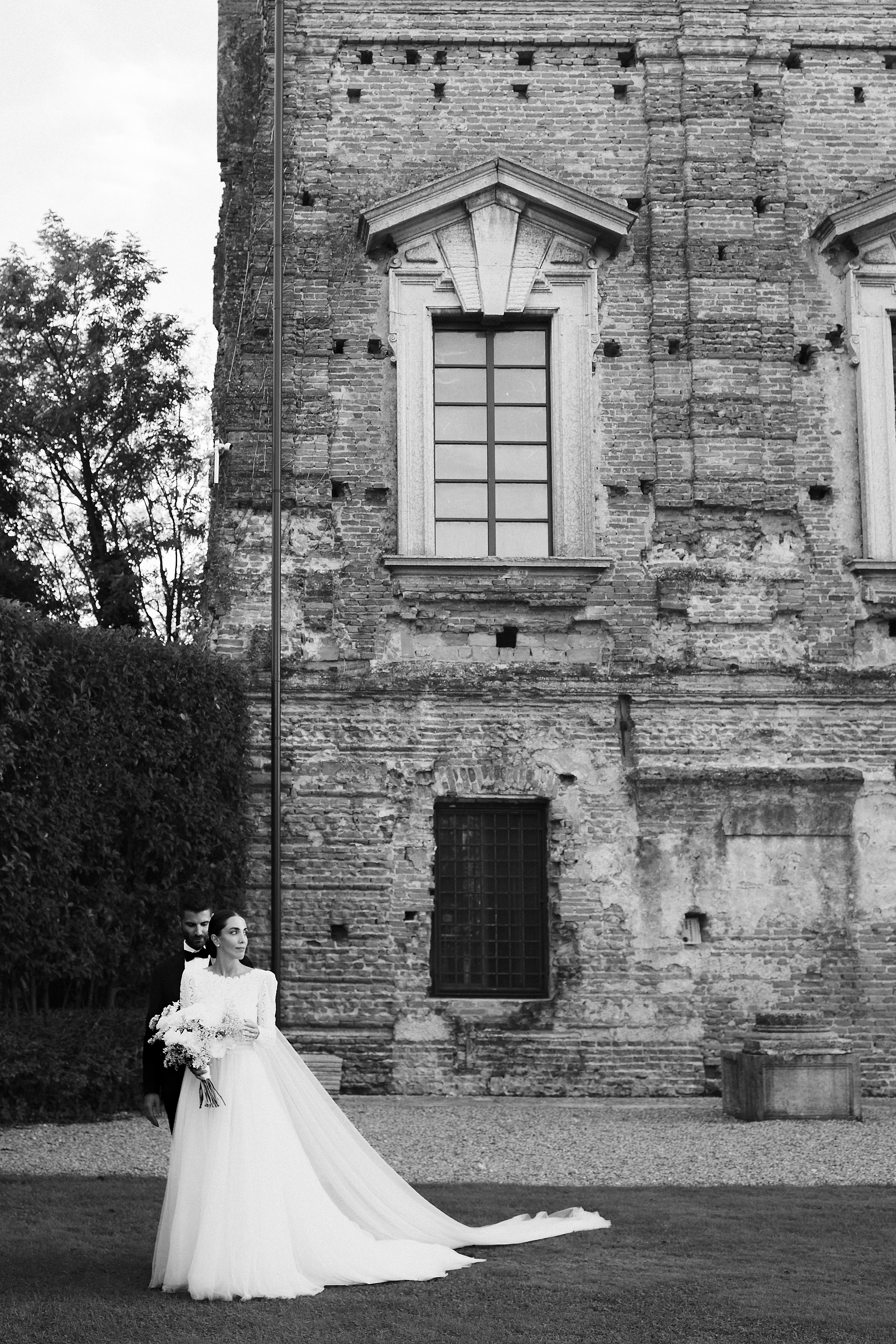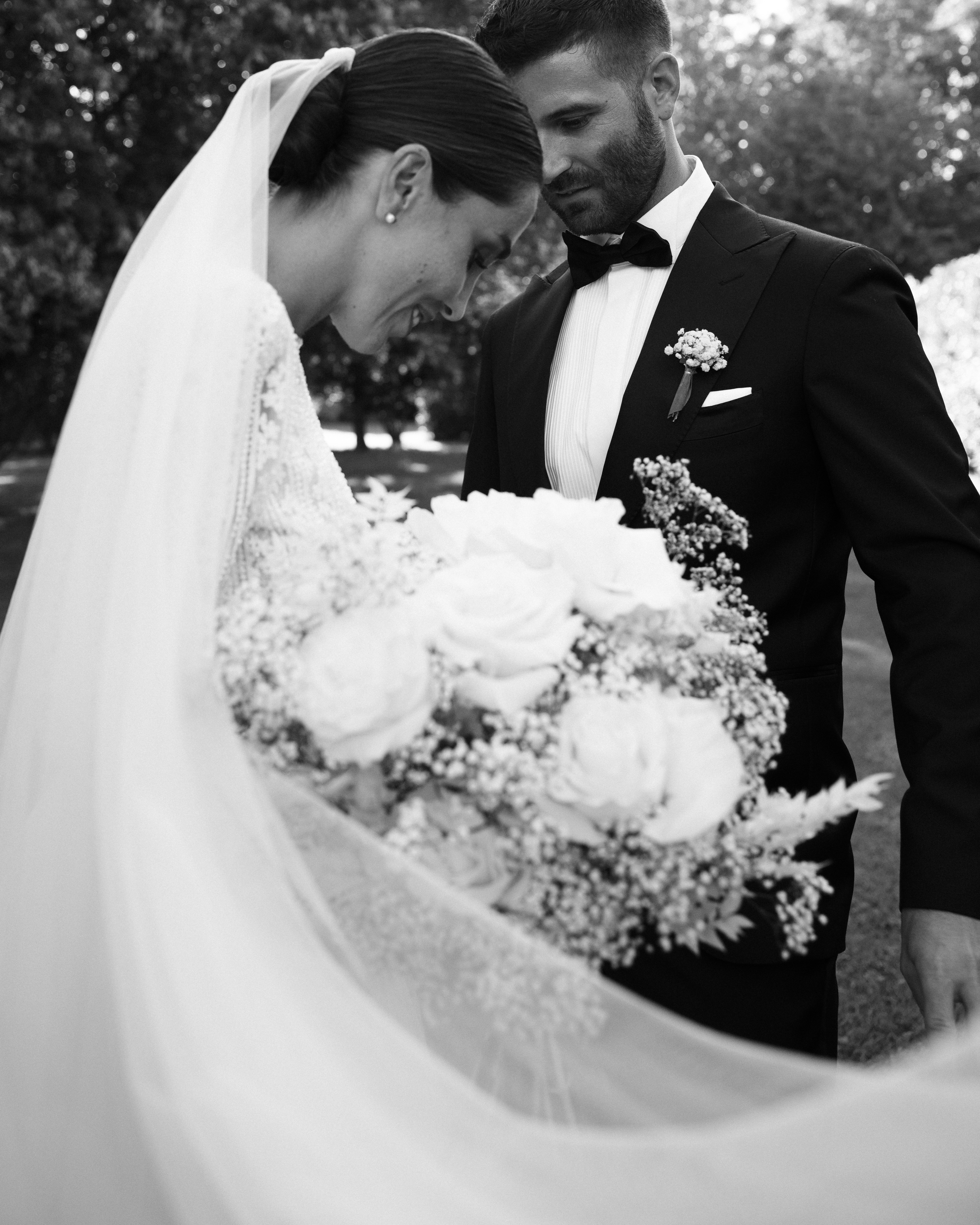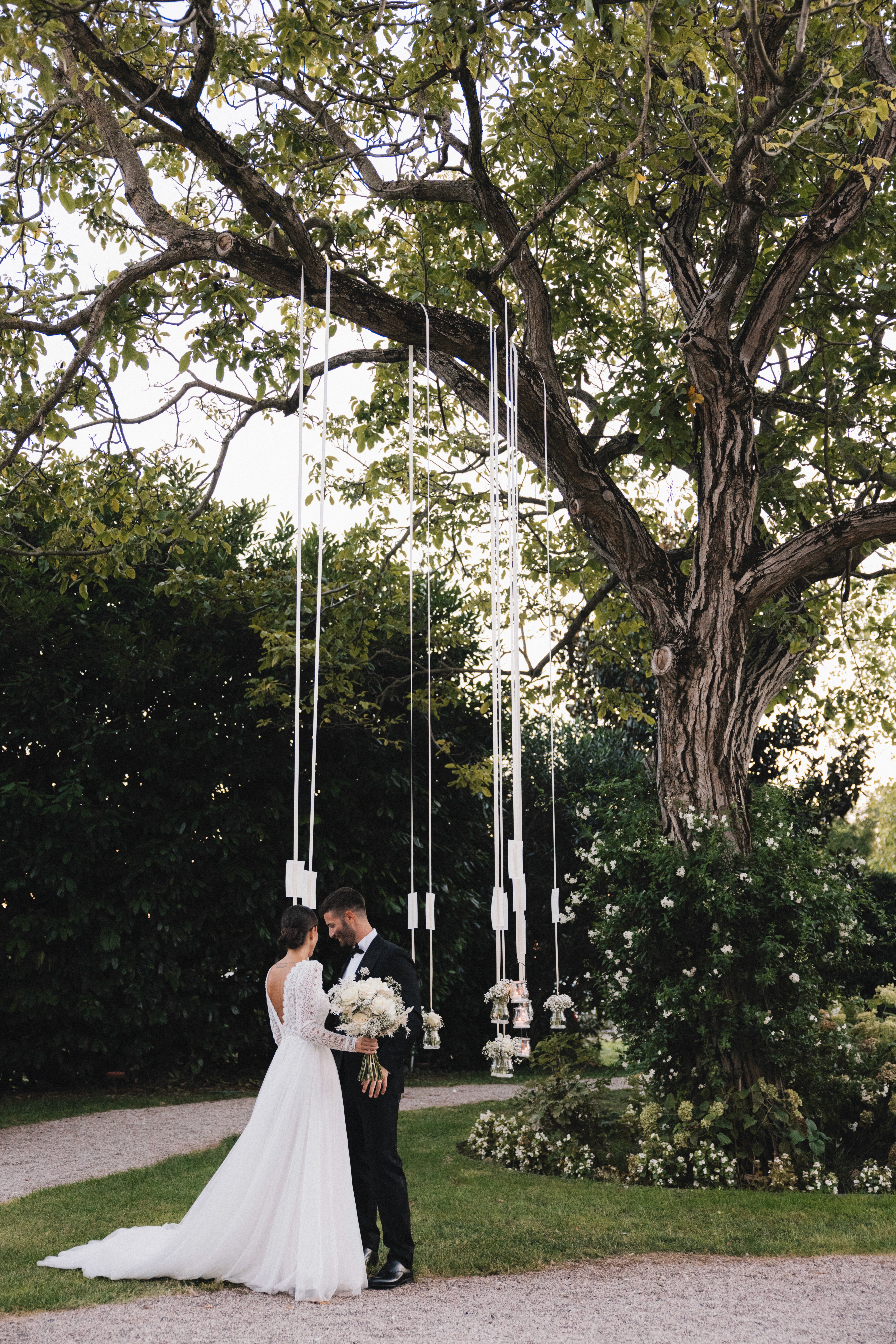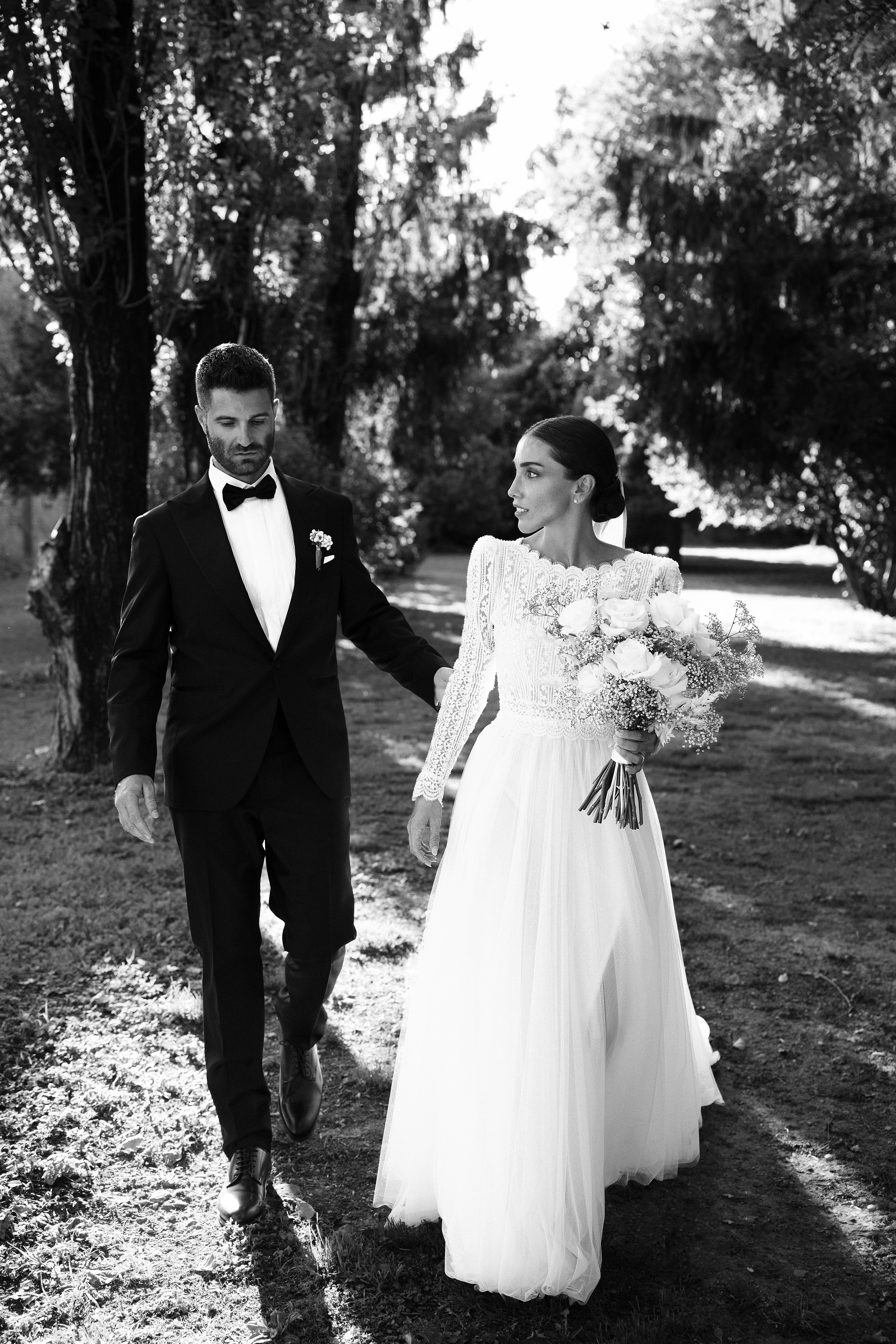 I colori si cercano e si accordano con grazia: il bianco luminoso dell'abito, il nero profondo dello smoking, il beige caldo della pietra, il verde fitto del parco. Una palette che non impone, ma avvolge. Il bouquet candido, pieno e vibrante, riposa tra le mani della sposa come materia viva, mentre la villa si rivela tra i tronchi in uno scorcio che trattiene il respiro.