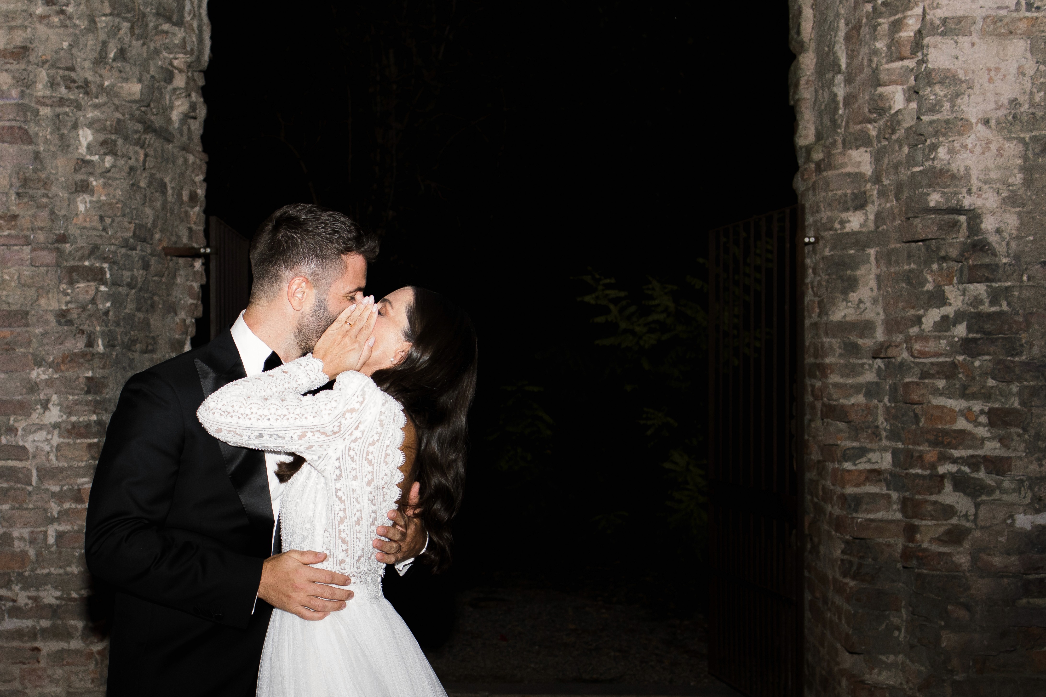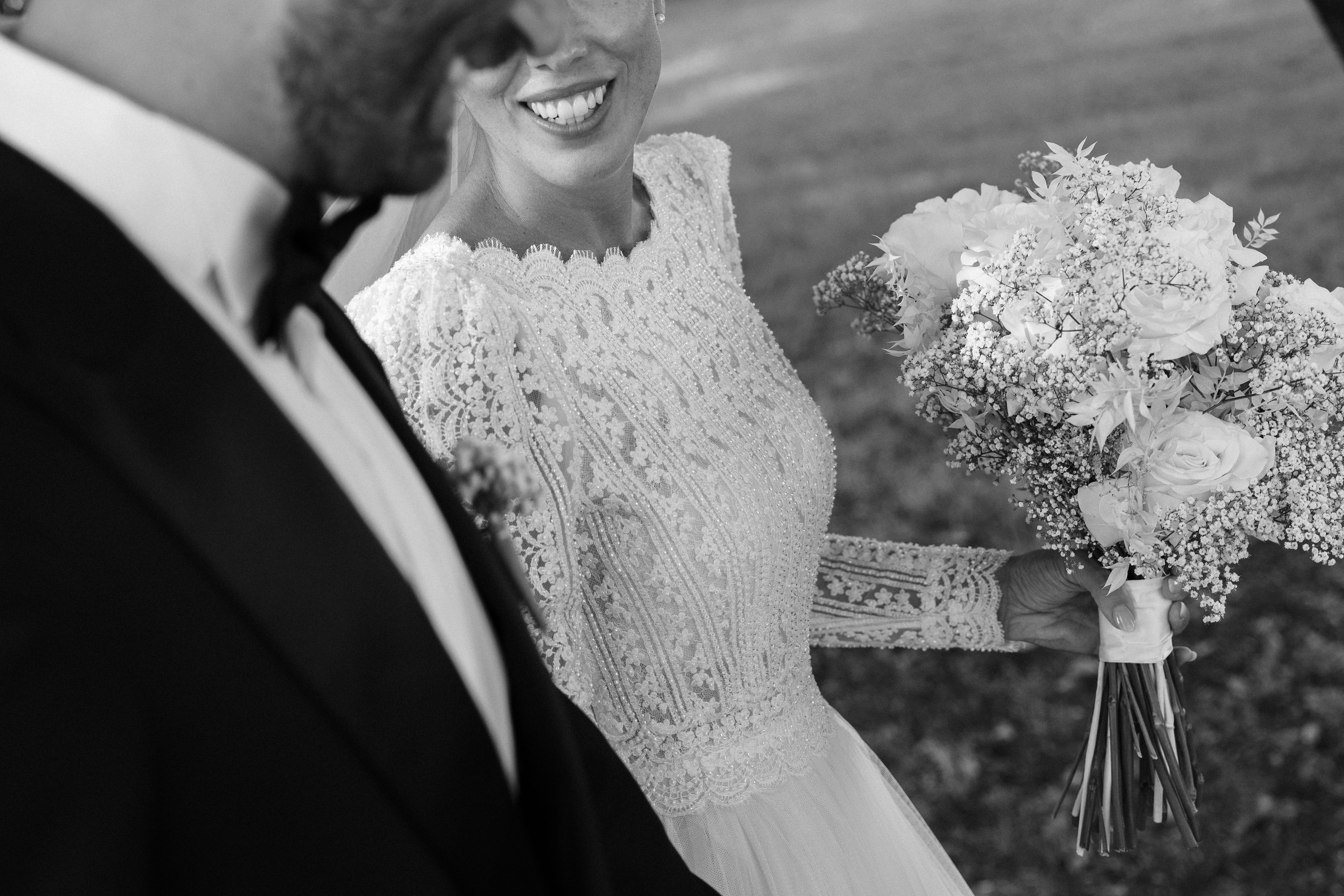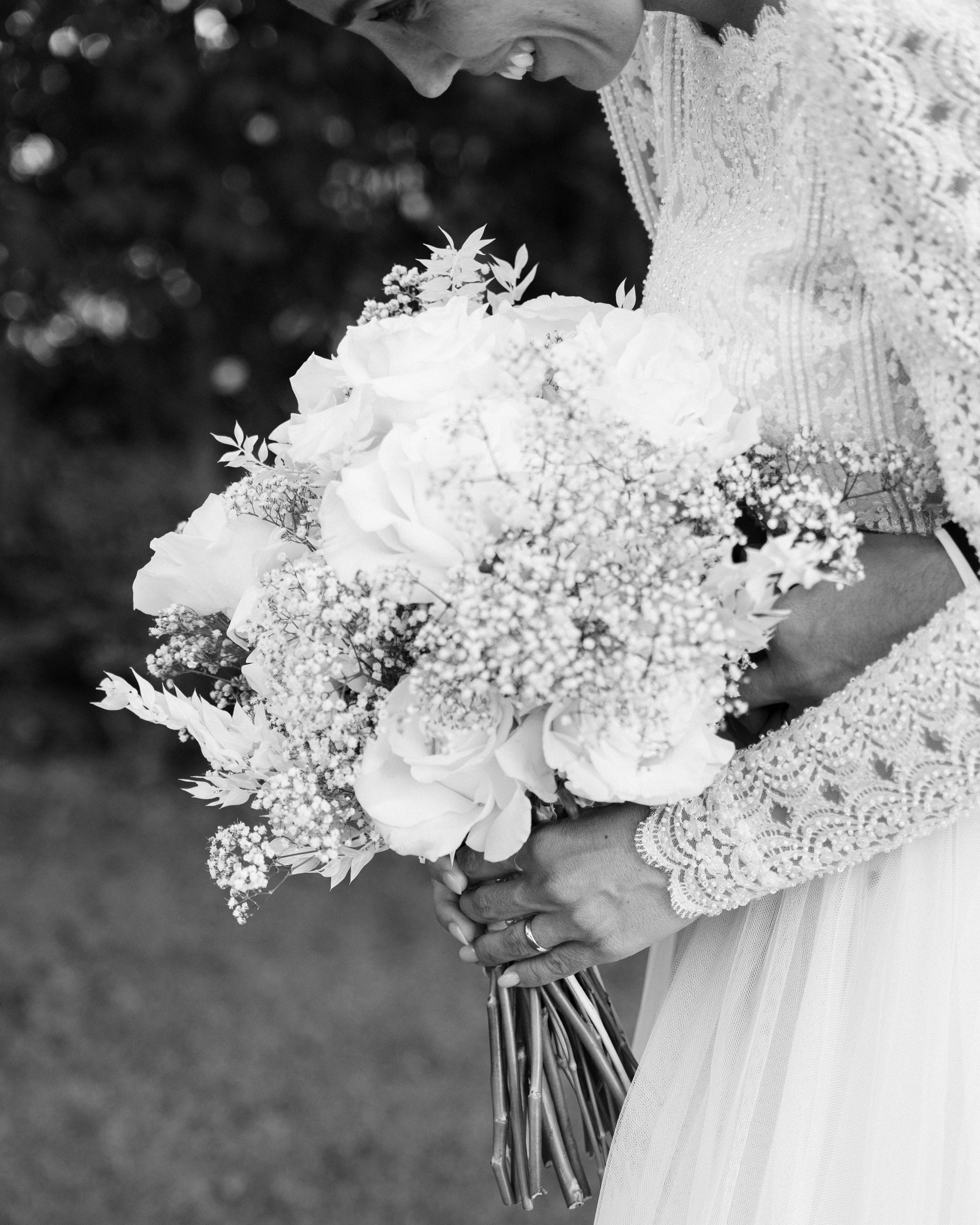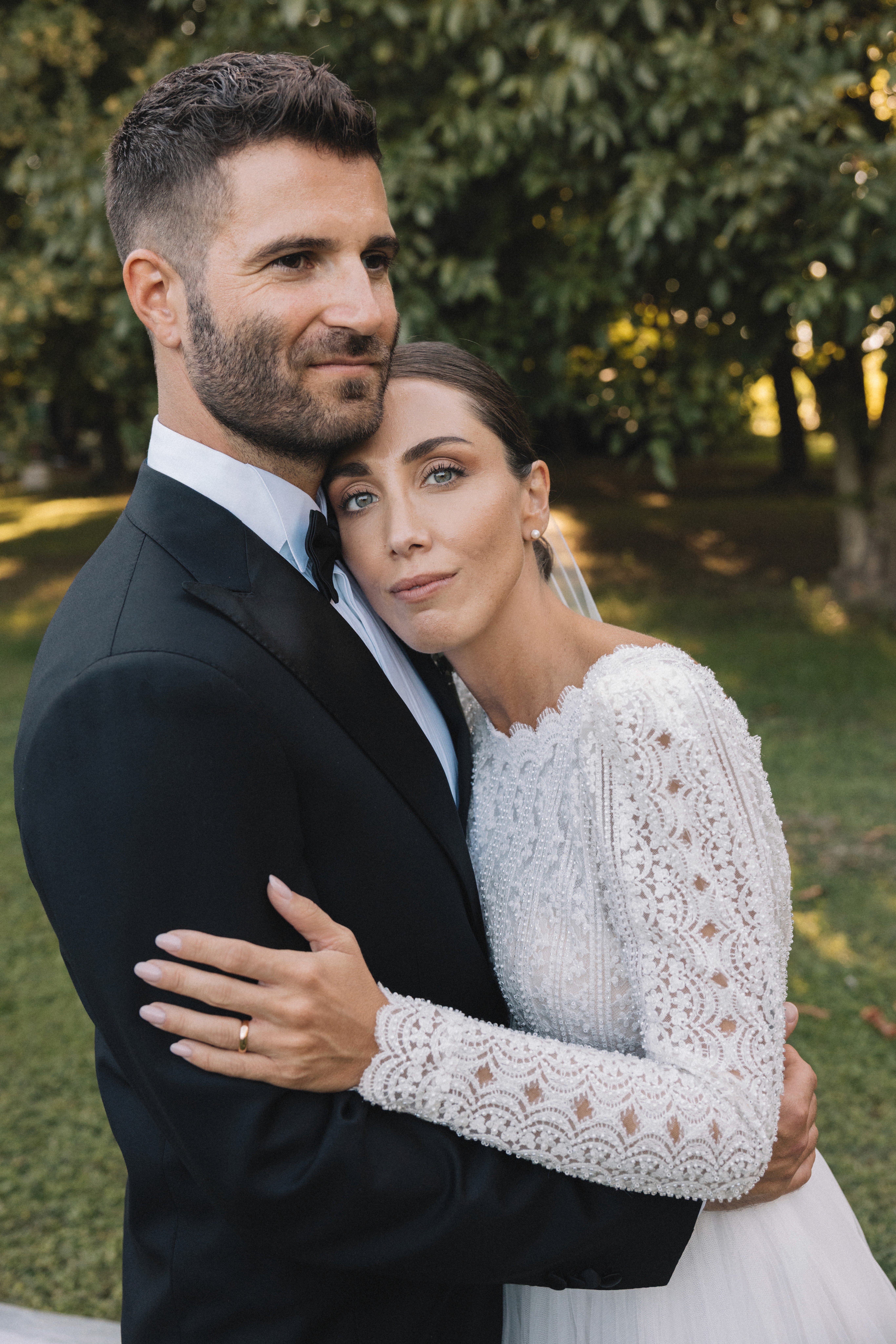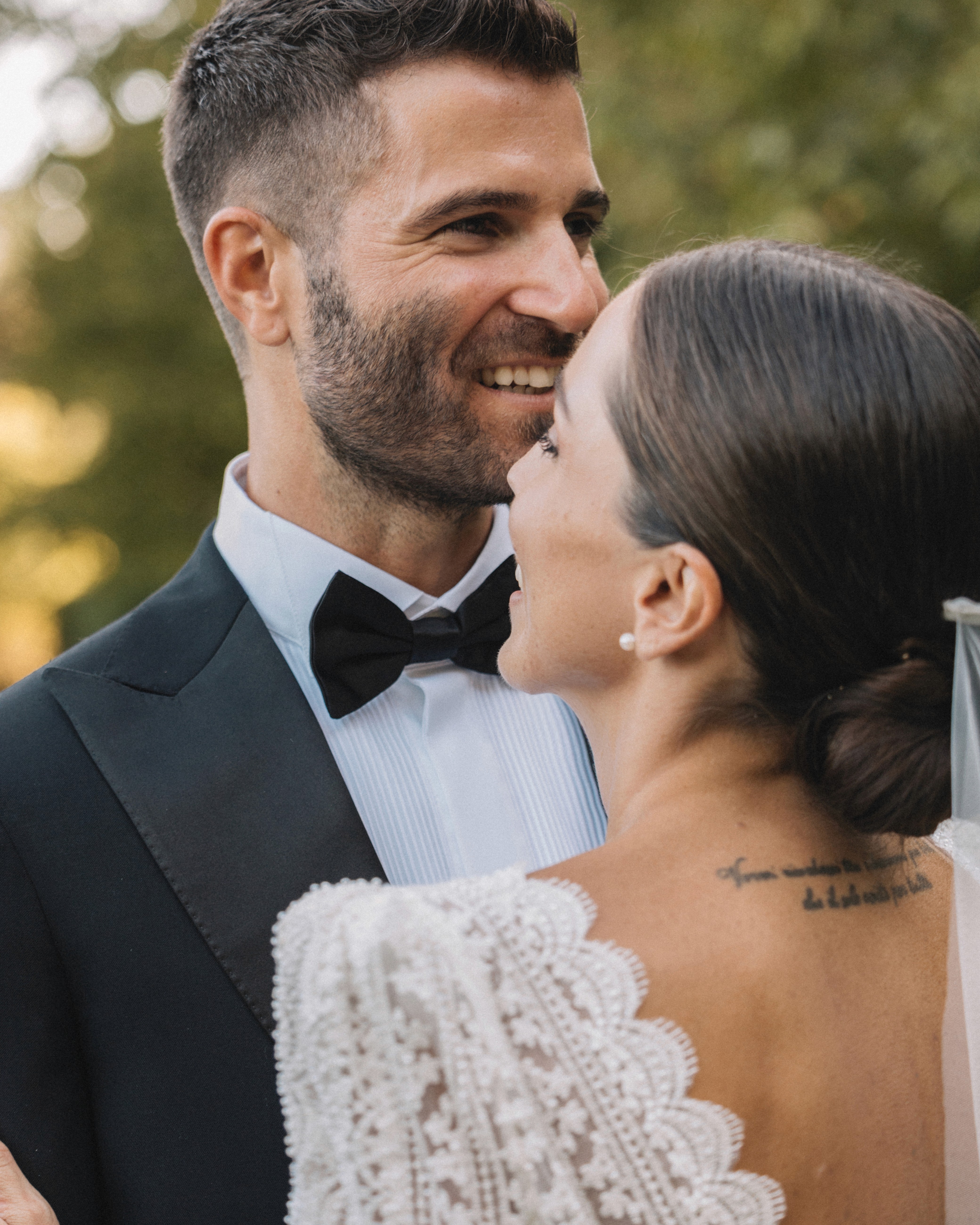 I colori si cercano e si accordano con grazia: il bianco luminoso dell'abito, il nero profondo dello smoking, il beige caldo della pietra, il verde fitto del parco. Una palette che non impone, ma avvolge. Il bouquet candido, pieno e vibrante, riposa tra le mani della sposa come materia viva, mentre la villa si rivela tra i tronchi in uno scorcio che trattiene il respiro.