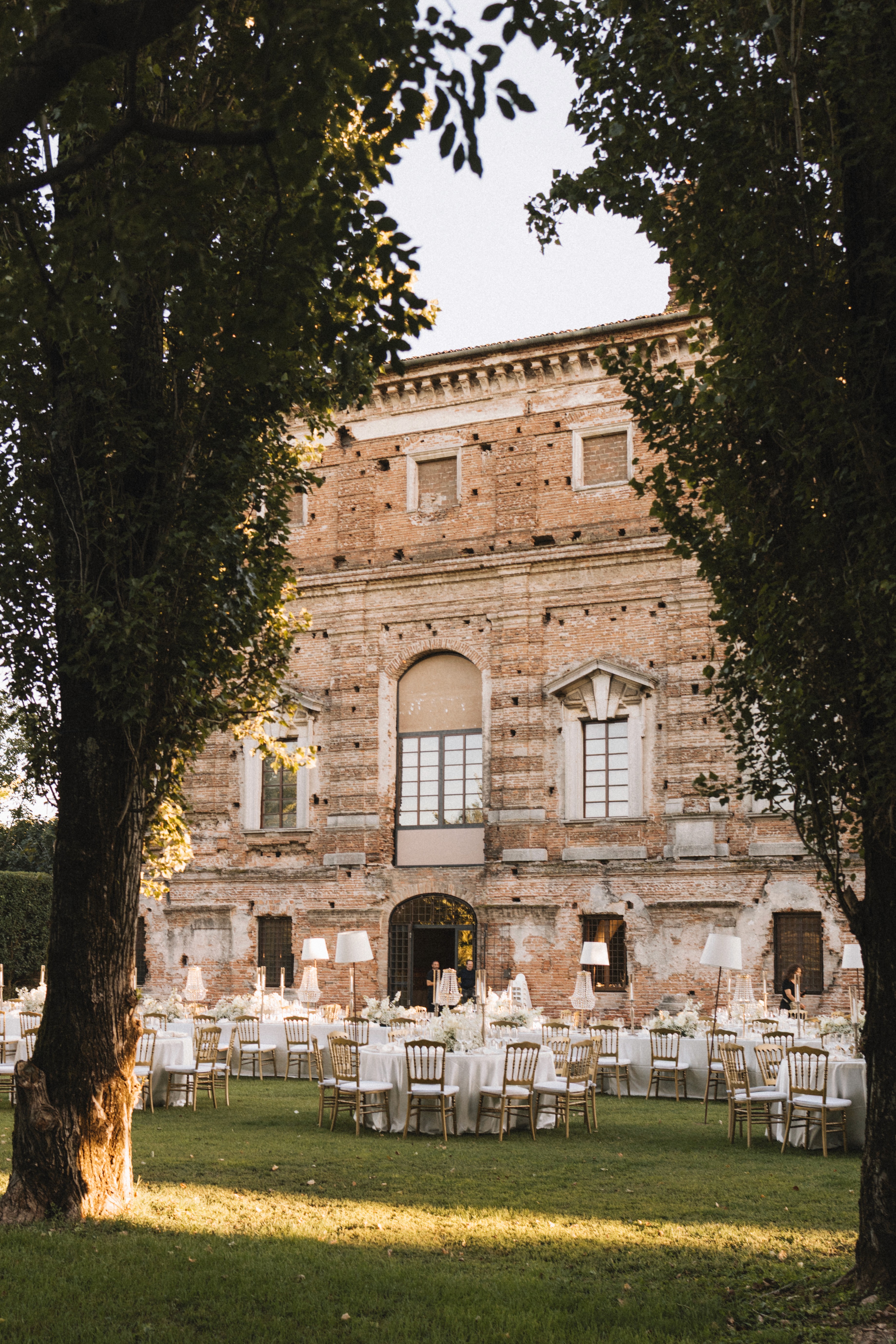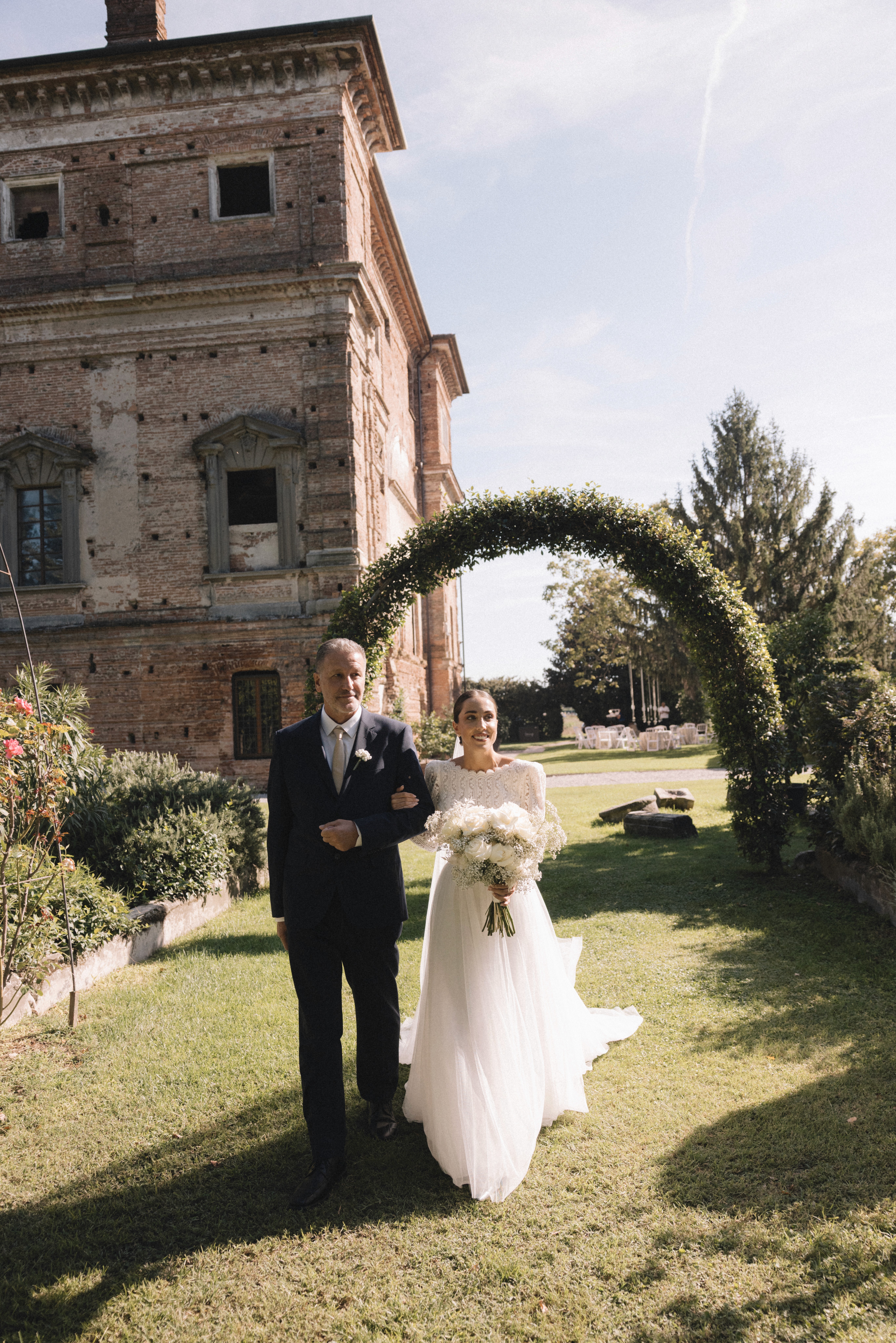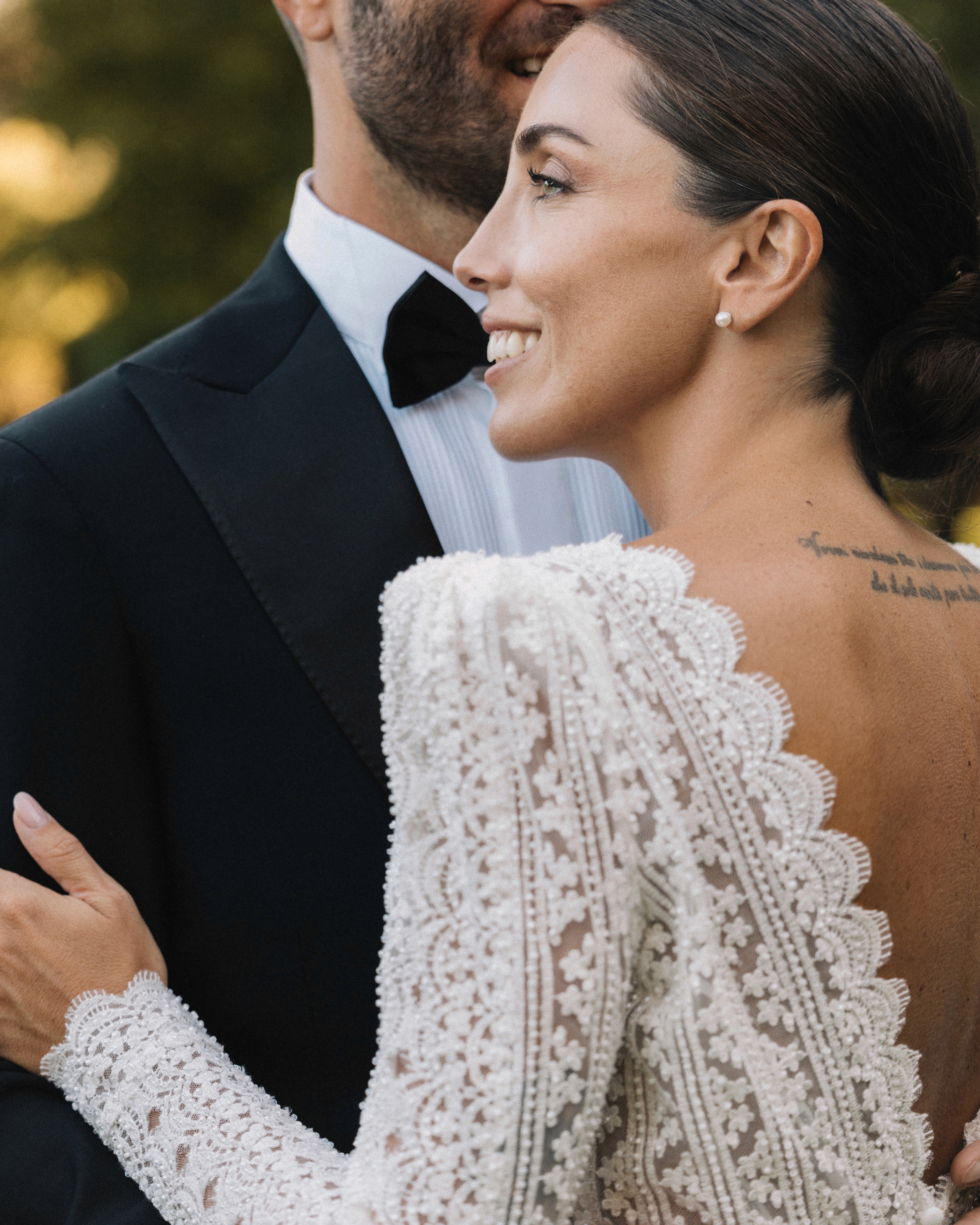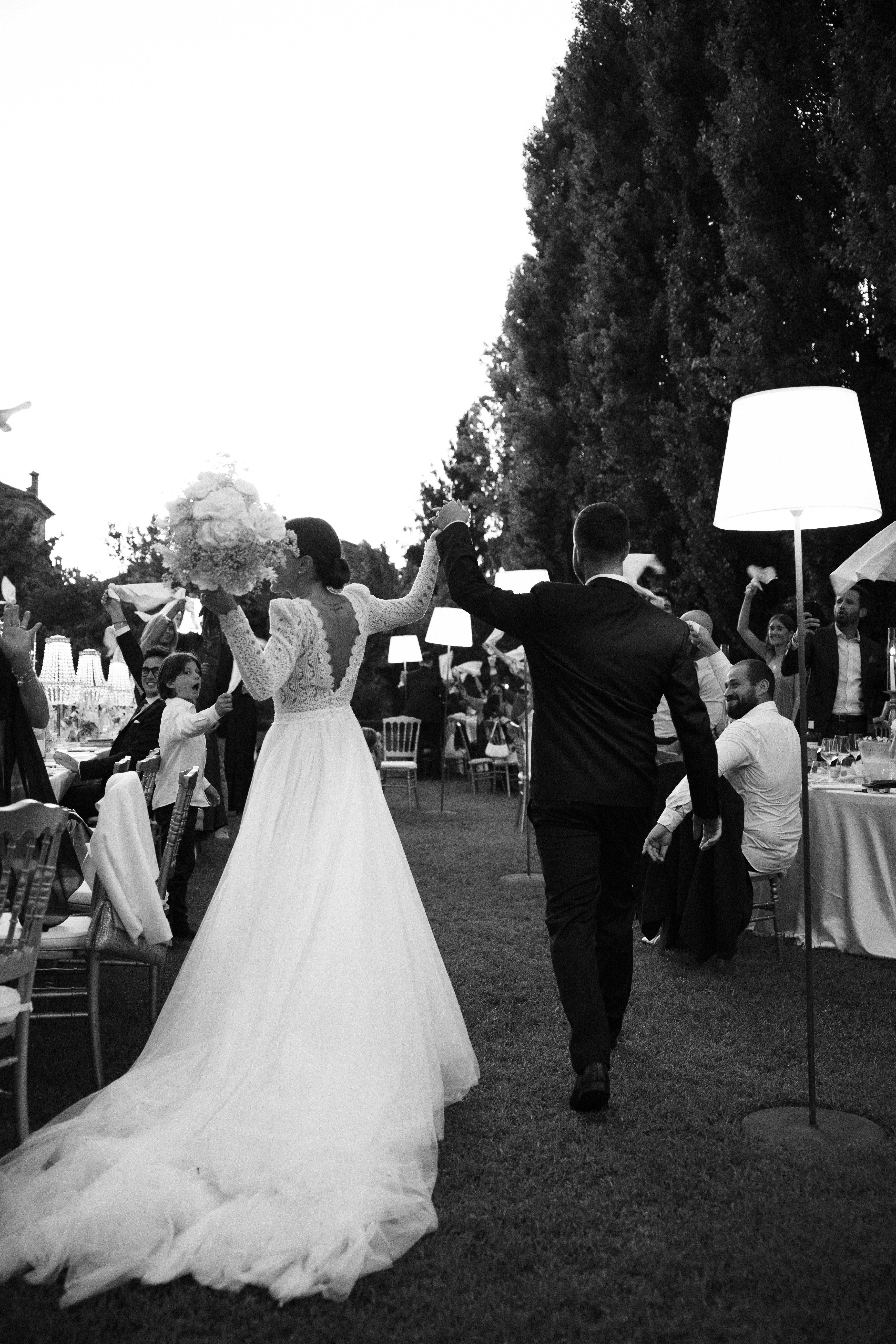 I colori si cercano e si accordano con grazia: il bianco luminoso dell'abito, il nero profondo dello smoking, il beige caldo della pietra, il verde fitto del parco. Una palette che non impone, ma avvolge. Il bouquet candido, pieno e vibrante, riposa tra le mani della sposa come materia viva, mentre la villa si rivela tra i tronchi in uno scorcio che trattiene il respiro.