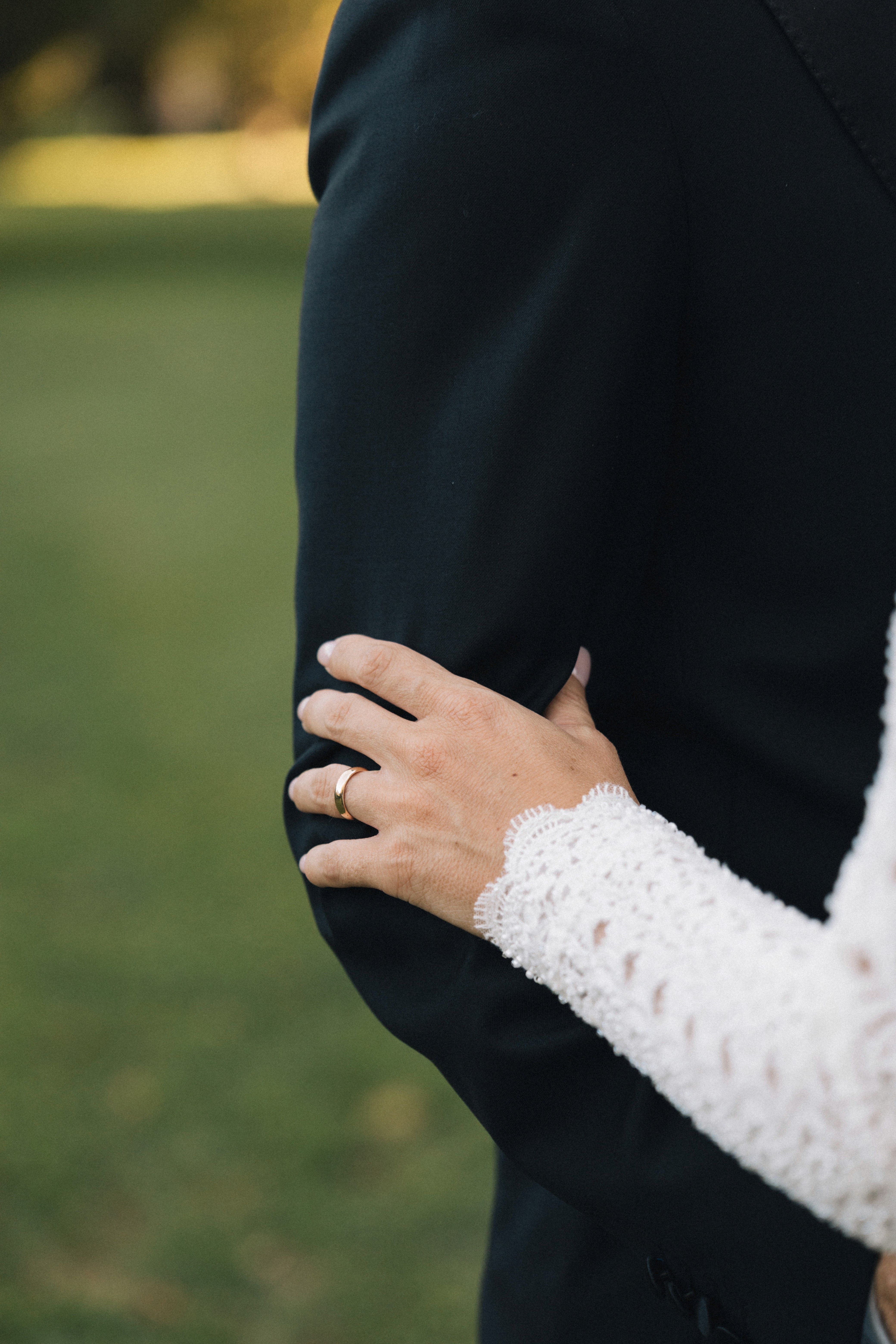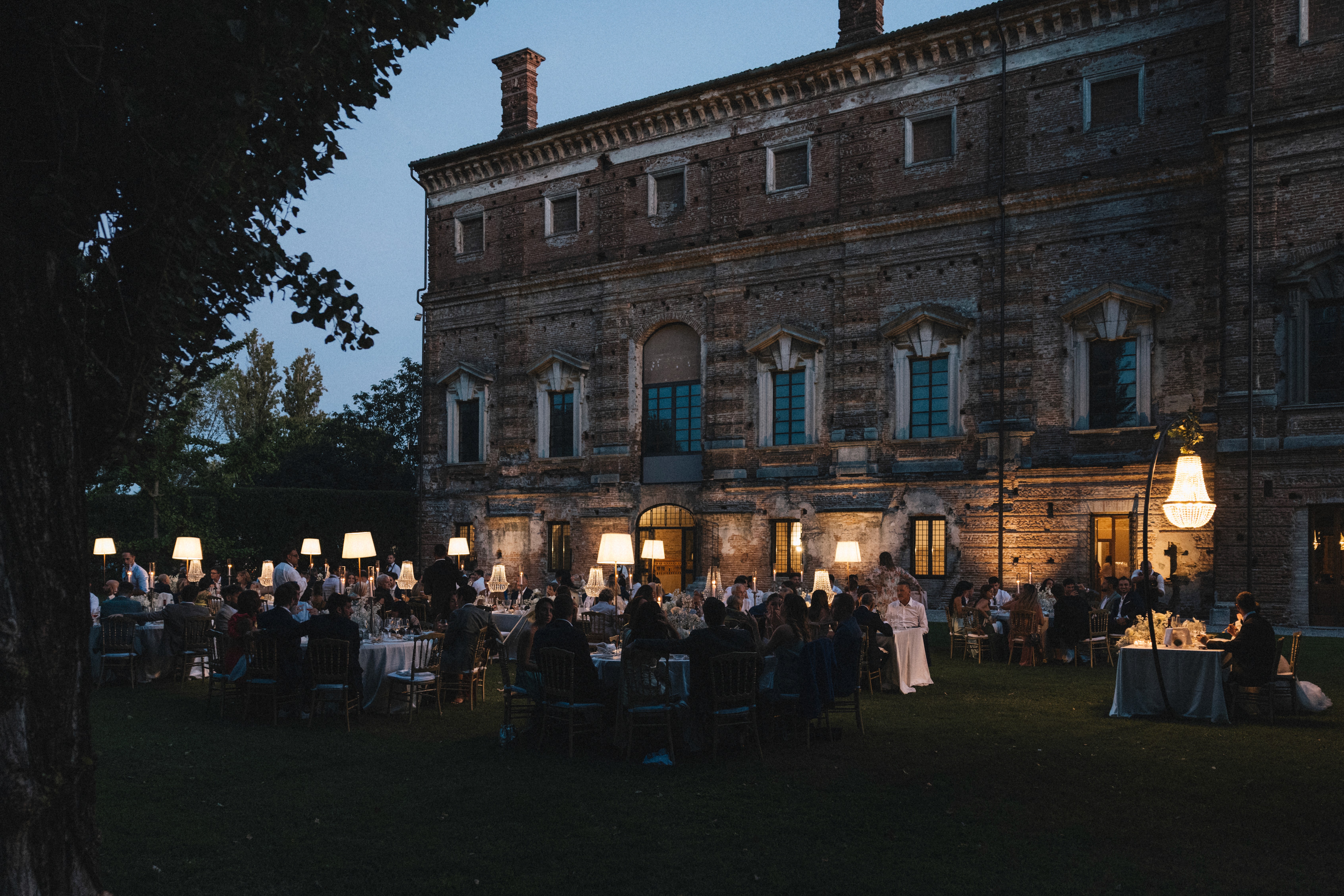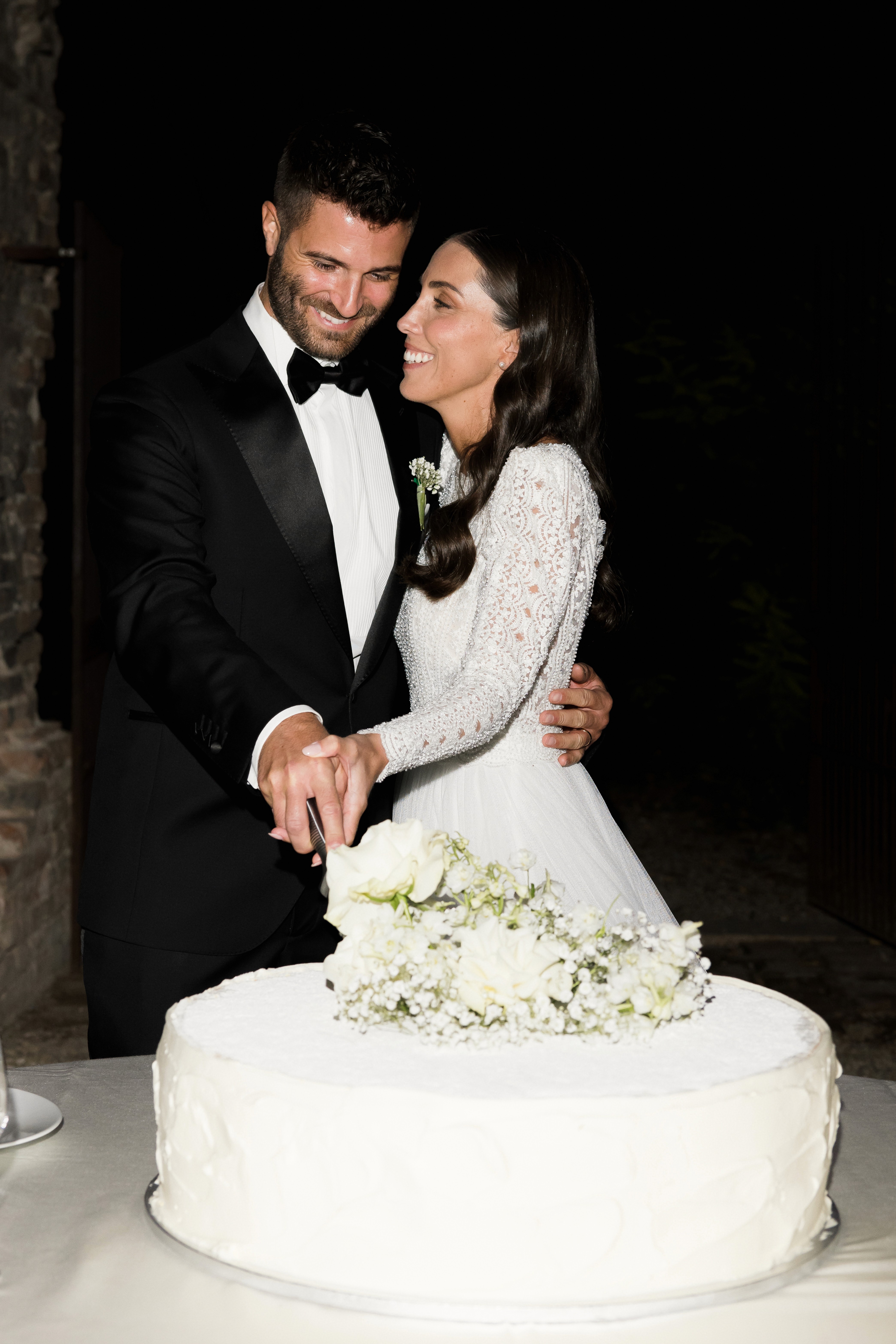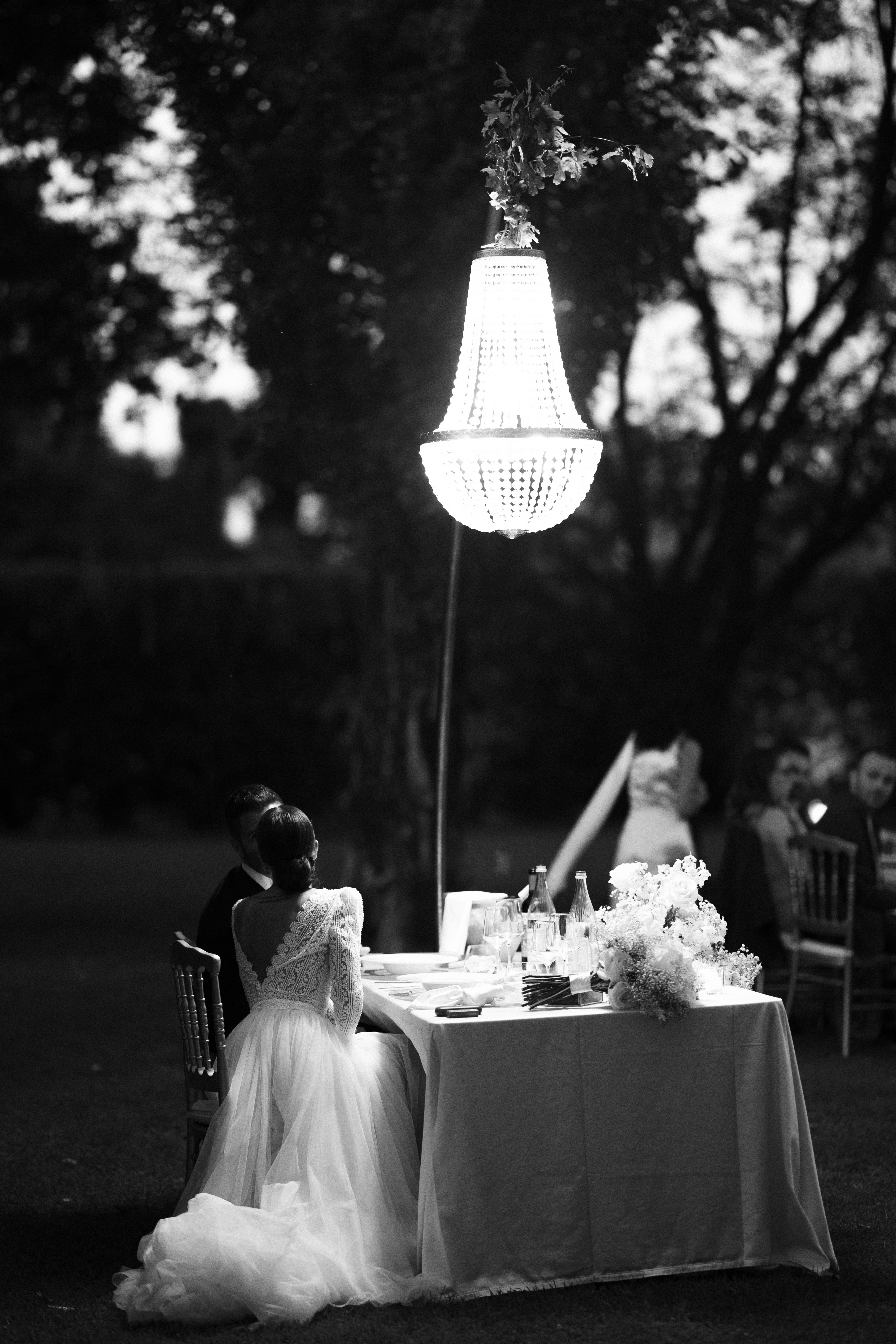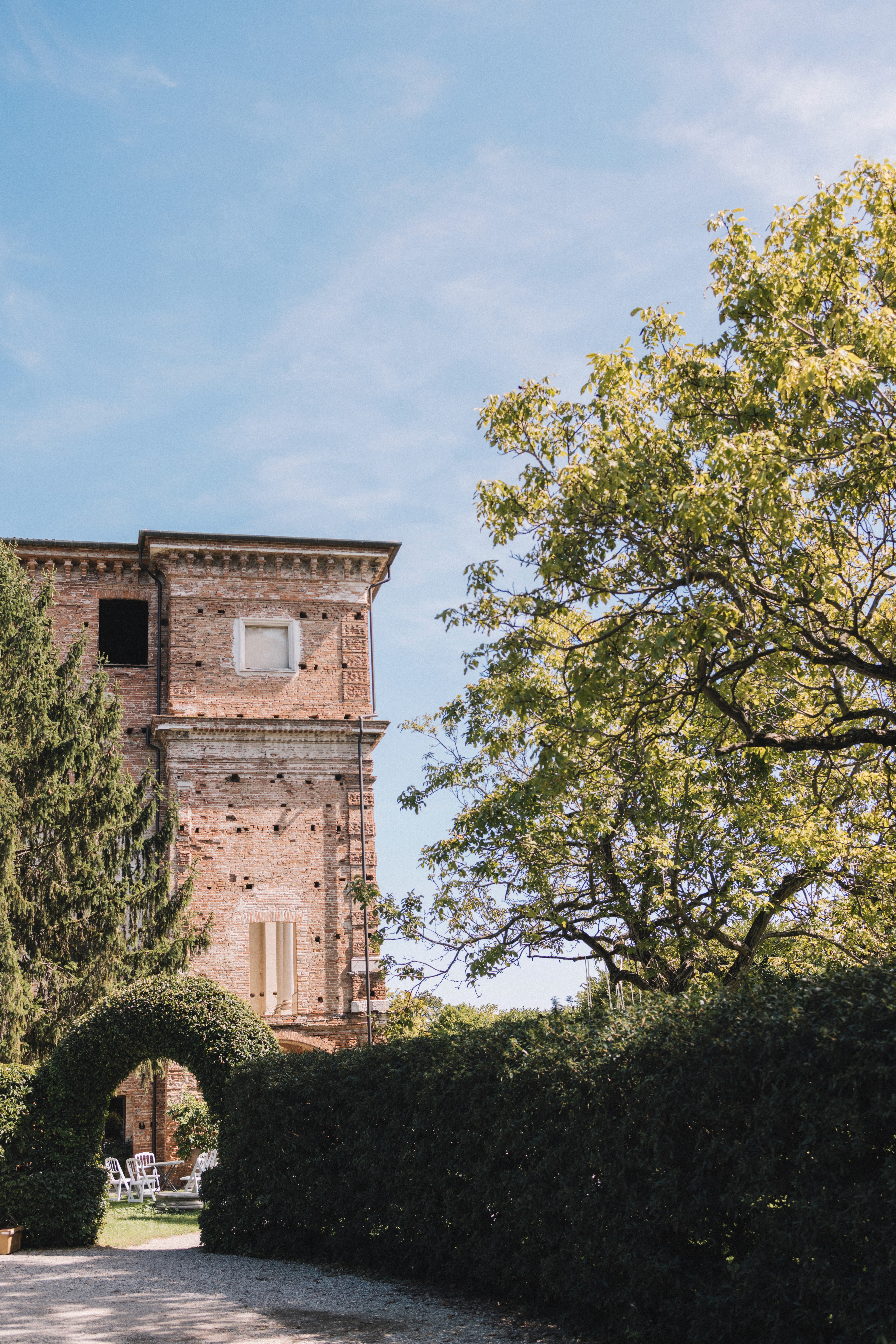 I colori si cercano e si accordano con grazia: il bianco luminoso dell'abito, il nero profondo dello smoking, il beige caldo della pietra, il verde fitto del parco. Una palette che non impone, ma avvolge. Il bouquet candido, pieno e vibrante, riposa tra le mani della sposa come materia viva, mentre la villa si rivela tra i tronchi in uno scorcio che trattiene il respiro.
