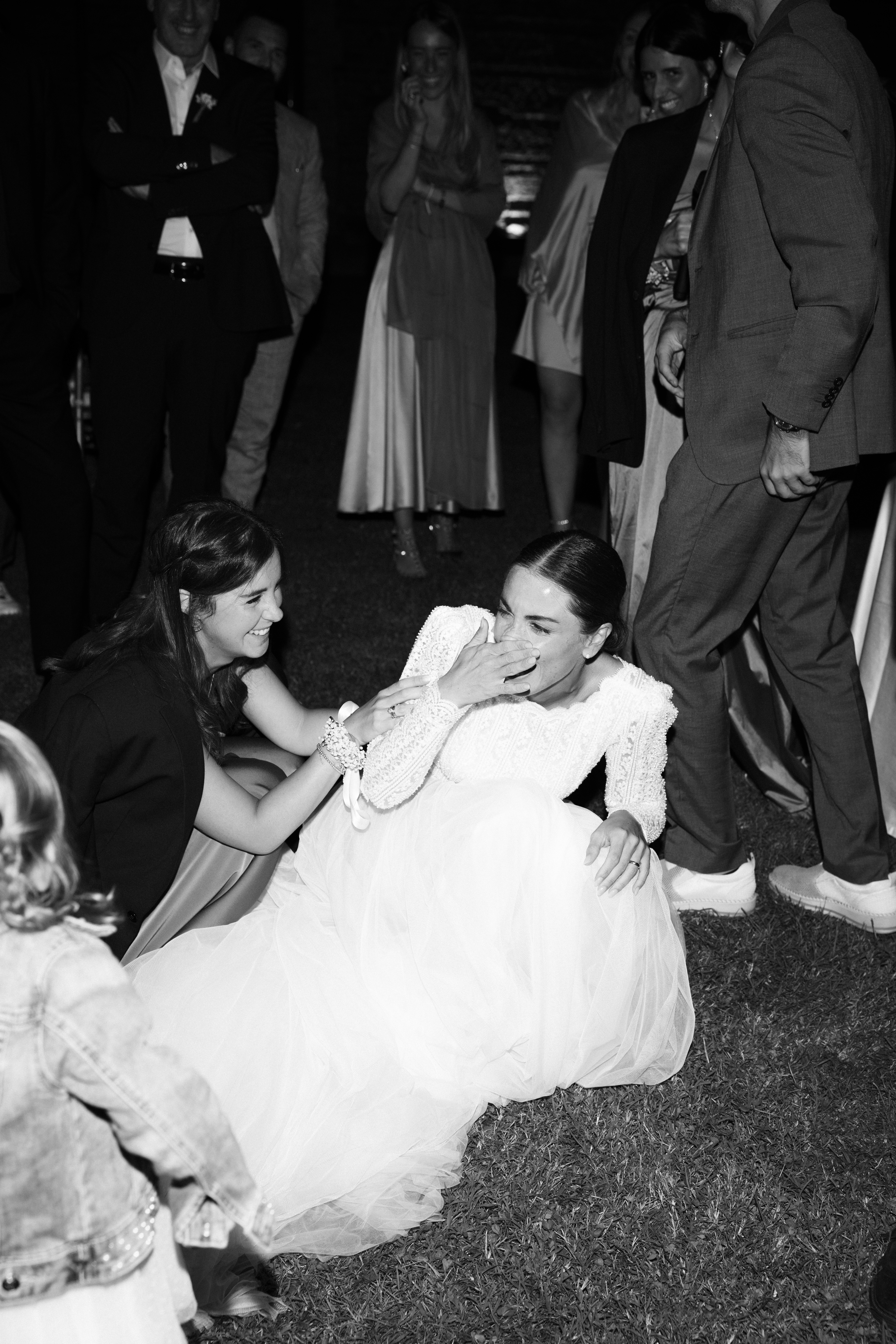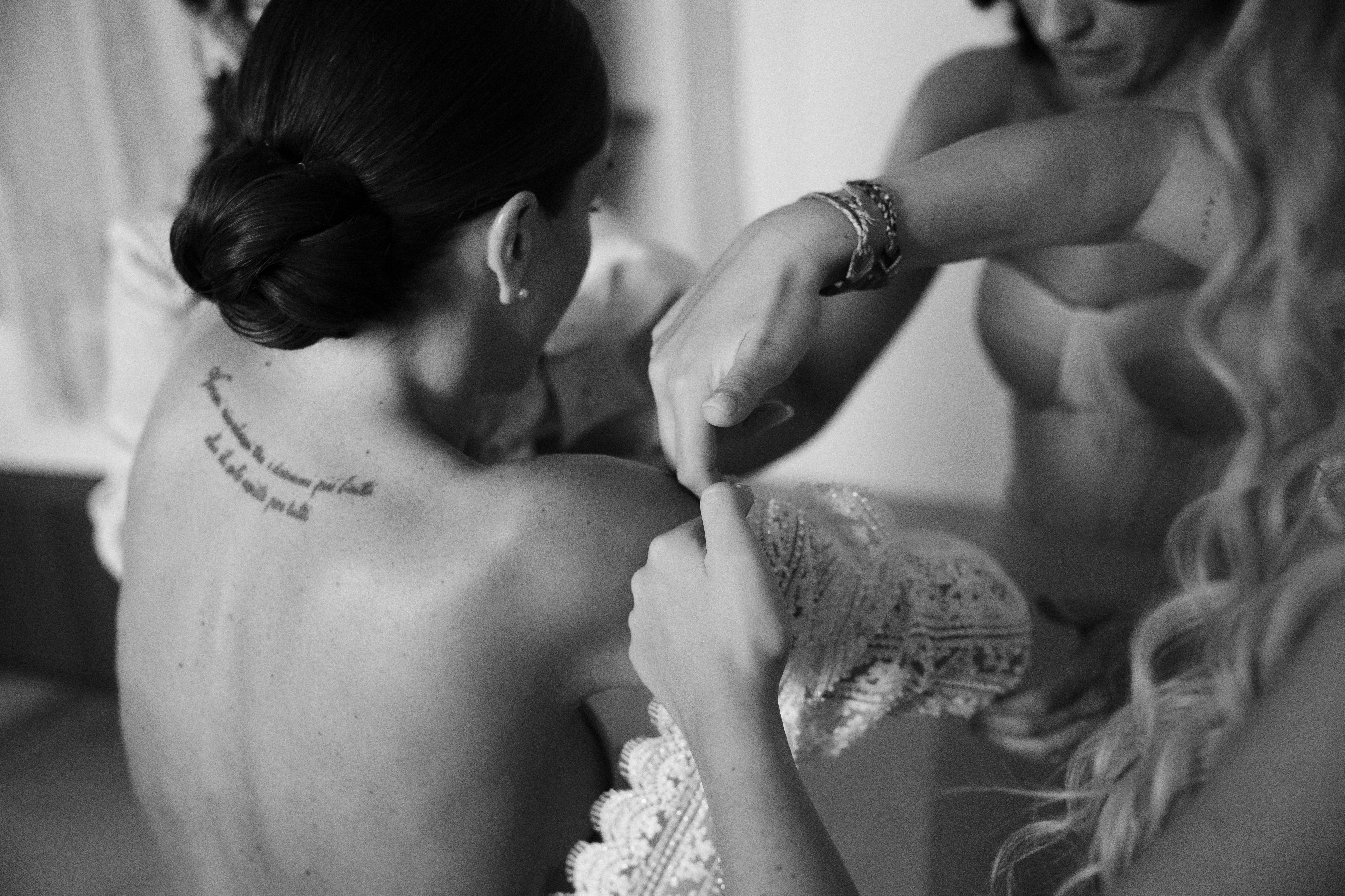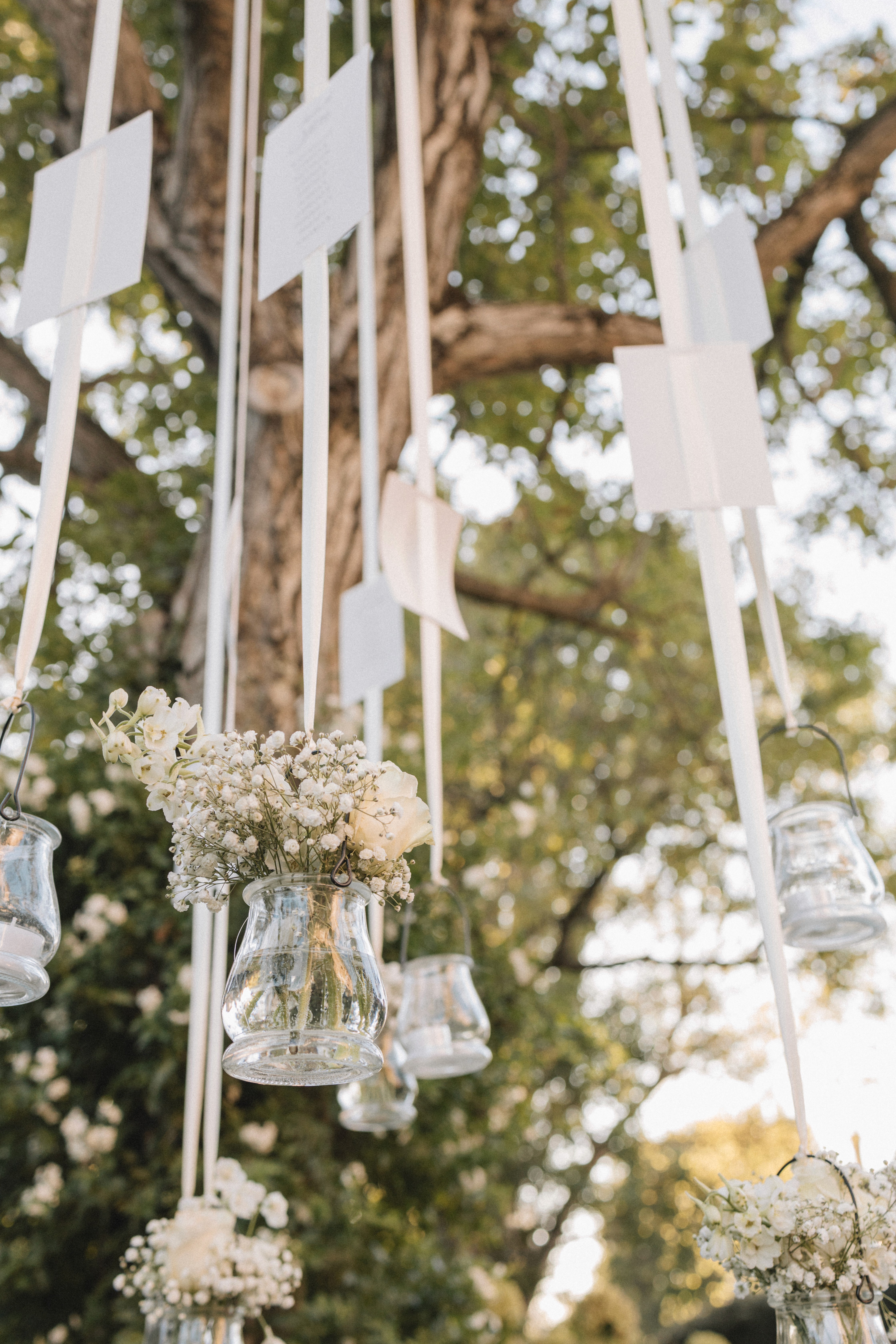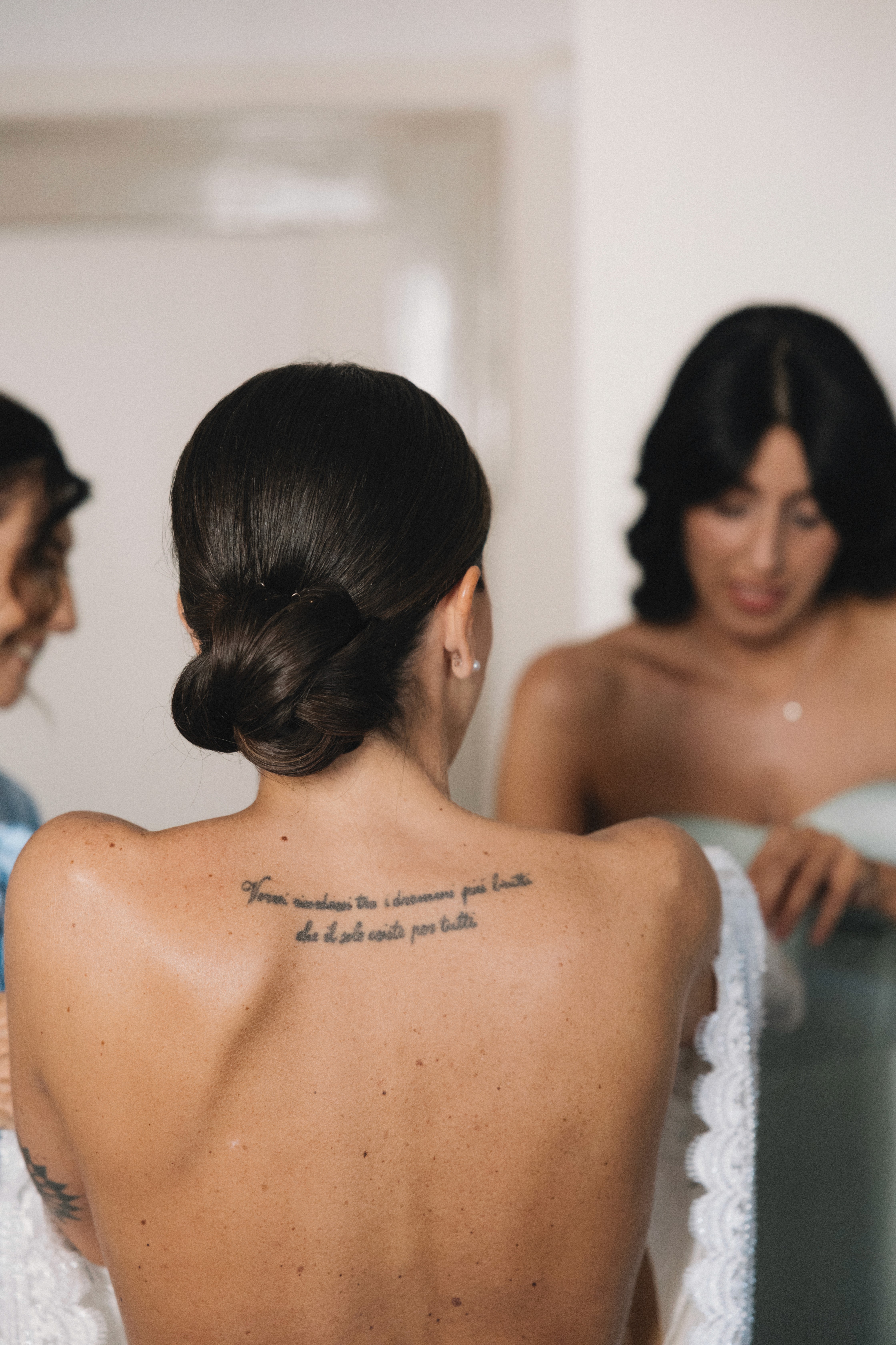 I colori si cercano e si accordano con grazia: il bianco luminoso dell'abito, il nero profondo dello smoking, il beige caldo della pietra, il verde fitto del parco. Una palette che non impone, ma avvolge. Il bouquet candido, pieno e vibrante, riposa tra le mani della sposa come materia viva, mentre la villa si rivela tra i tronchi in uno scorcio che trattiene il respiro.