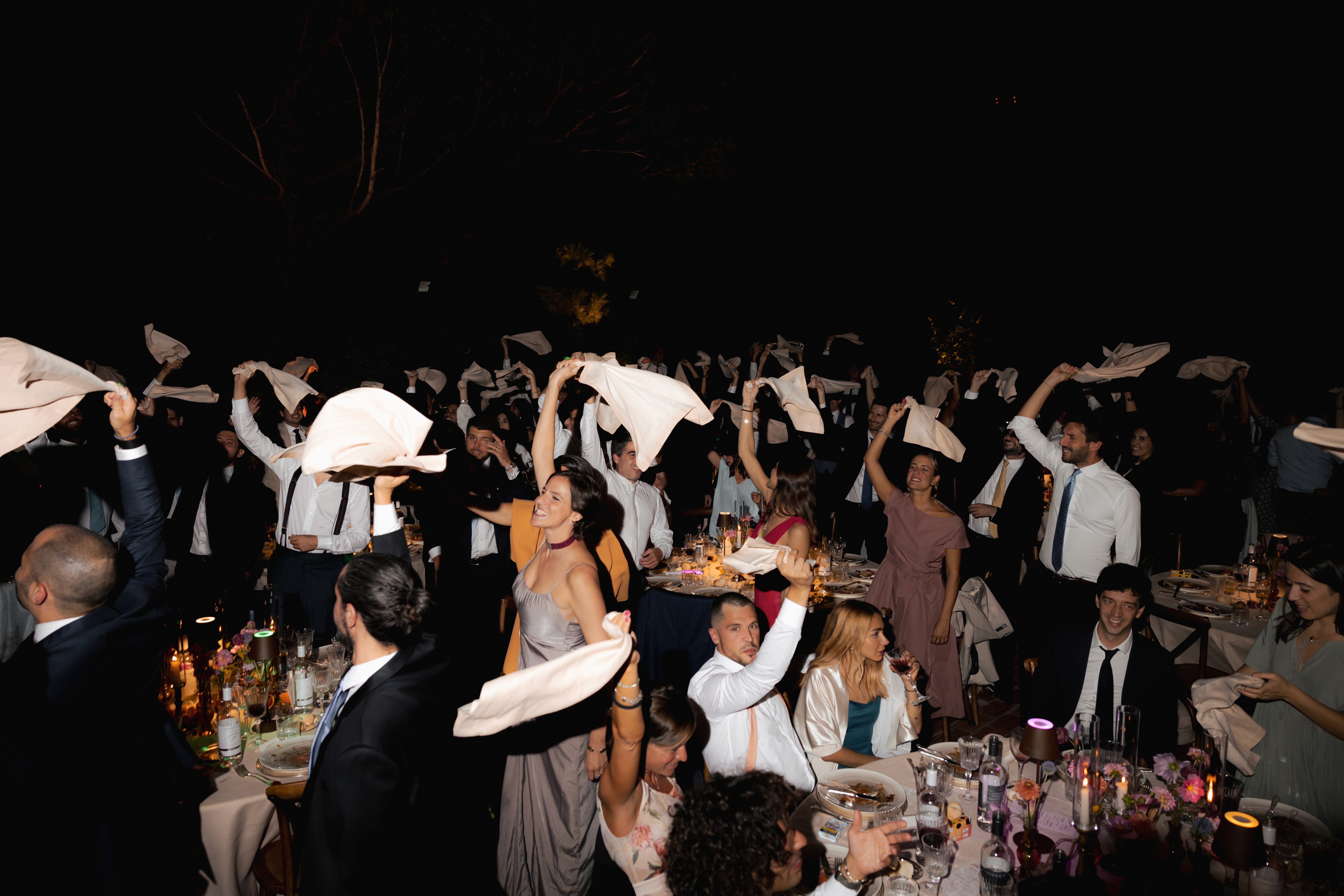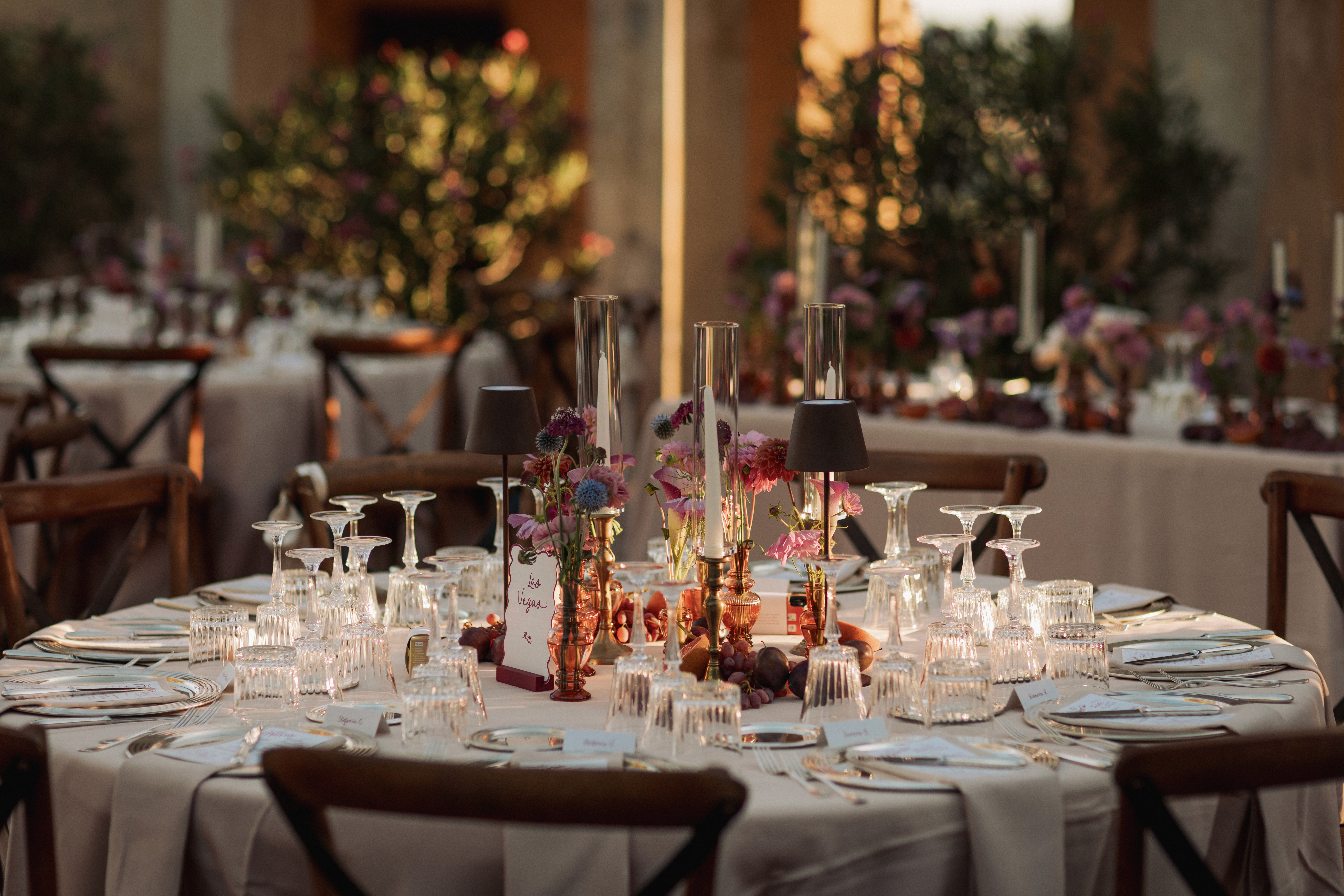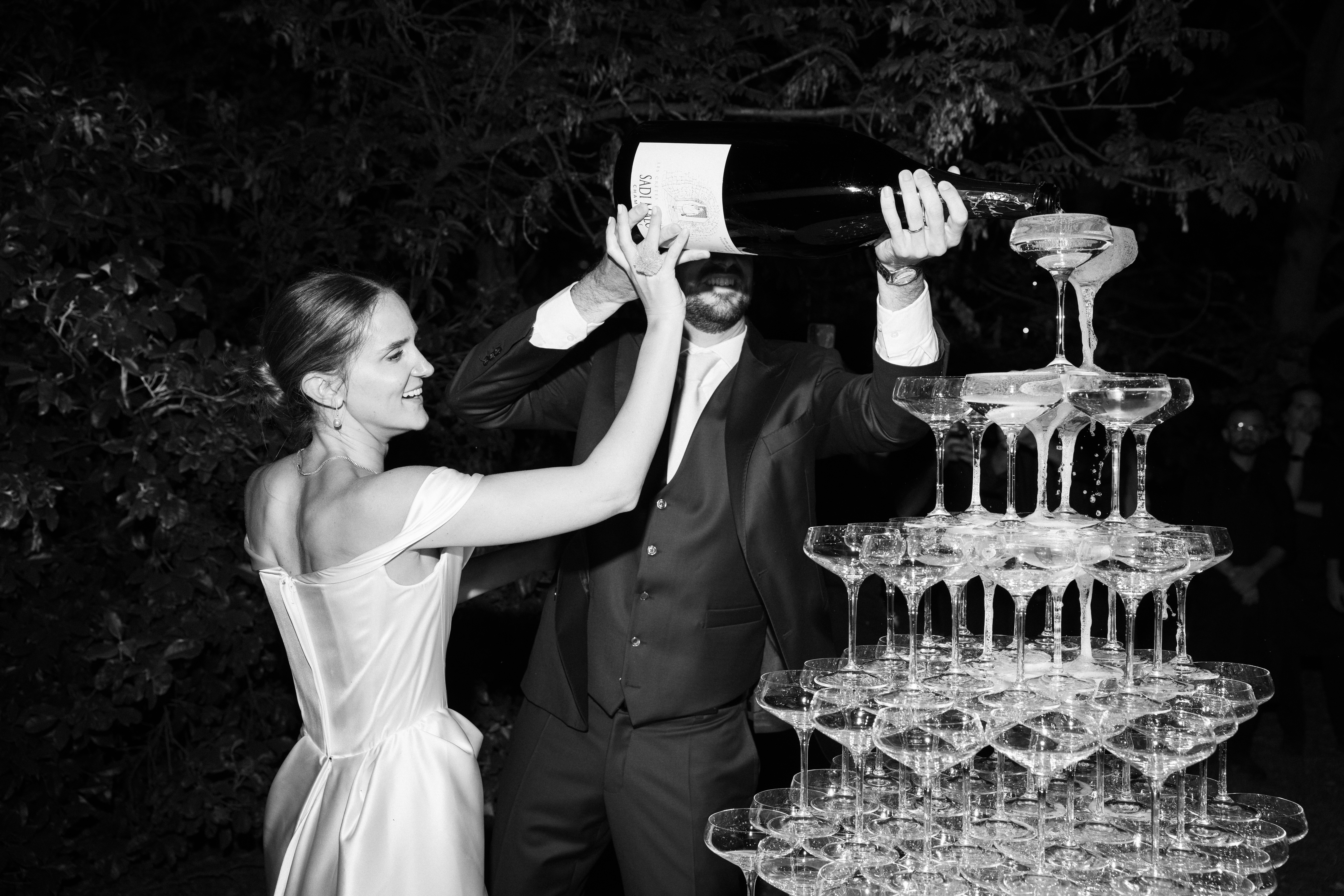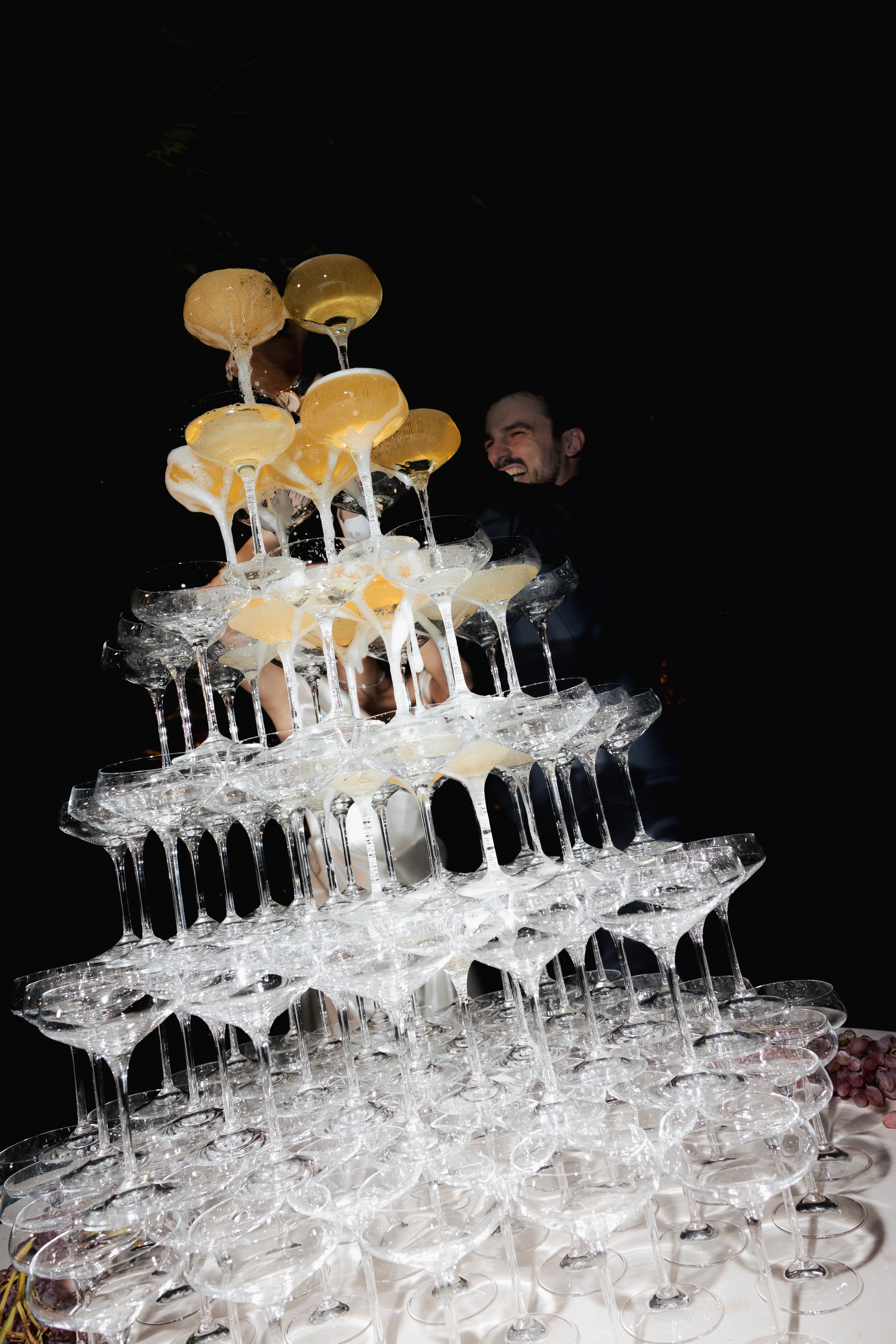 Nelle immagini si avverte la tensione sospesa prima del sì, quella vibrazione sottile che precede l'incontro degli sguardi; poi il respiro si scioglie in sorrisi, abbracci e leggerezza. La cena prende così forma tra particolari curati e una scenografica piramide di champagne con le sue coppe di cristallo che brillano come piccole costellazioni.