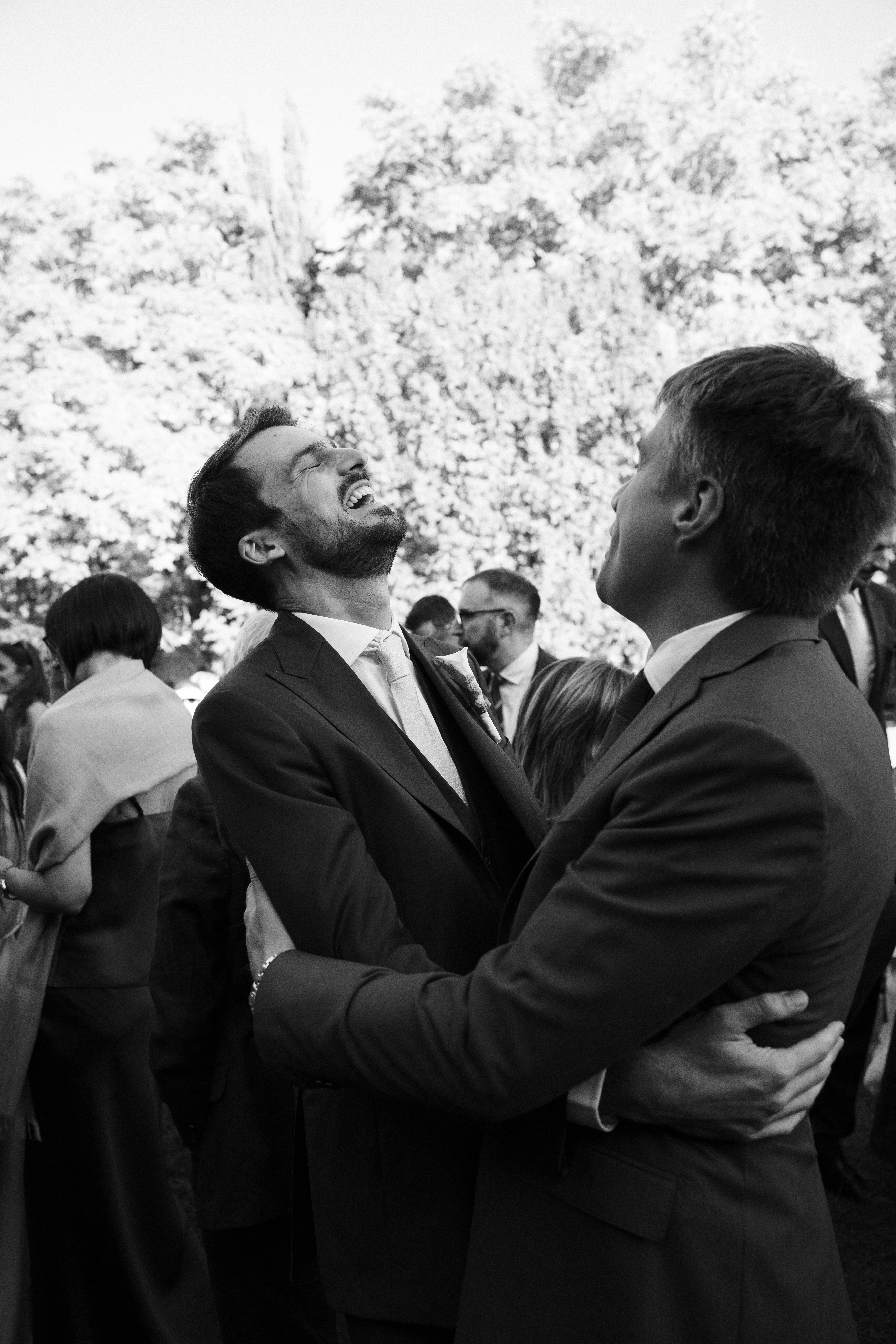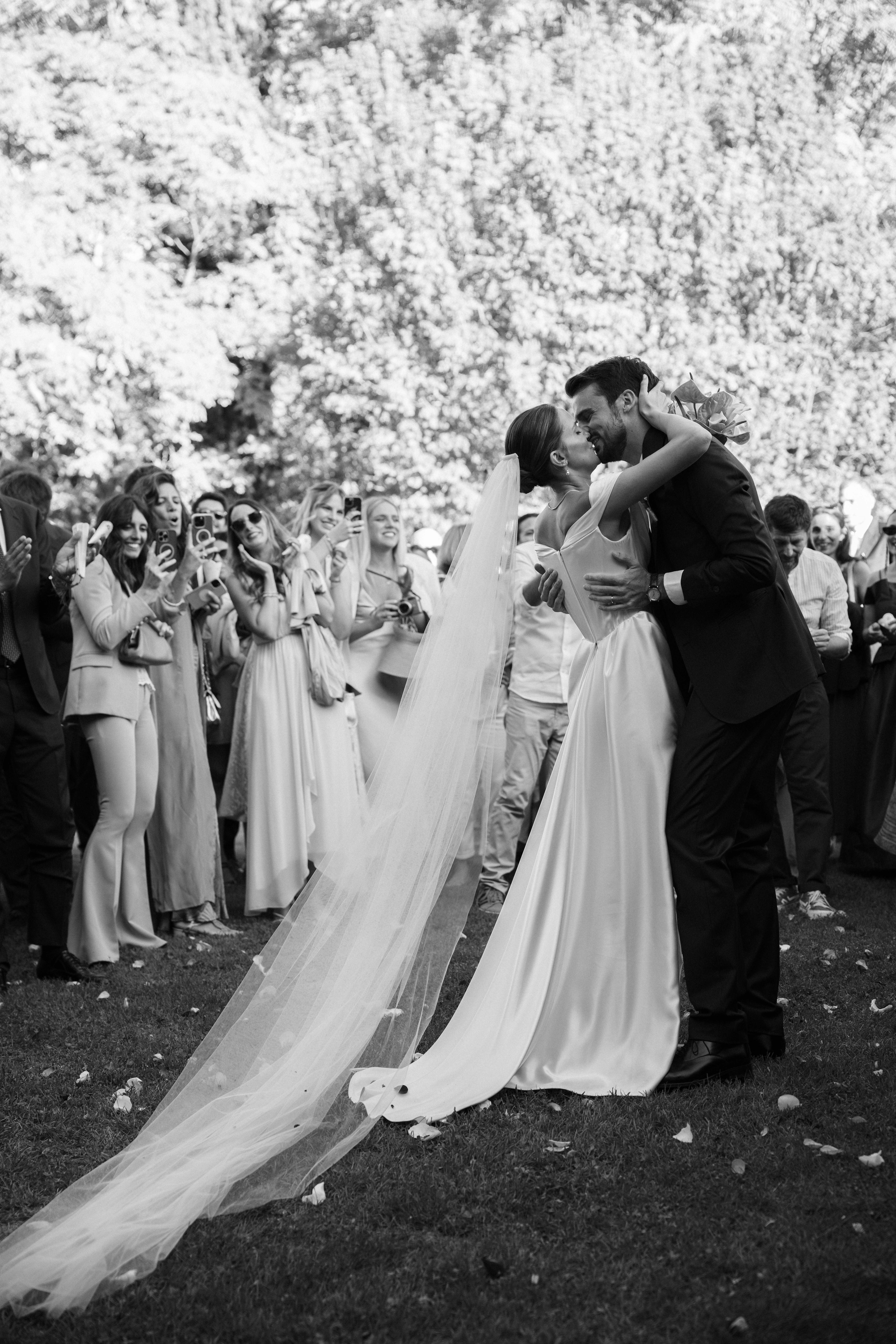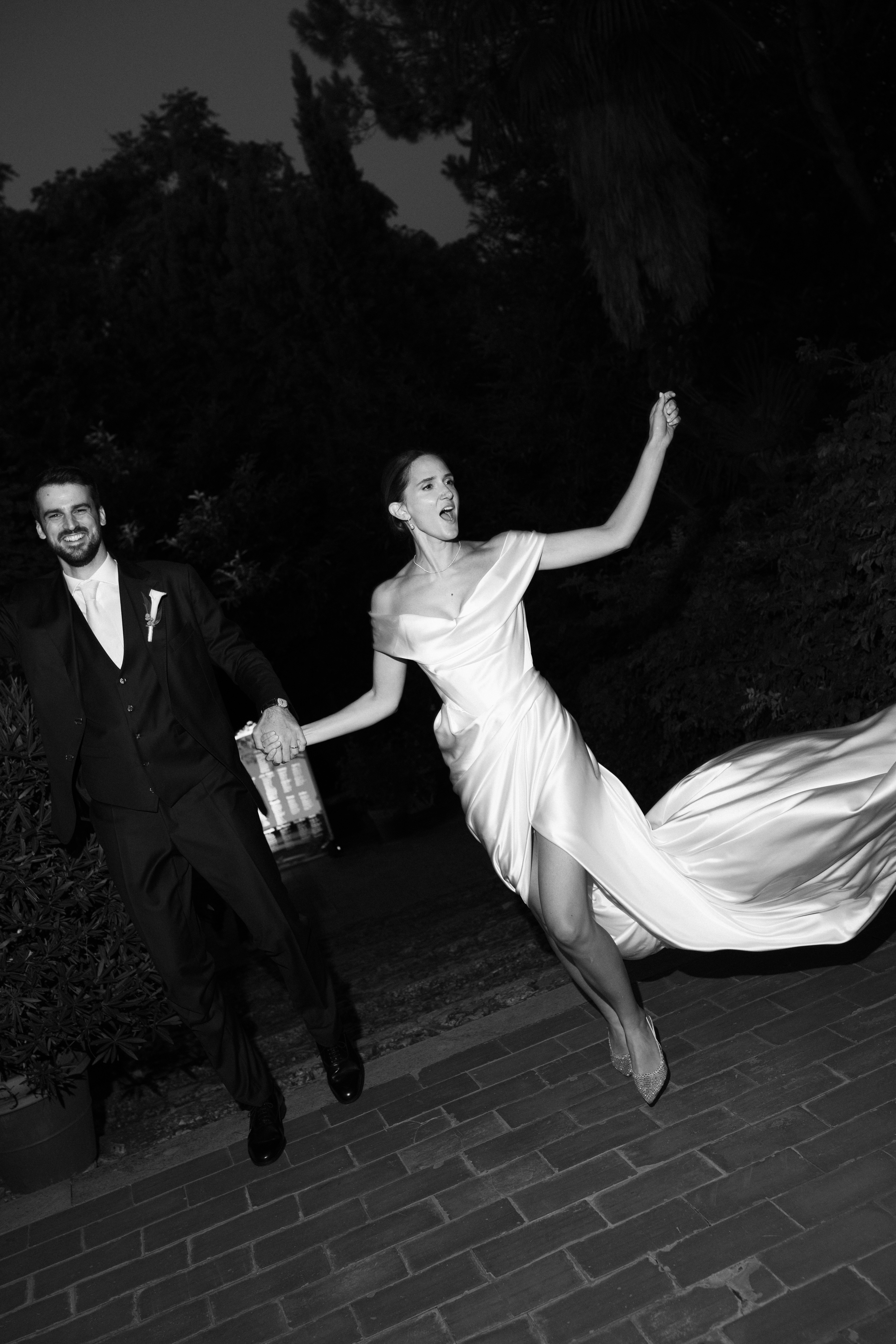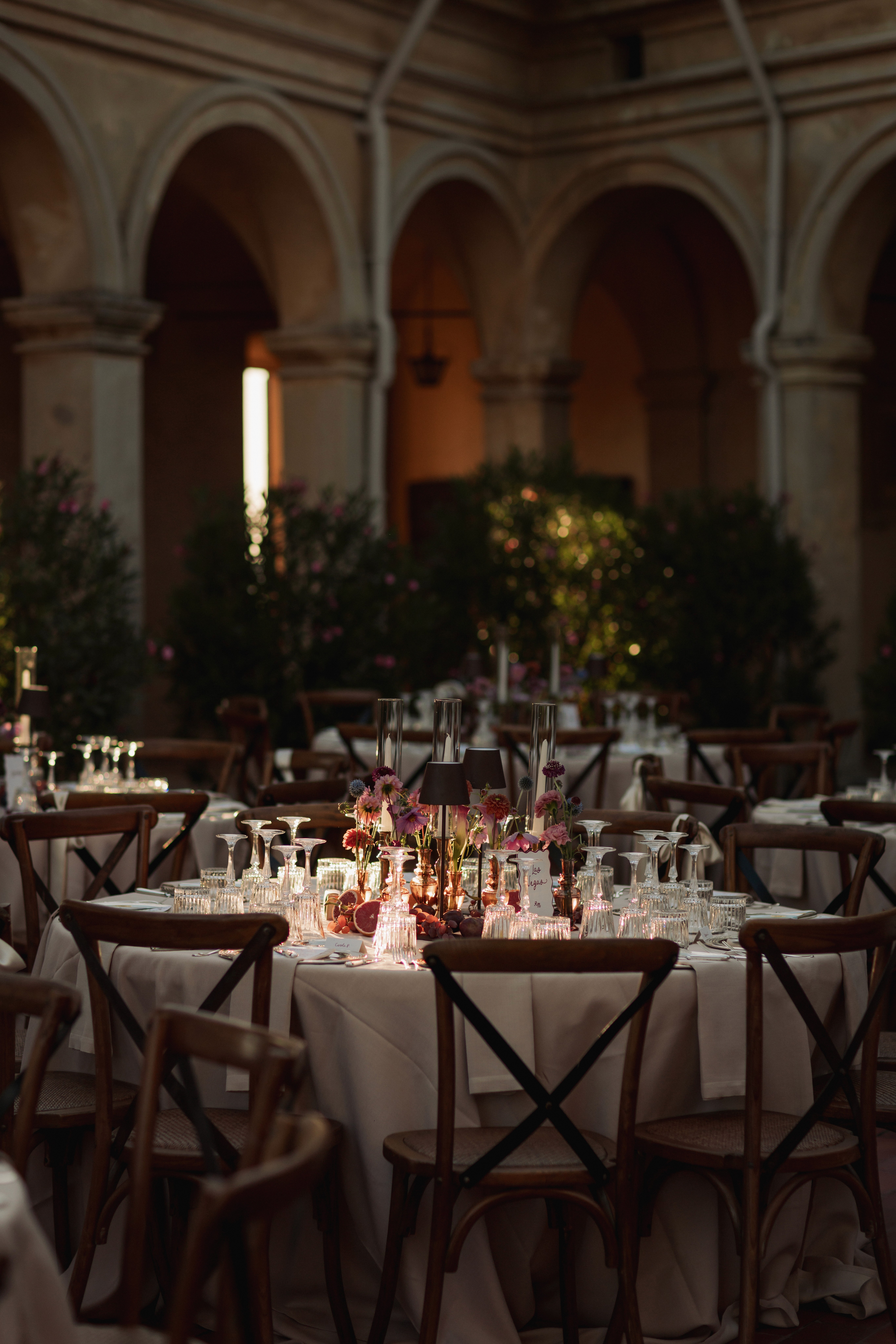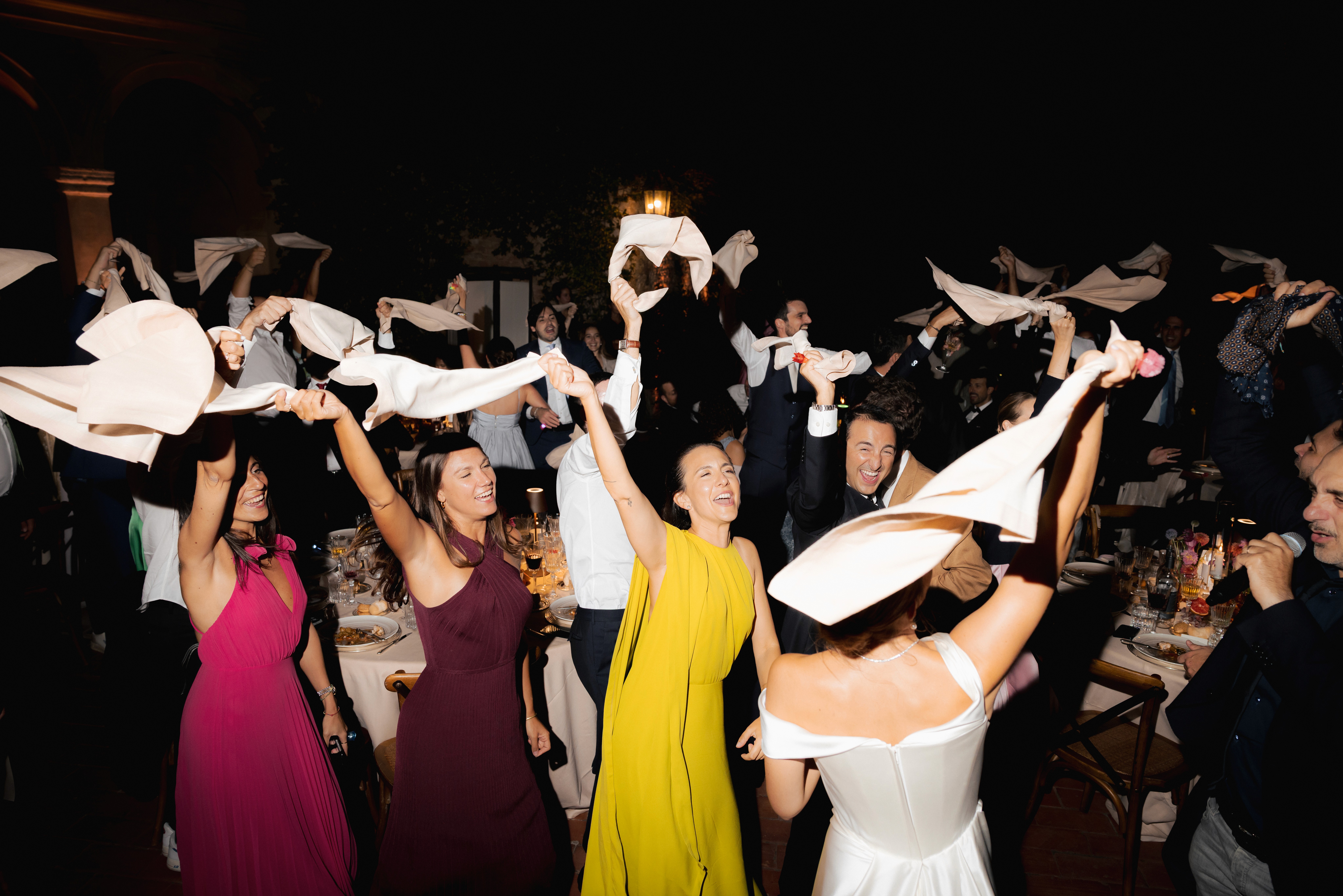 Nelle immagini si avverte la tensione sospesa prima del sì, quella vibrazione sottile che precede l'incontro degli sguardi; poi il respiro si scioglie in sorrisi, abbracci e leggerezza. La cena prende così forma tra particolari curati e una scenografica piramide di champagne con le sue coppe di cristallo che brillano come piccole costellazioni.