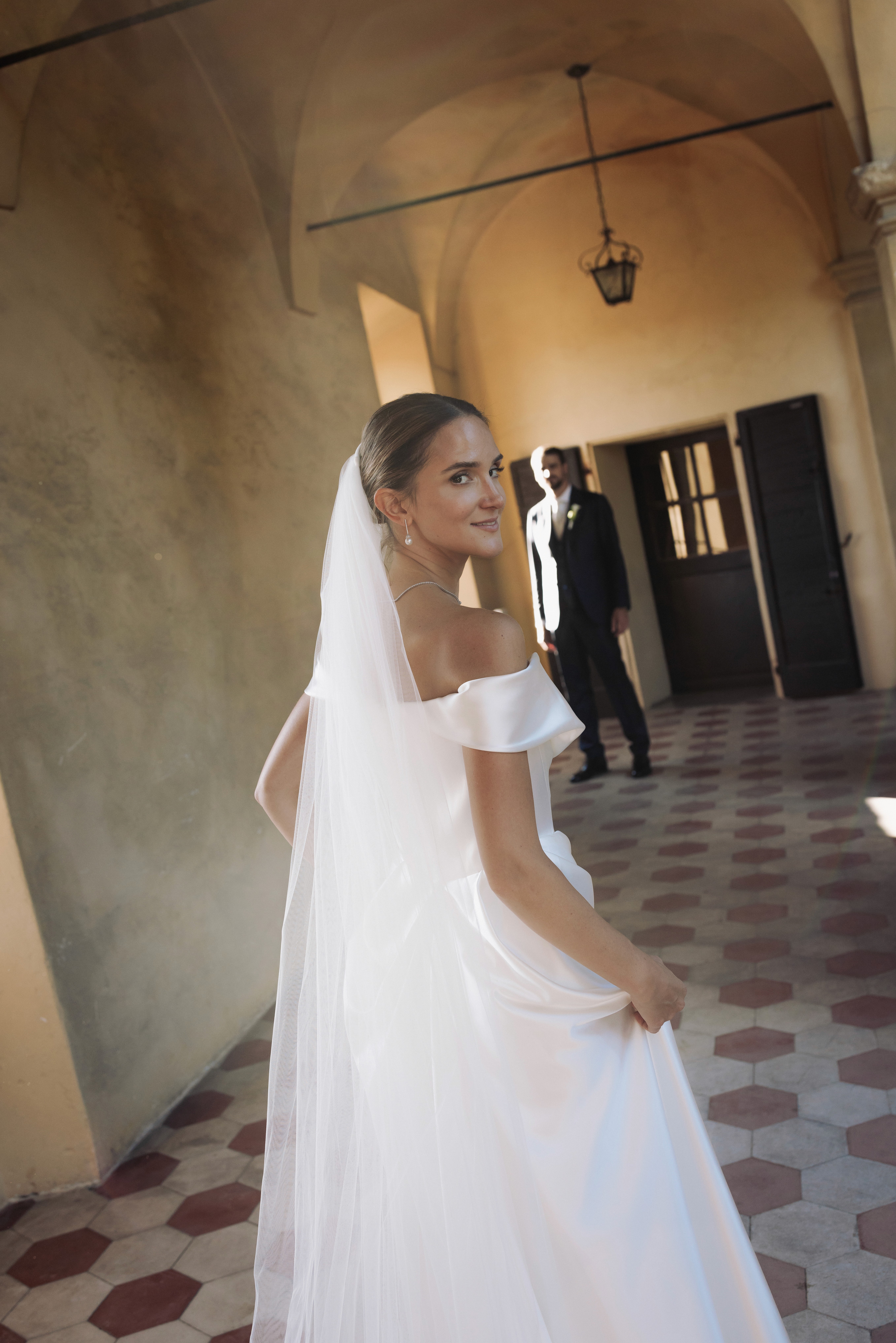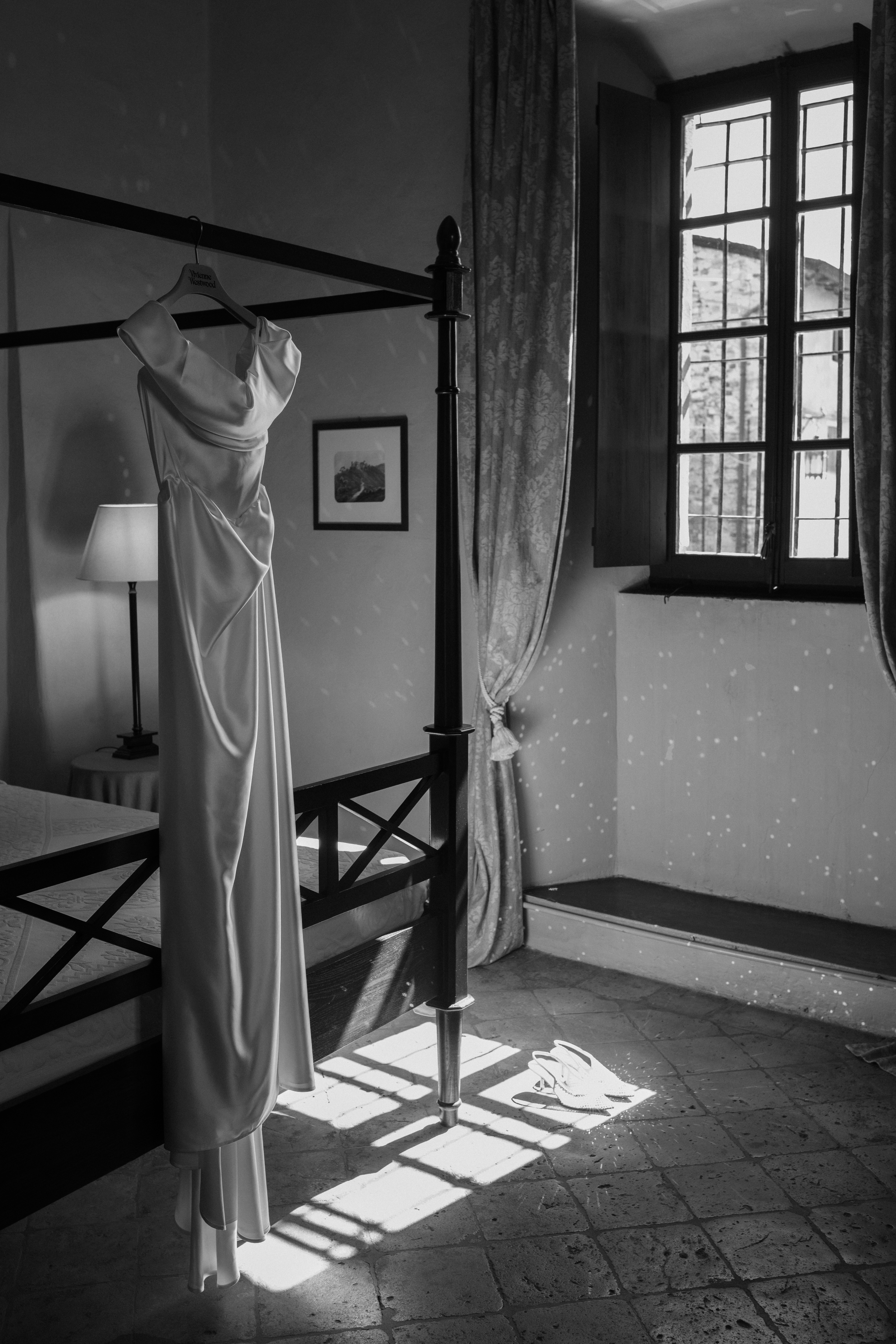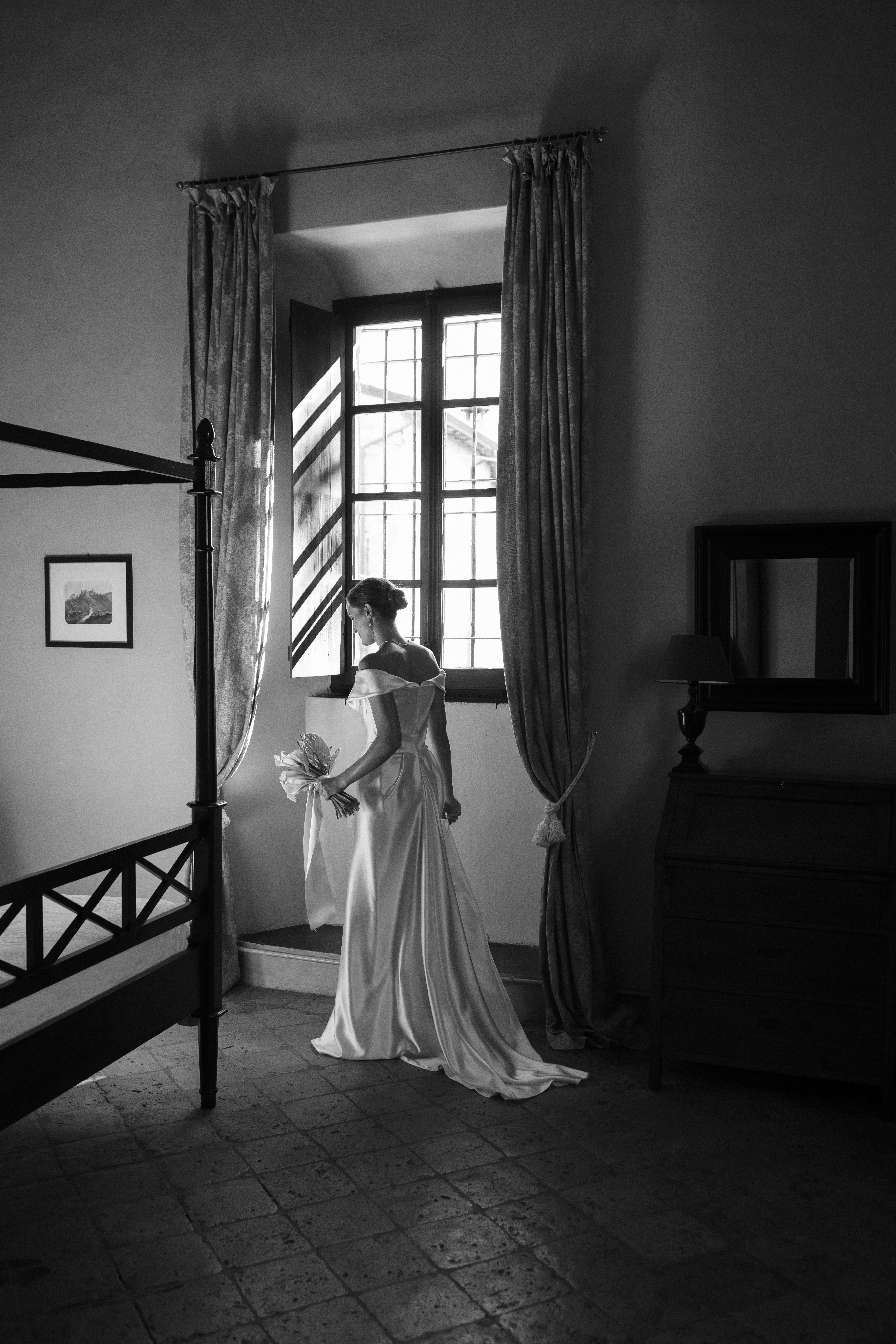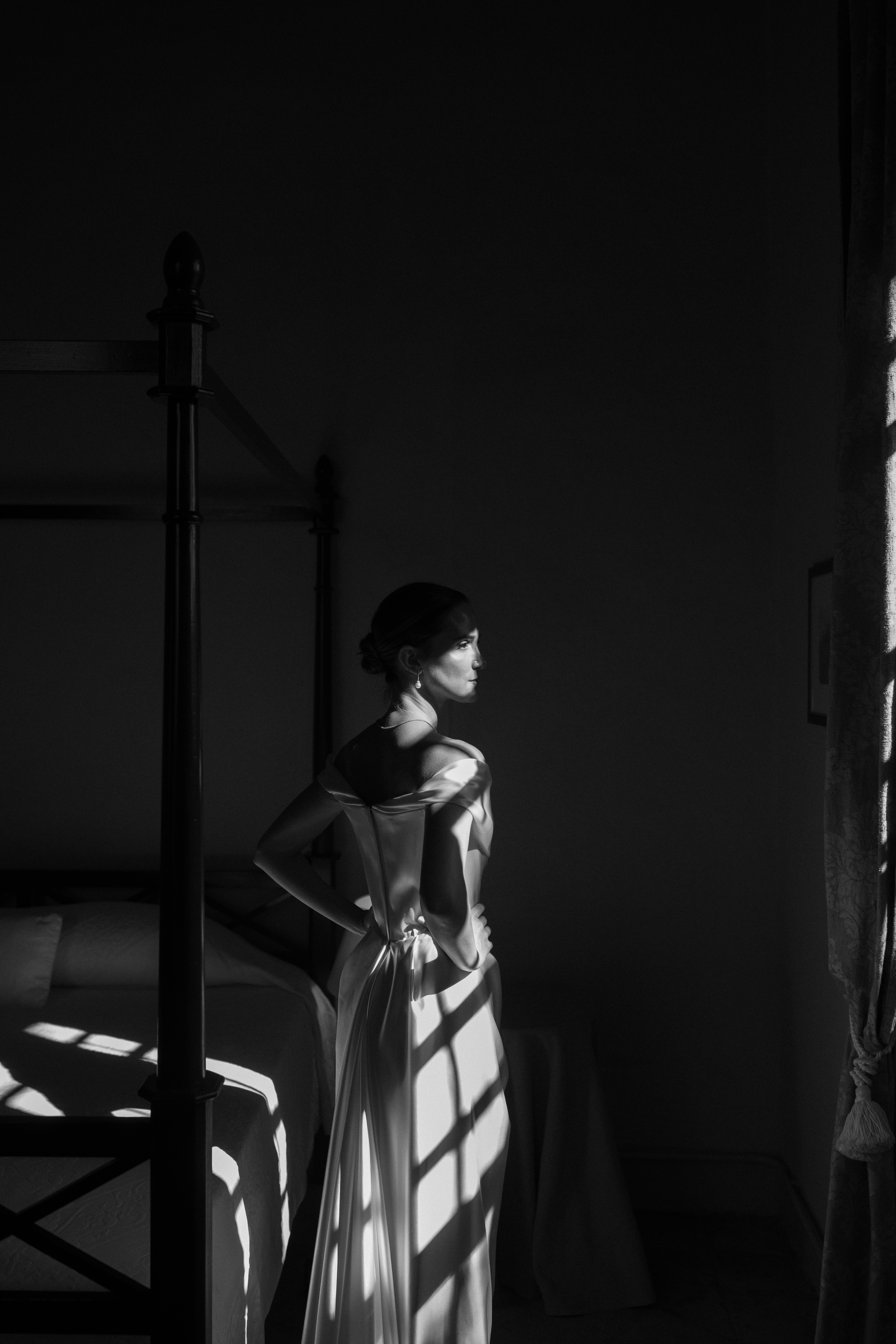 La luce crea equilibrio tra ombra e presenza, scivola tra le stanze e svela i dettagli: la sposa riflessa nello specchio, l'abito che si illumina alla finestra, i chiaroscuri che richiamano la delicatezza dei quadri fiamminghi.