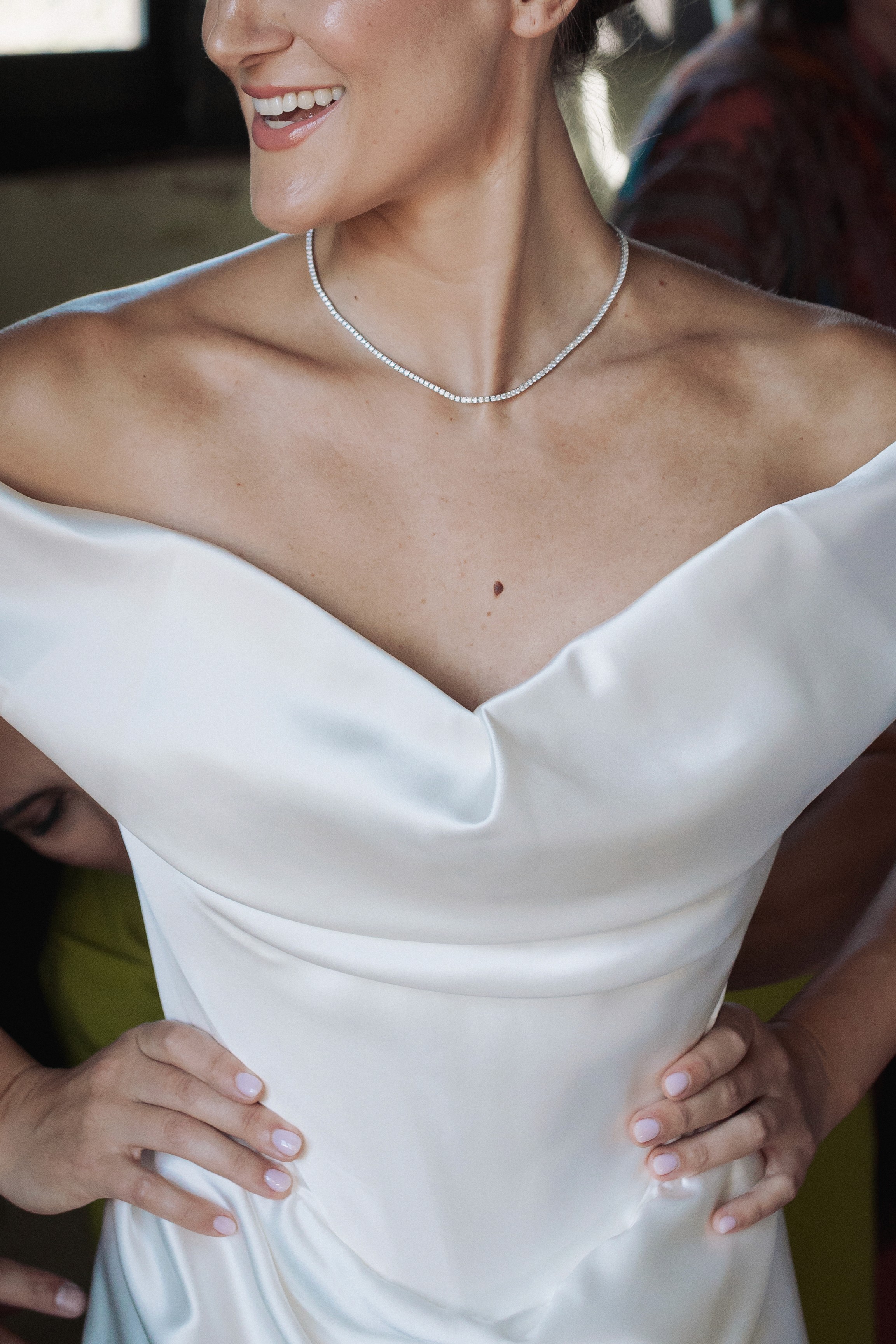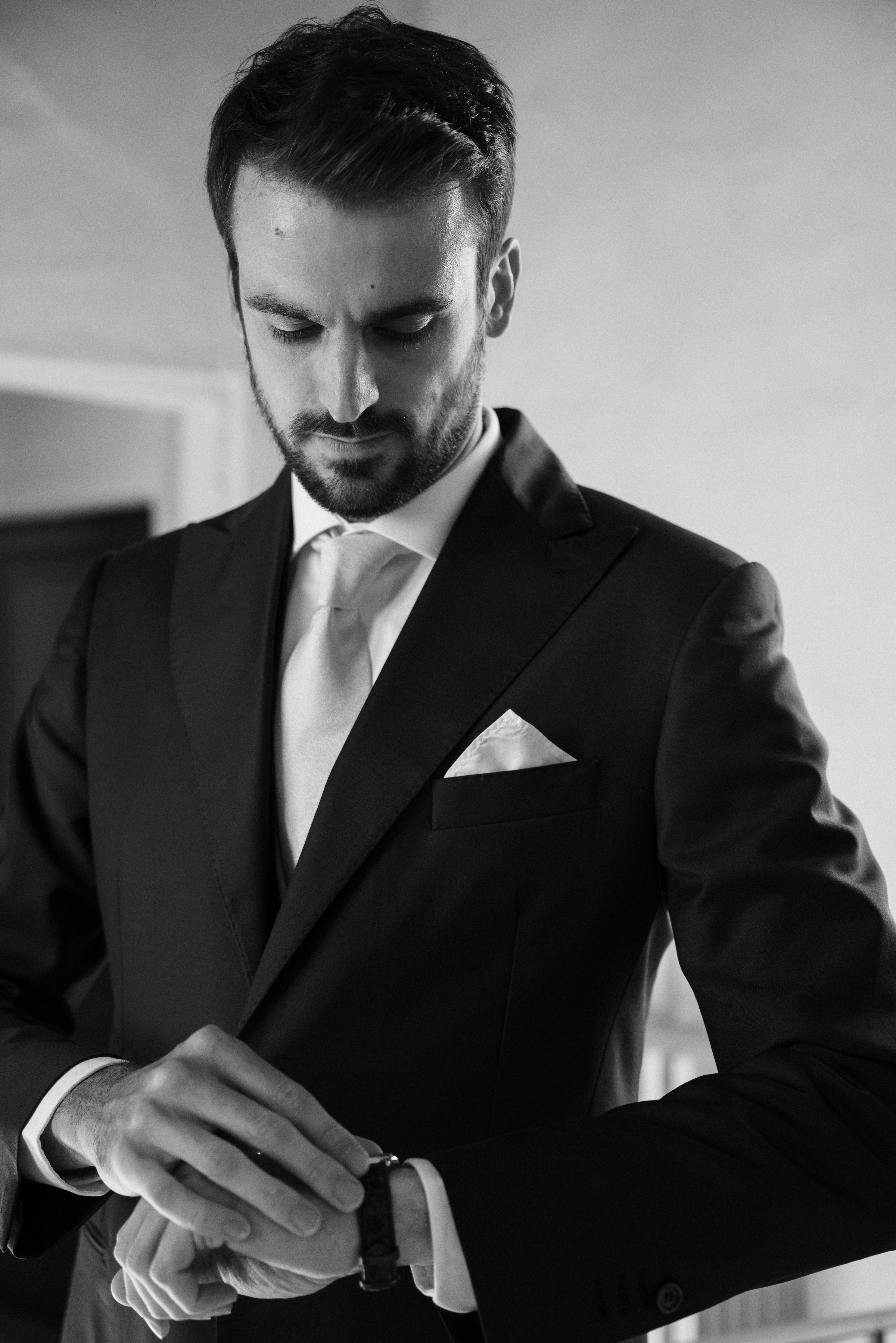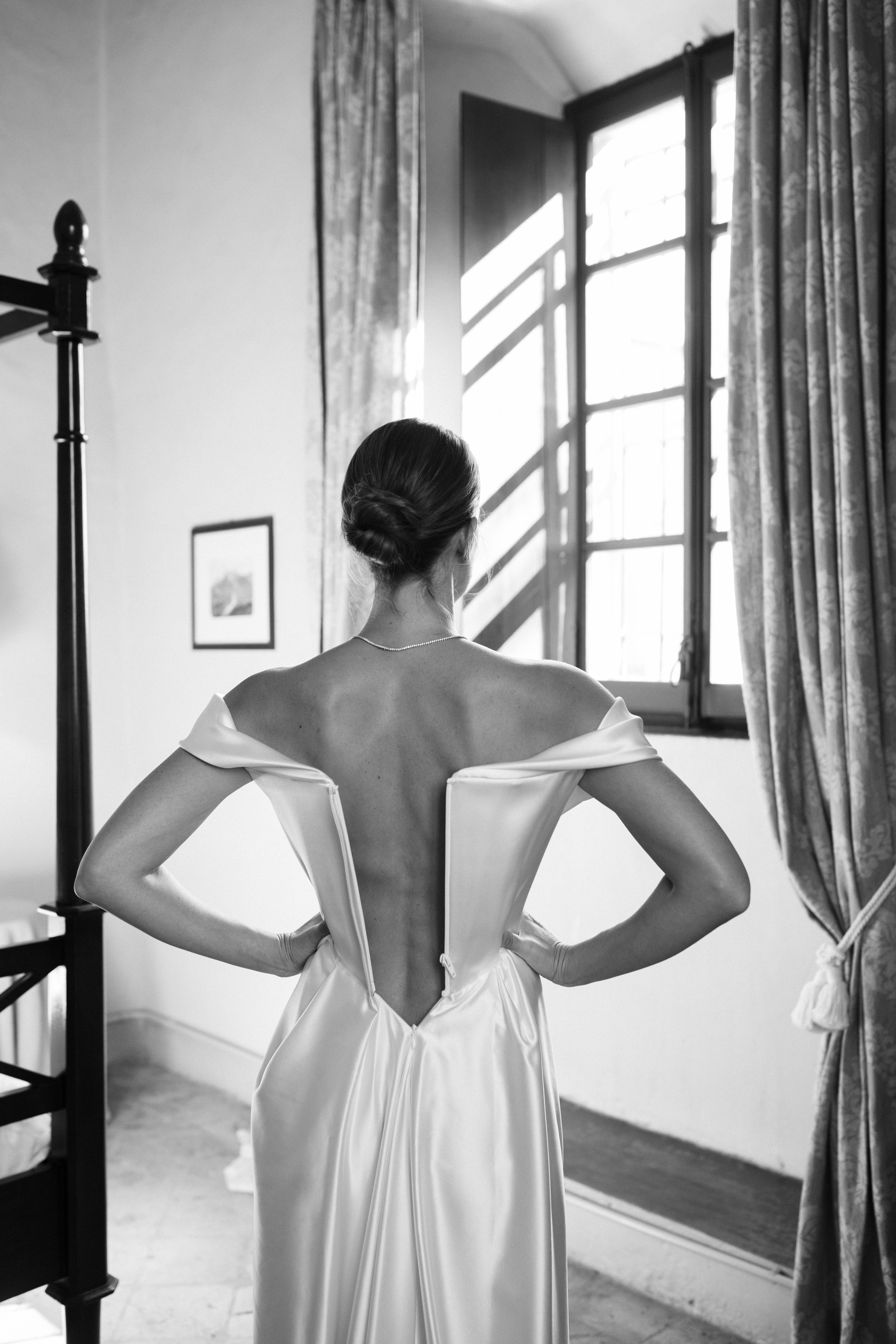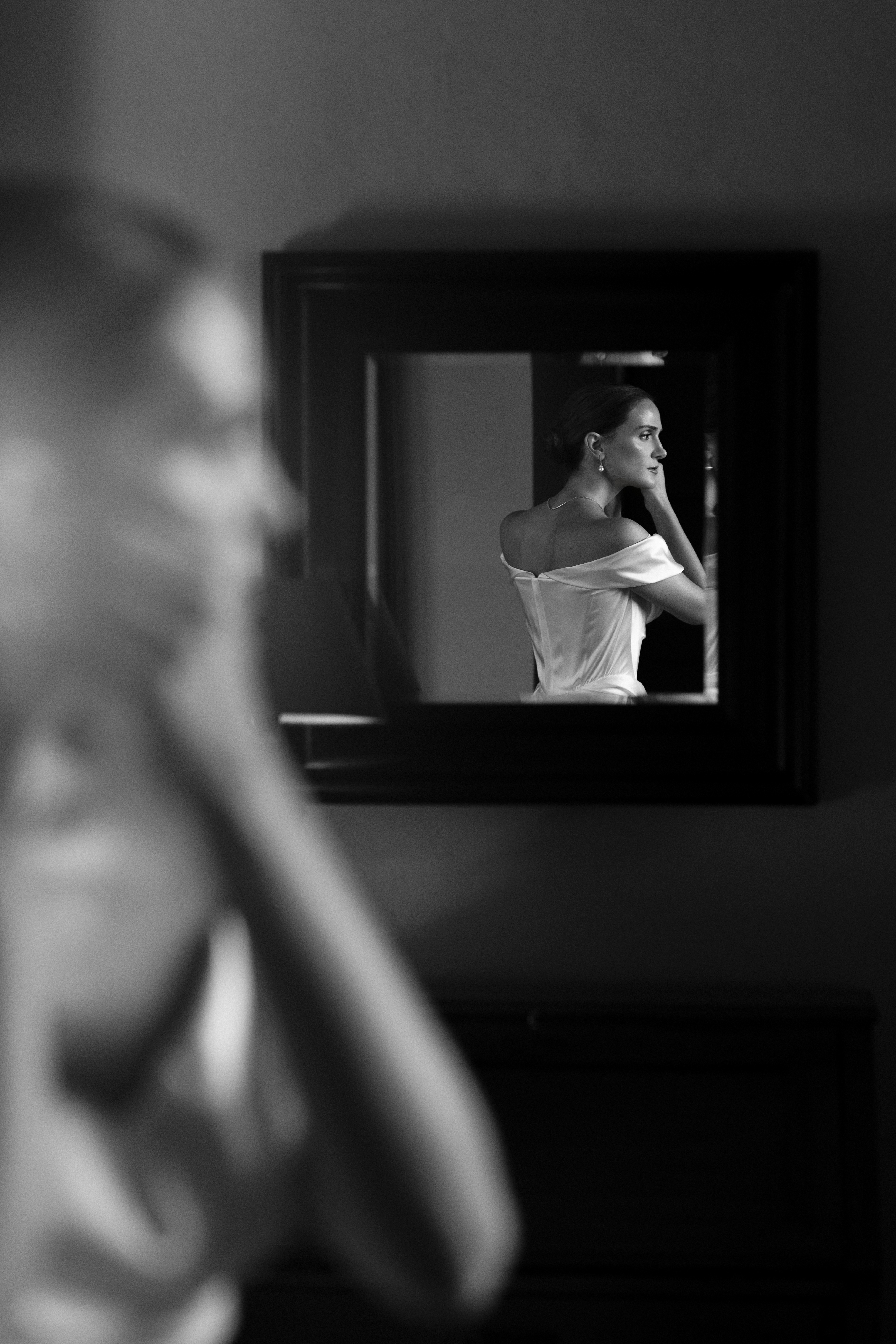 La luce crea equilibrio tra ombra e presenza, scivola tra le stanze e svela i dettagli: la sposa riflessa nello specchio, l'abito che si illumina alla finestra, i chiaroscuri che richiamano la delicatezza dei quadri fiamminghi.
